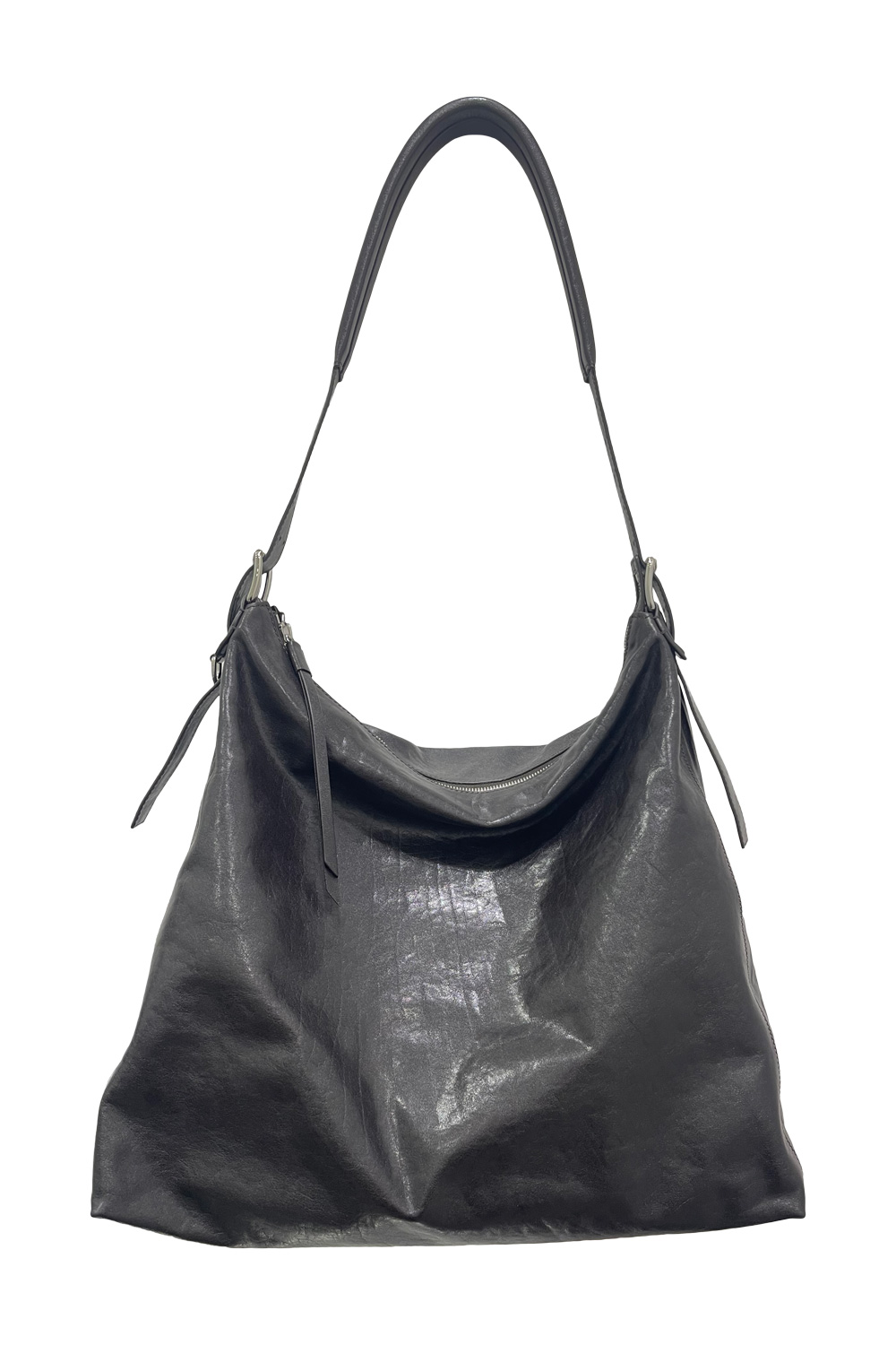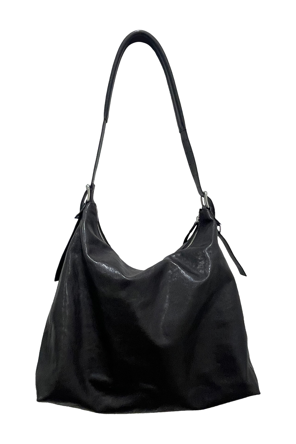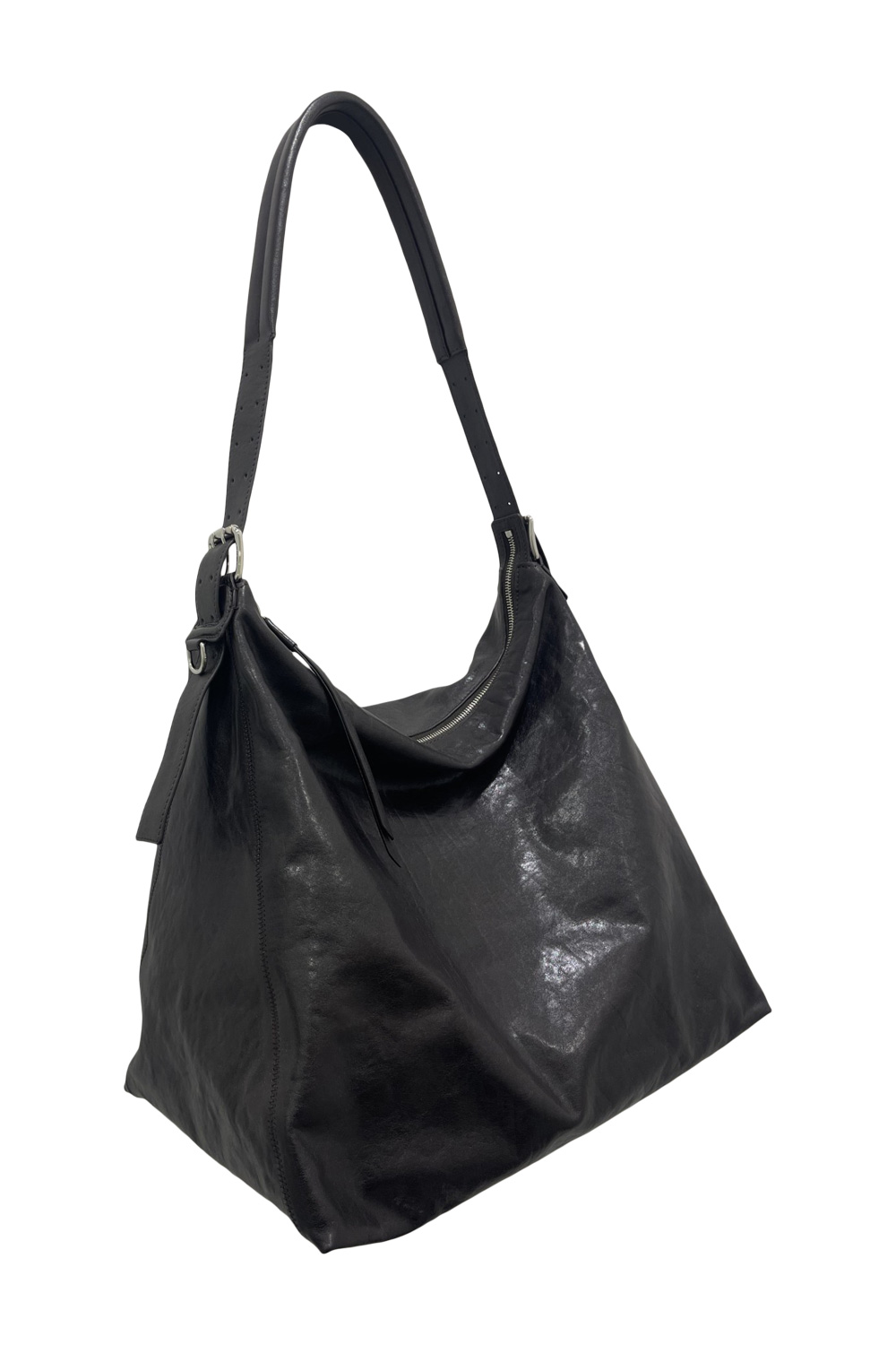 Lemaire belted hobo bag in shiny leather, adjustable strap with stitched padding, , double-pin buckles in silver tone. Length: 27cm / 10,6-in – Width: 34 cm / 13,3-in – Depth: 16 cm / 6,3-in