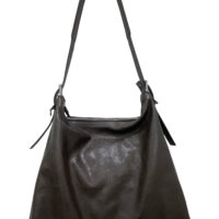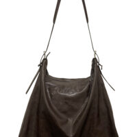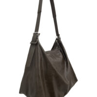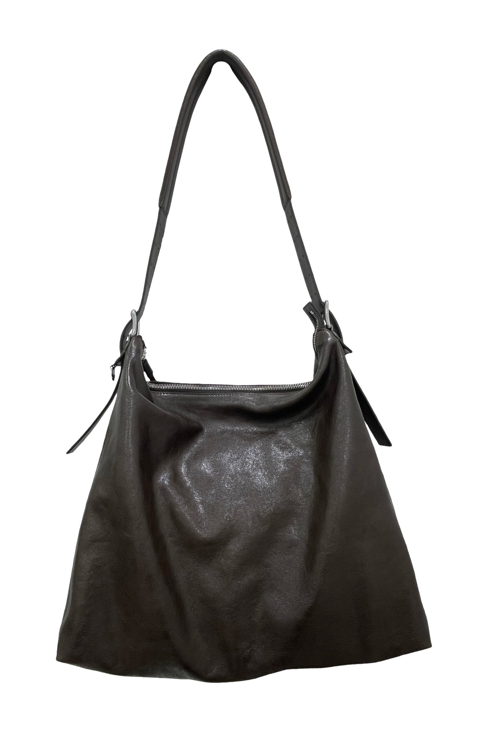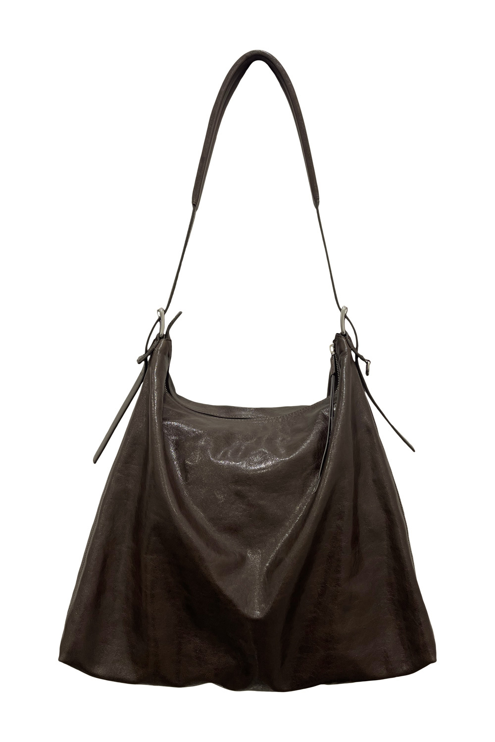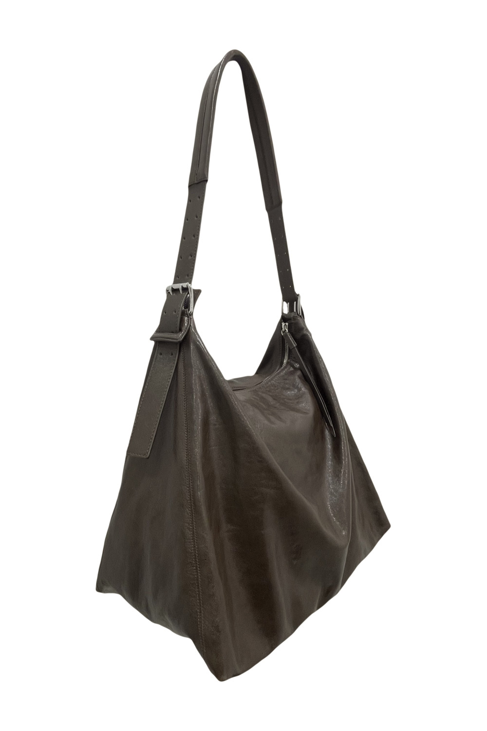 Lemaire belted hobo bag in shiny leather, adjustable strap with stitched padding, , double-pin buckles in silver tone.