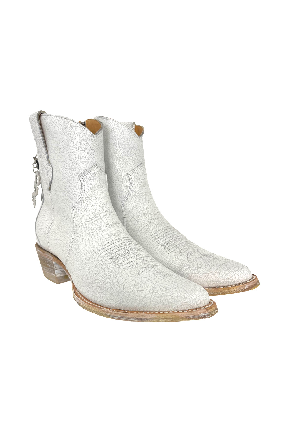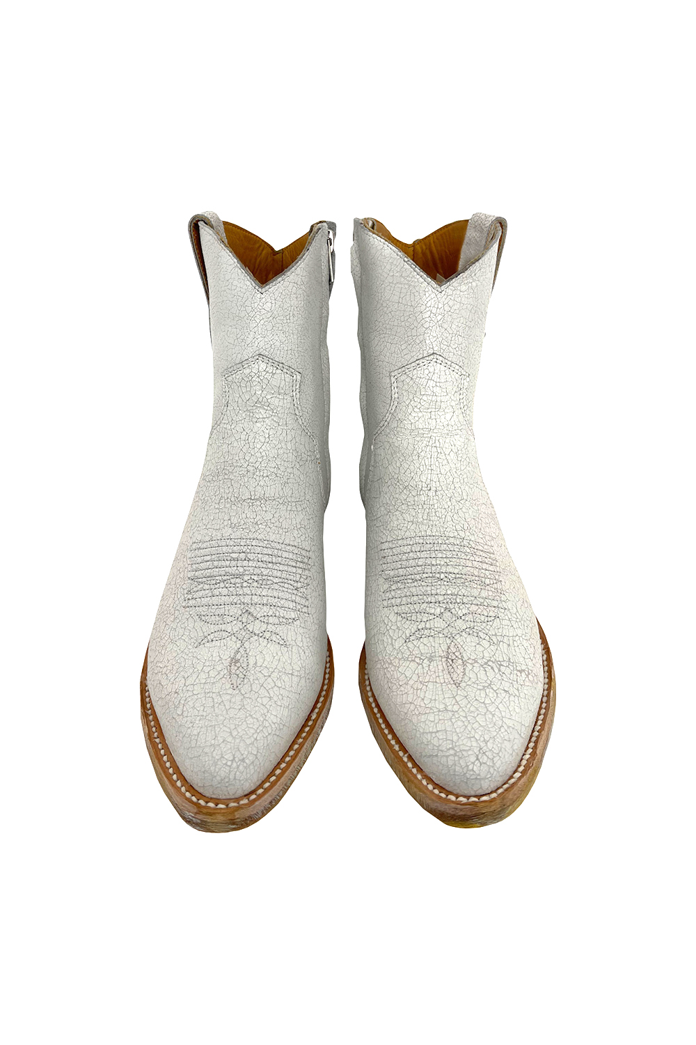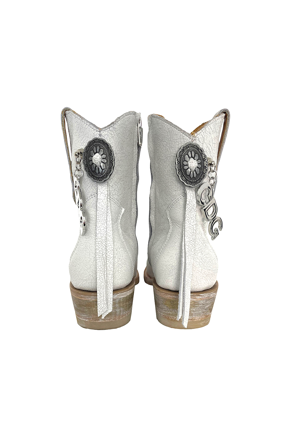 Comme Des Garçons boots in collaboration with Mexicana, aged effect, charm detail with silver logo.
