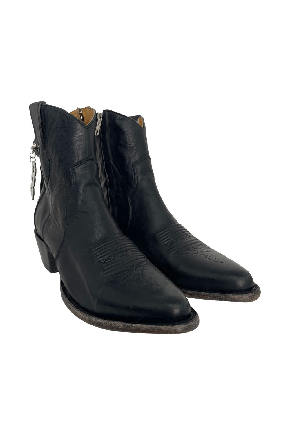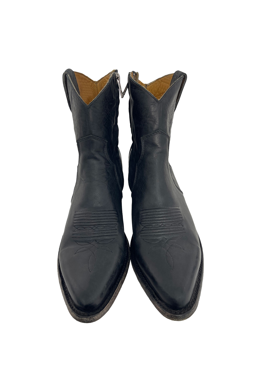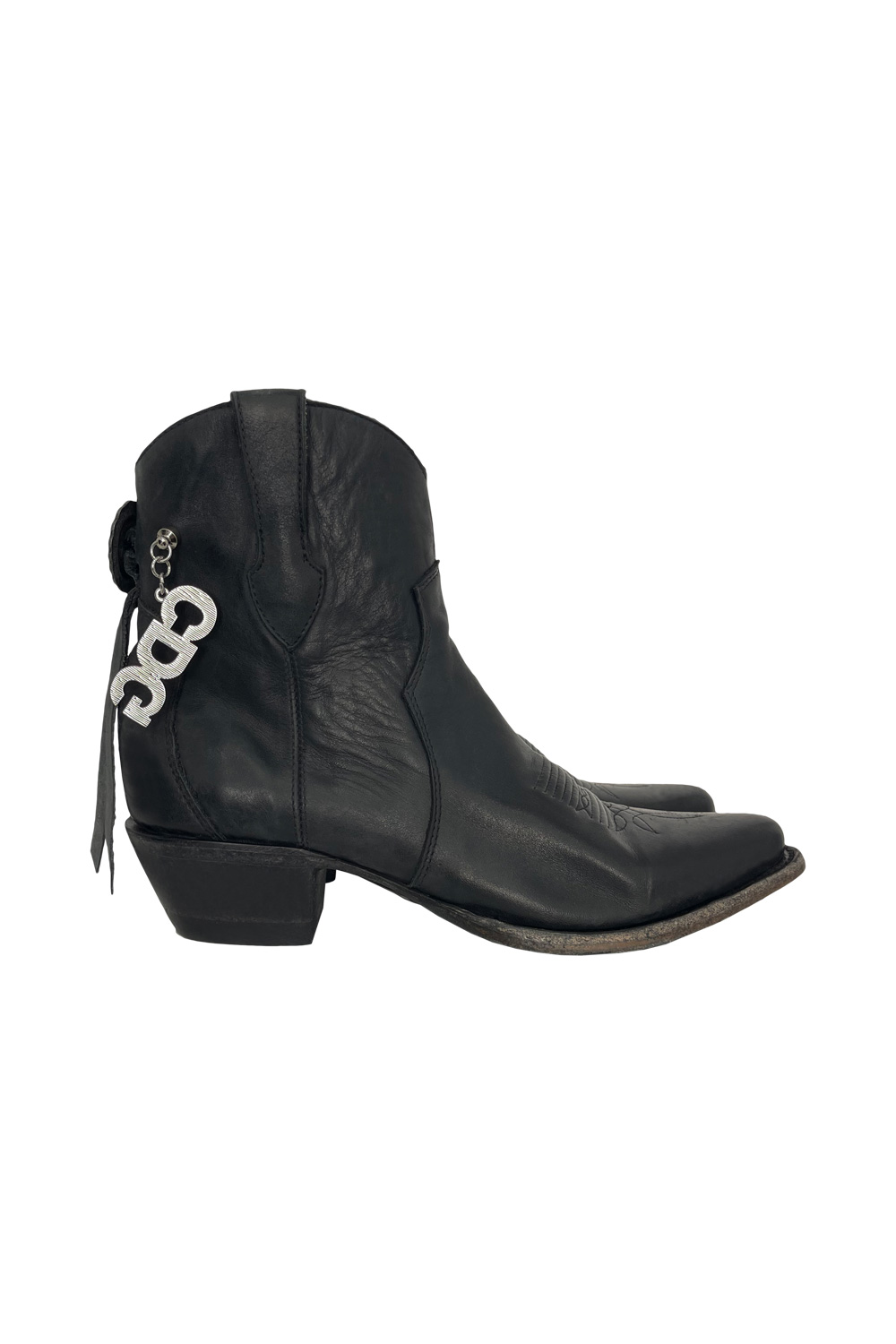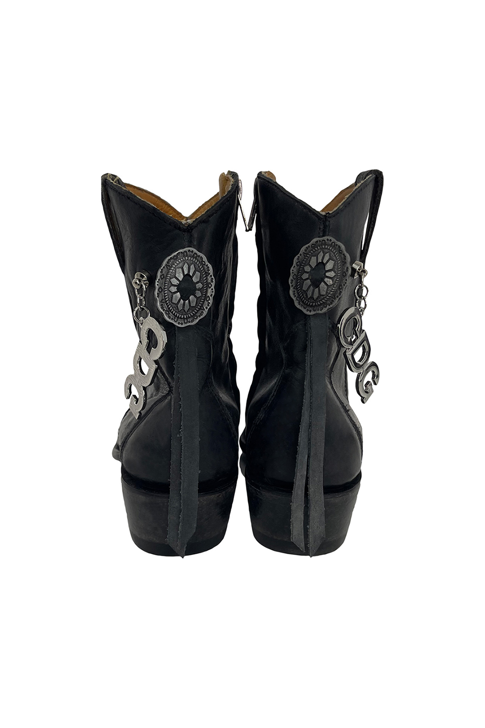 Comme Des Garçons boots in collaboration with Mexicana, aged effect, charm detail with silver logo.