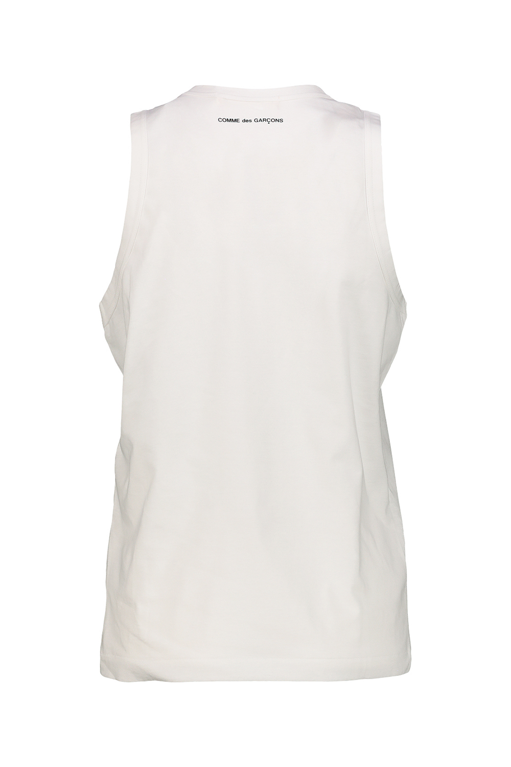 Comme des Garçons cotton tank top with “Comme des Garçons” print under the neck on the back.