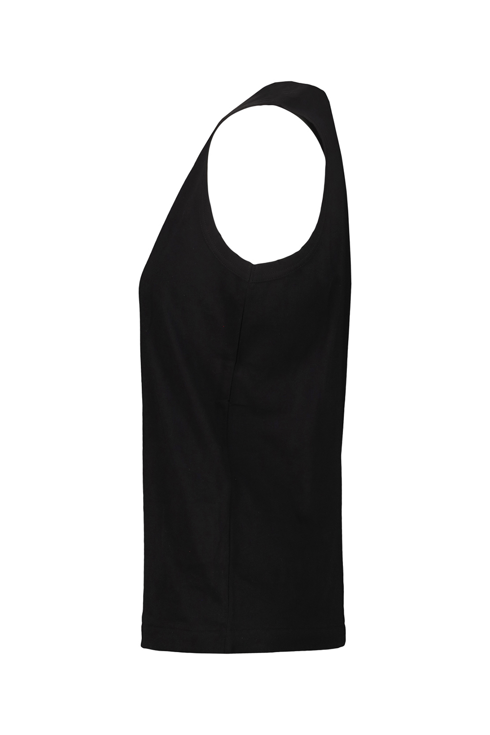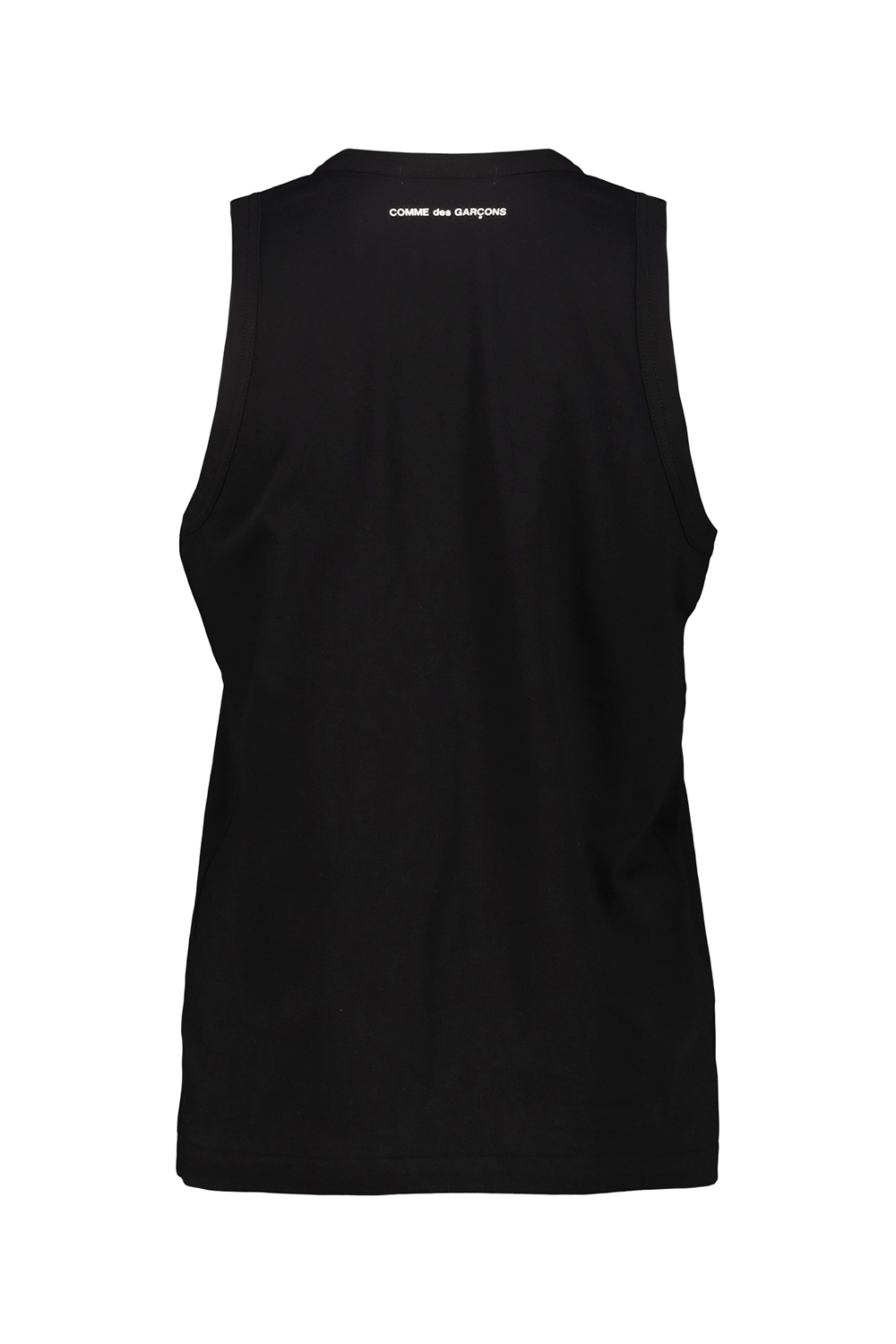 Comme des Garçons cotton tank top with “Comme des Garçons” print under the neck on the back.