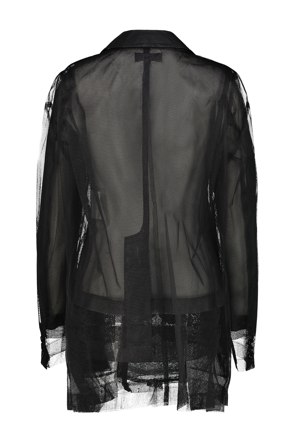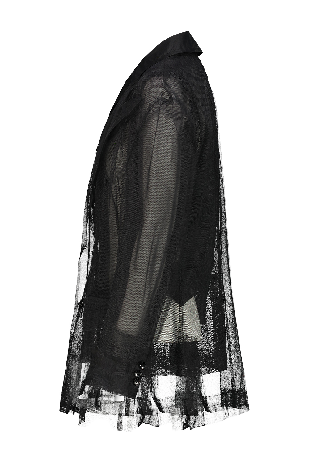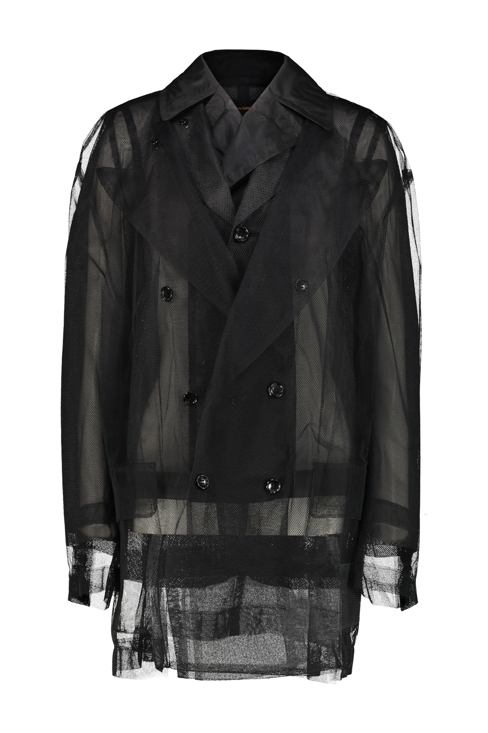 Comme des Garçons double-breasted caban composed of three overlapping jackets of different models, fabrics and transparency.