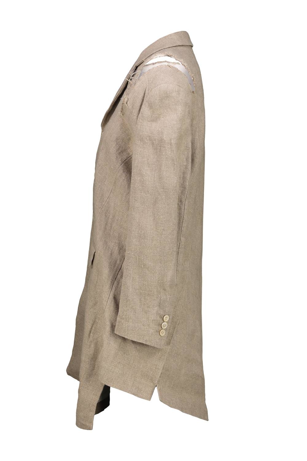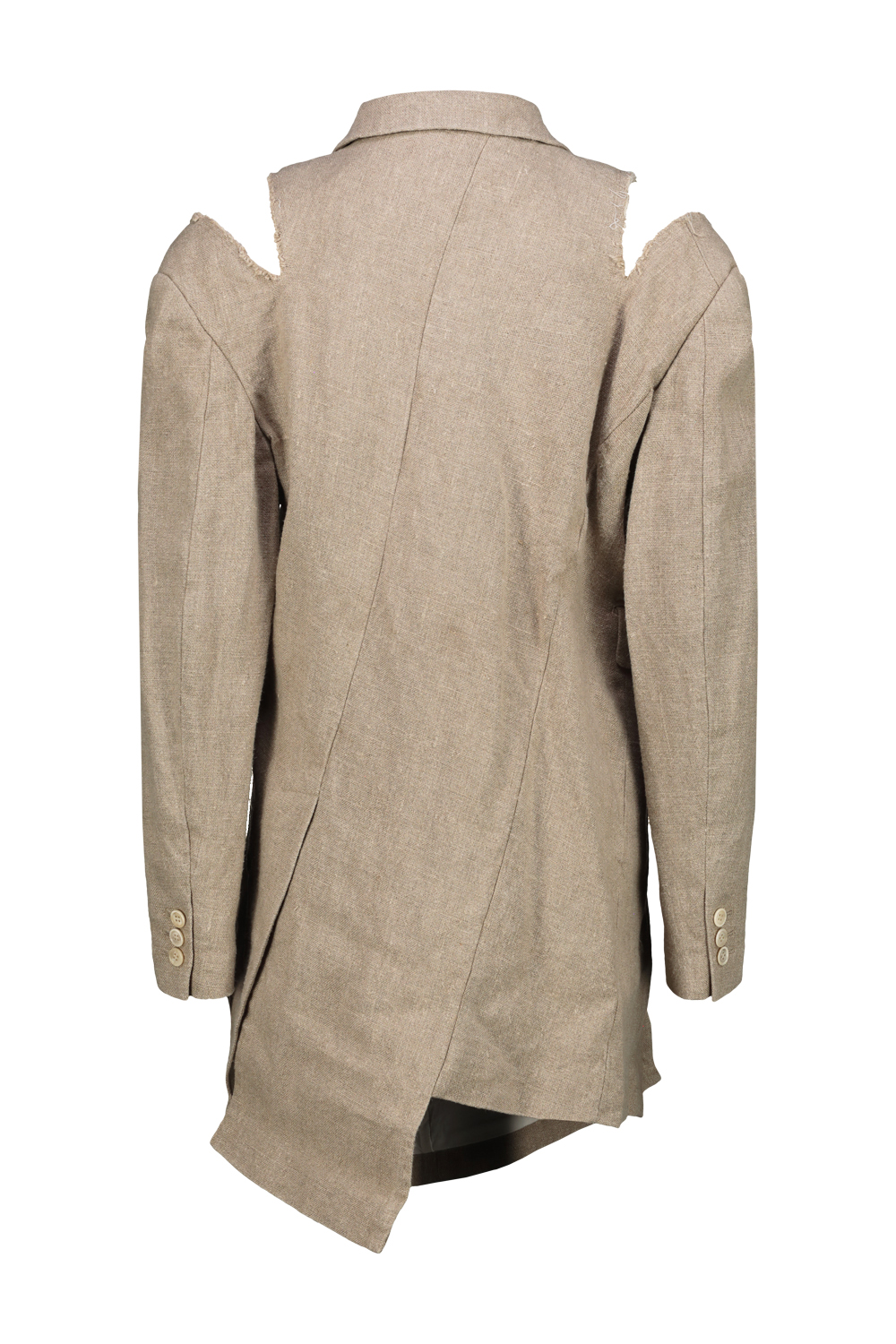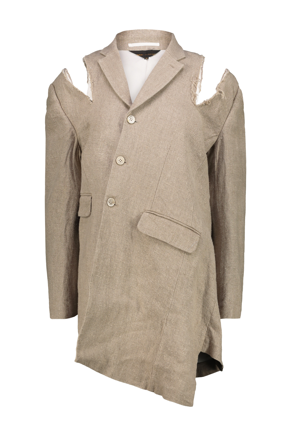 Comme des Garçons unstructured linen blazer with raw-cut shoulder slit detail, classic asymmetrical cut that wraps around the body.