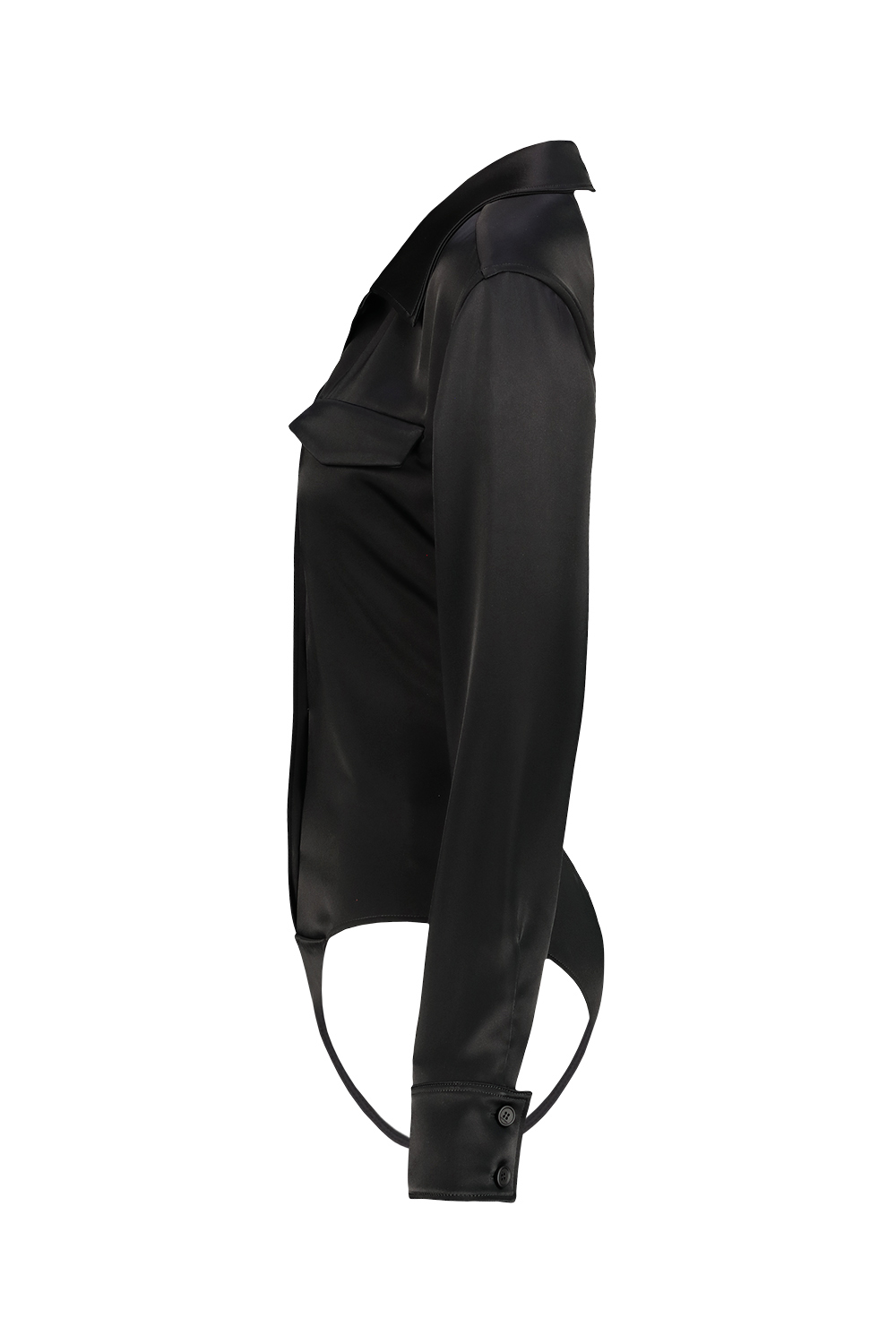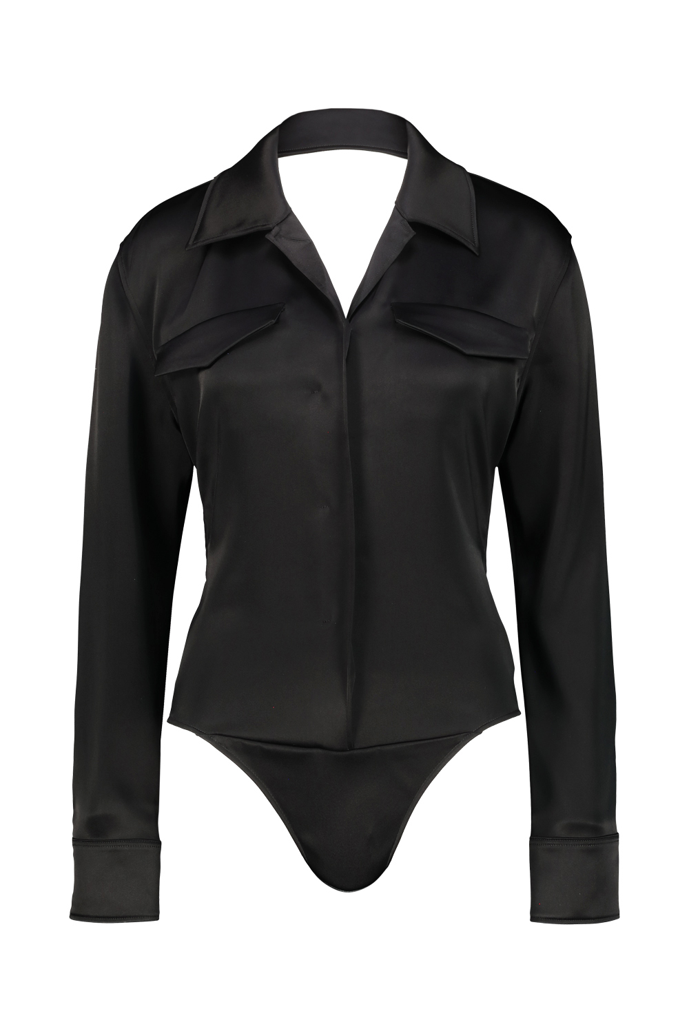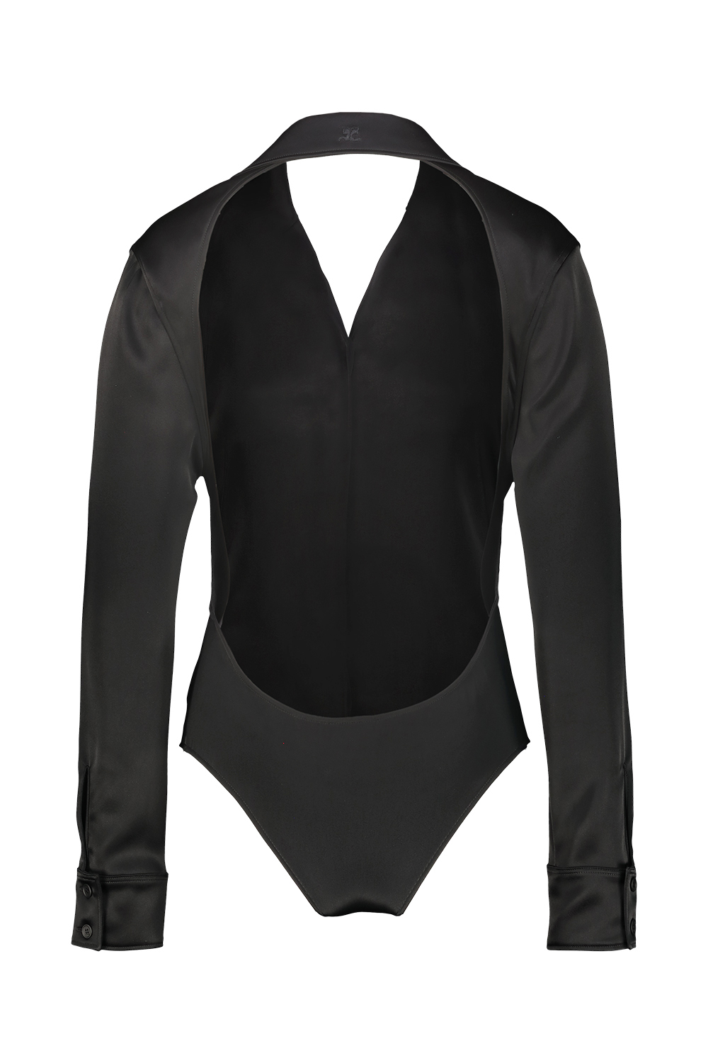 Courrèges Backless satin button-down shirt bodysuit, two front pockets, embroidered logo on back collar.