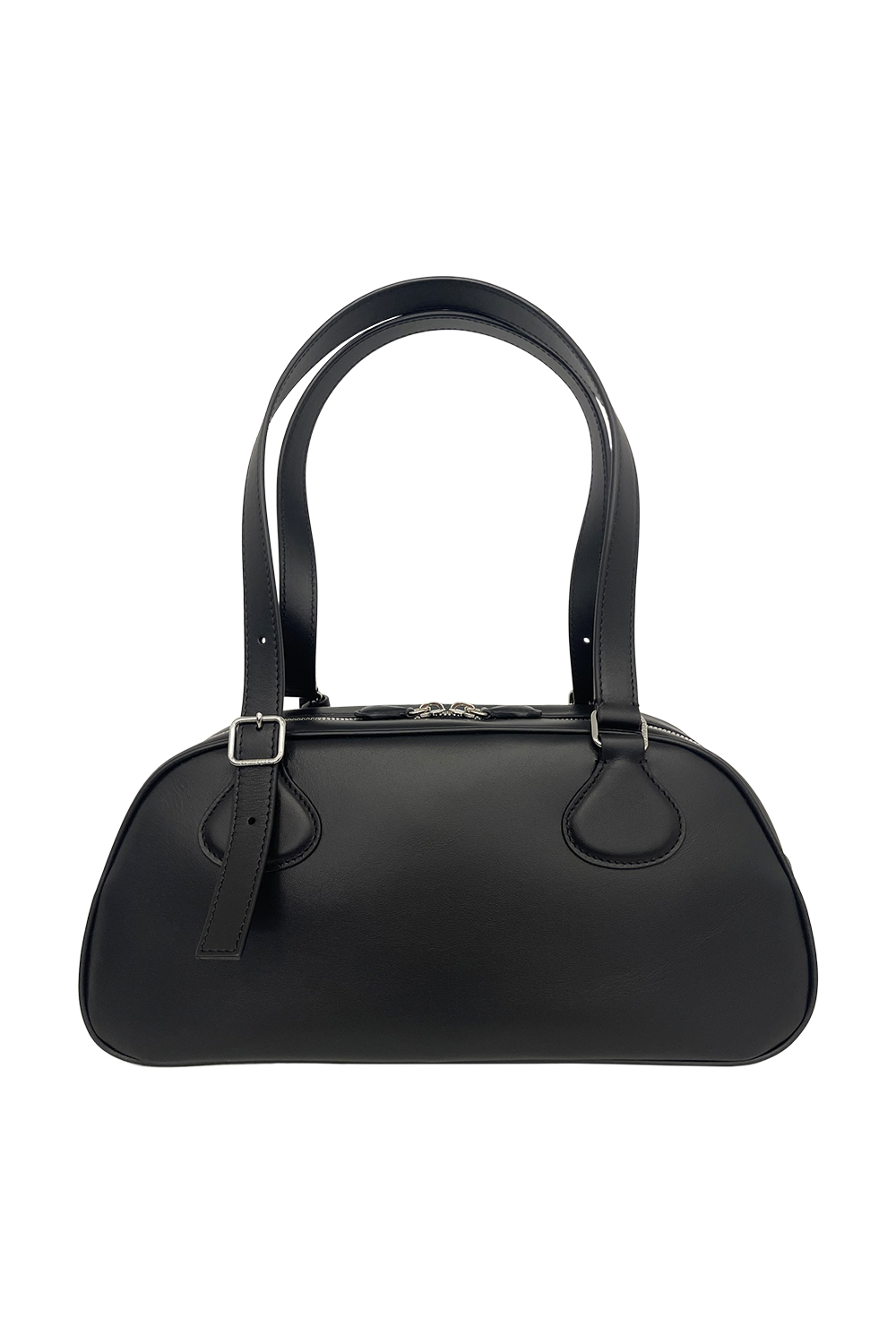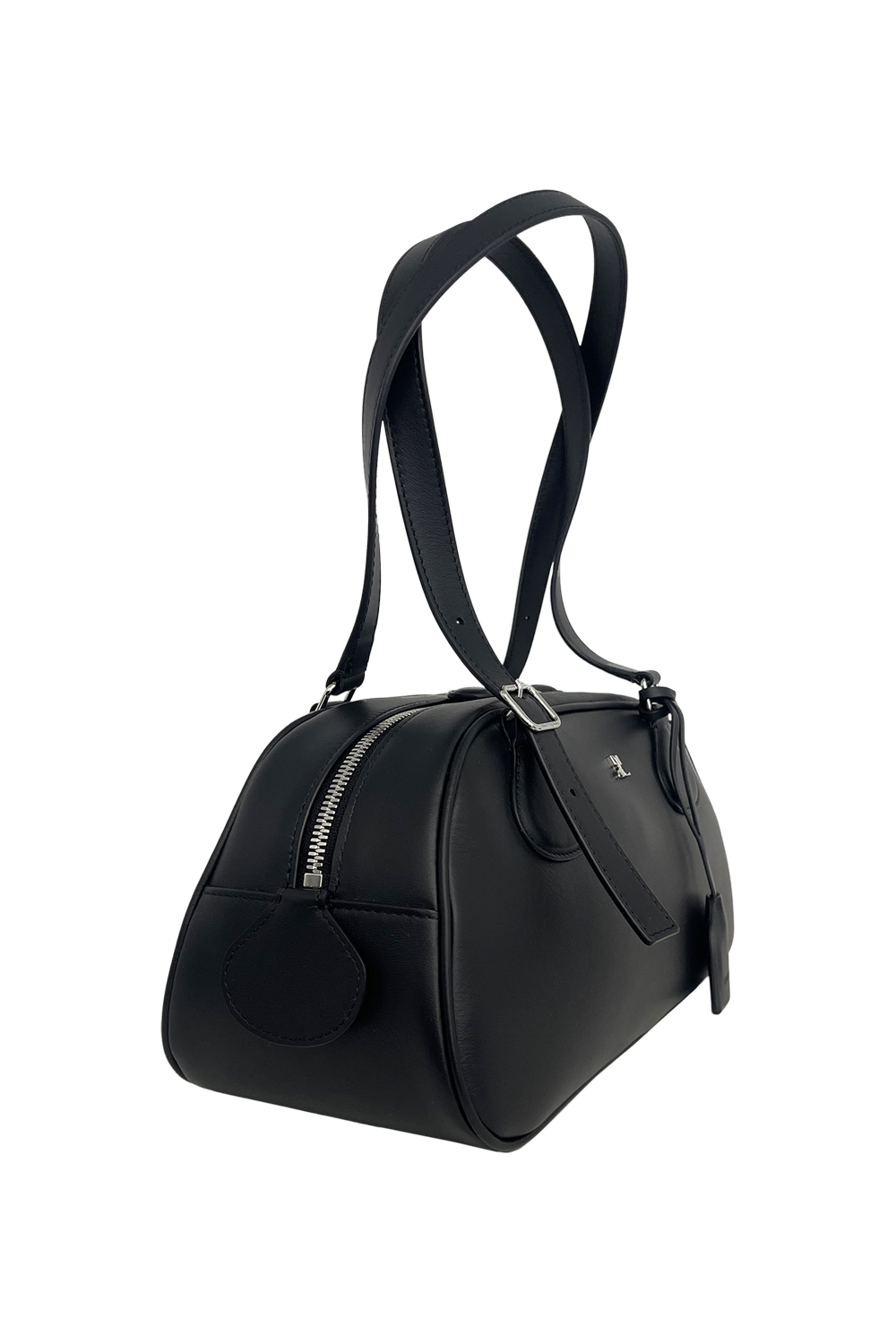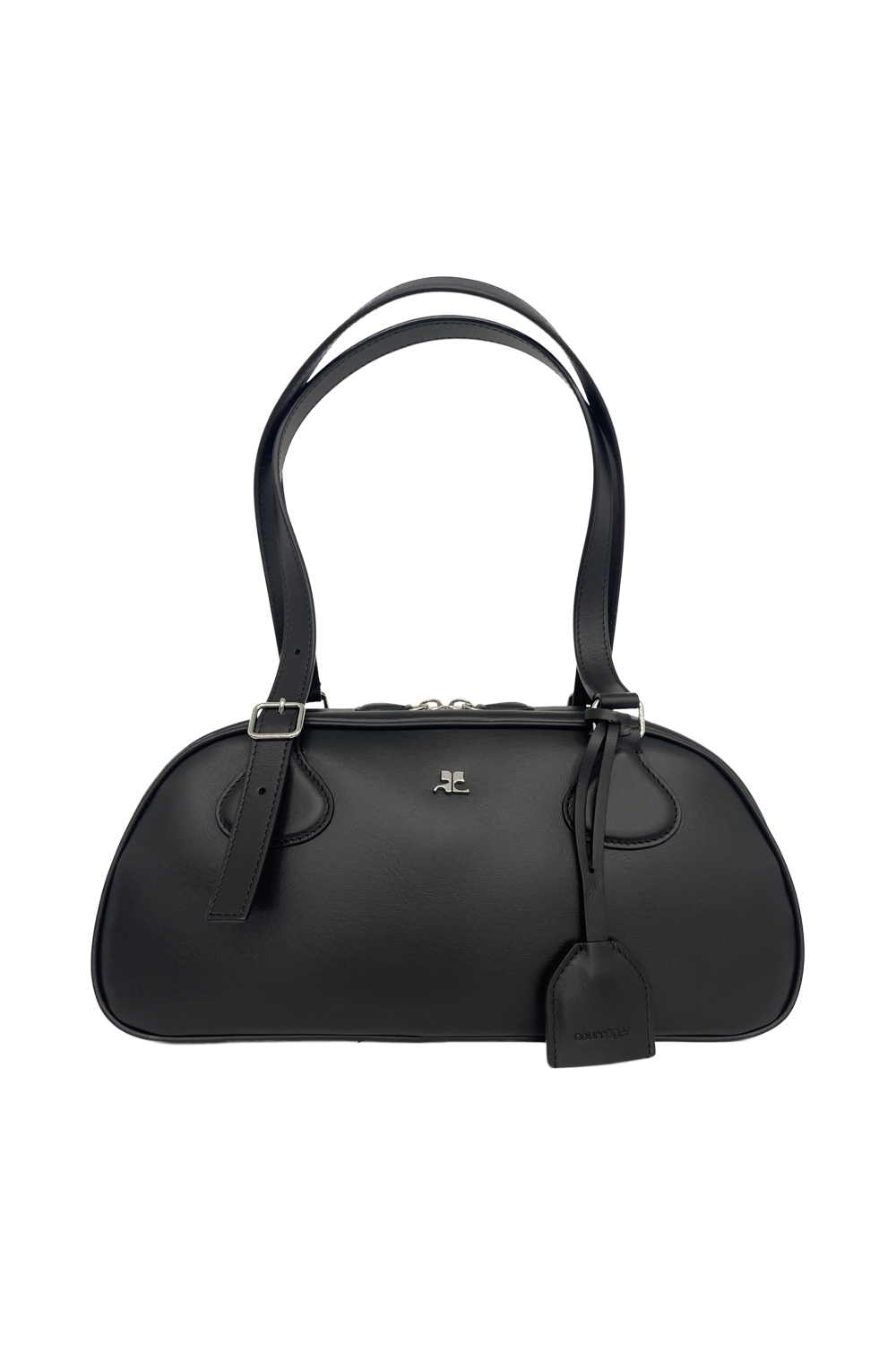Courrèges Friday medium leather bag, double-slider zip closure, adjustable handles with logoed metal buckle, central silver-colored metal logo.