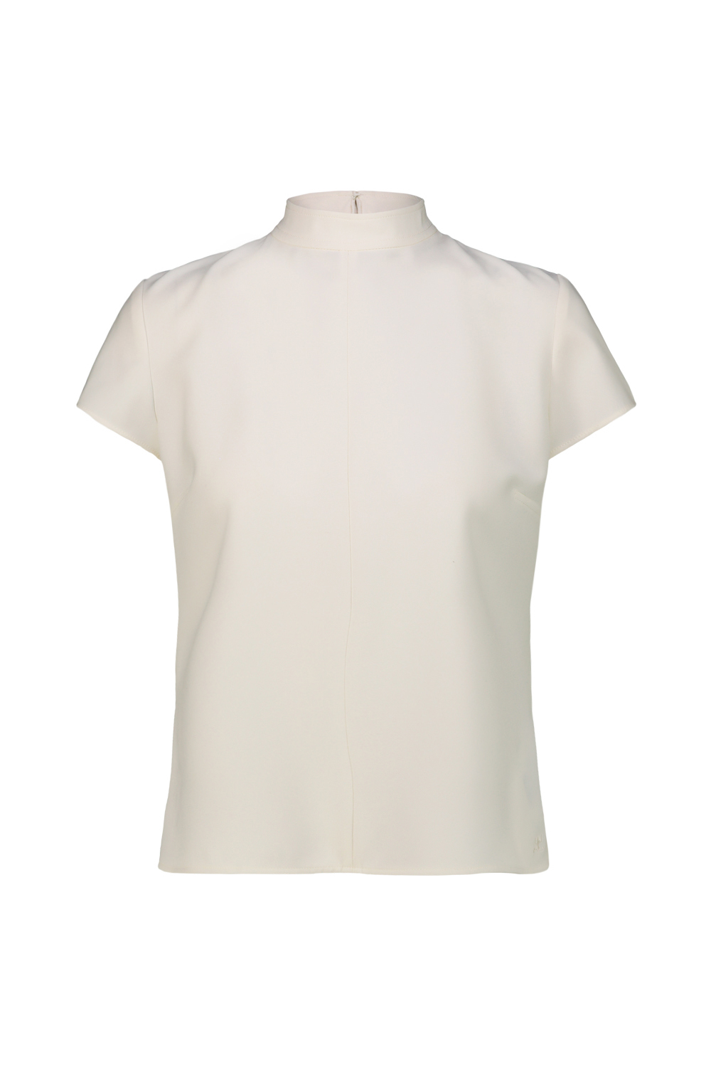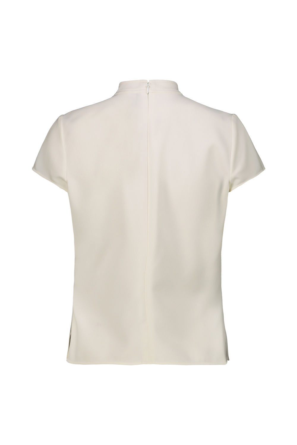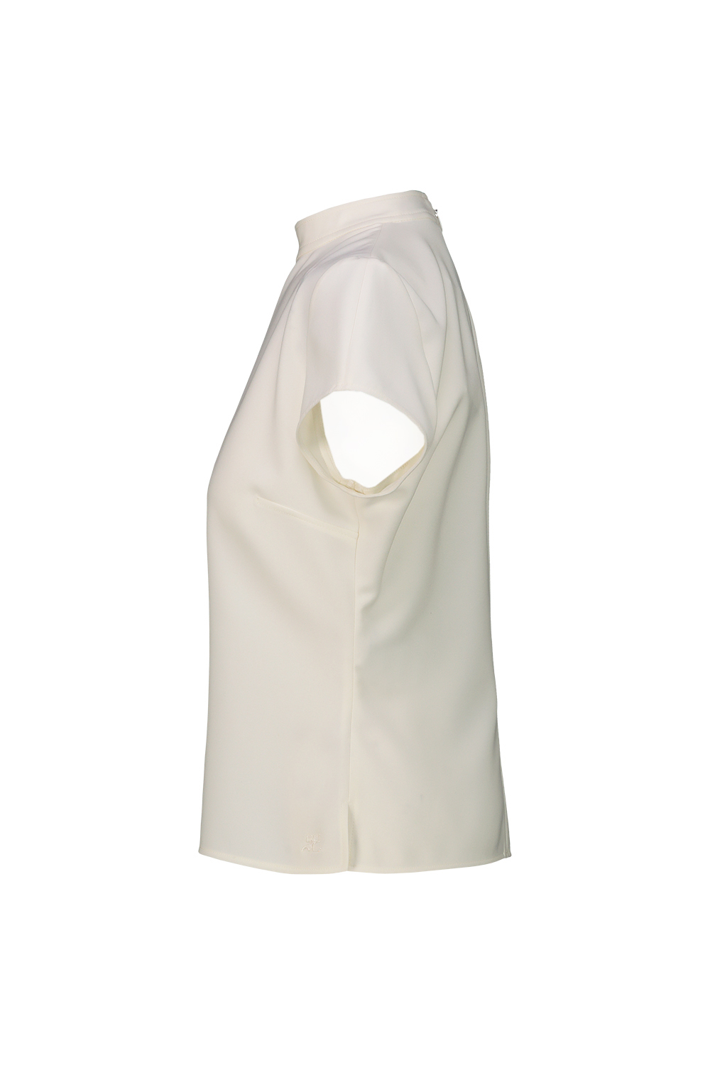 Courrèges Heritage short-sleeved mock neck crepe top with embroidered logo below neckline, zipped closure at back.