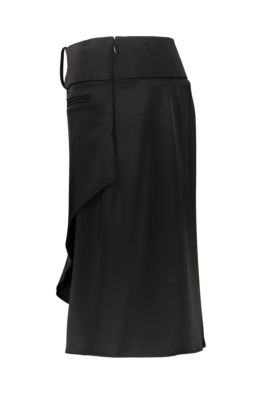 Courrèges Infinity satin skirt, asymmetrical-length, waistband and welt pockets. Drapé between the legs.