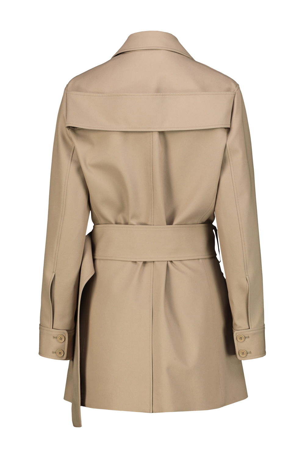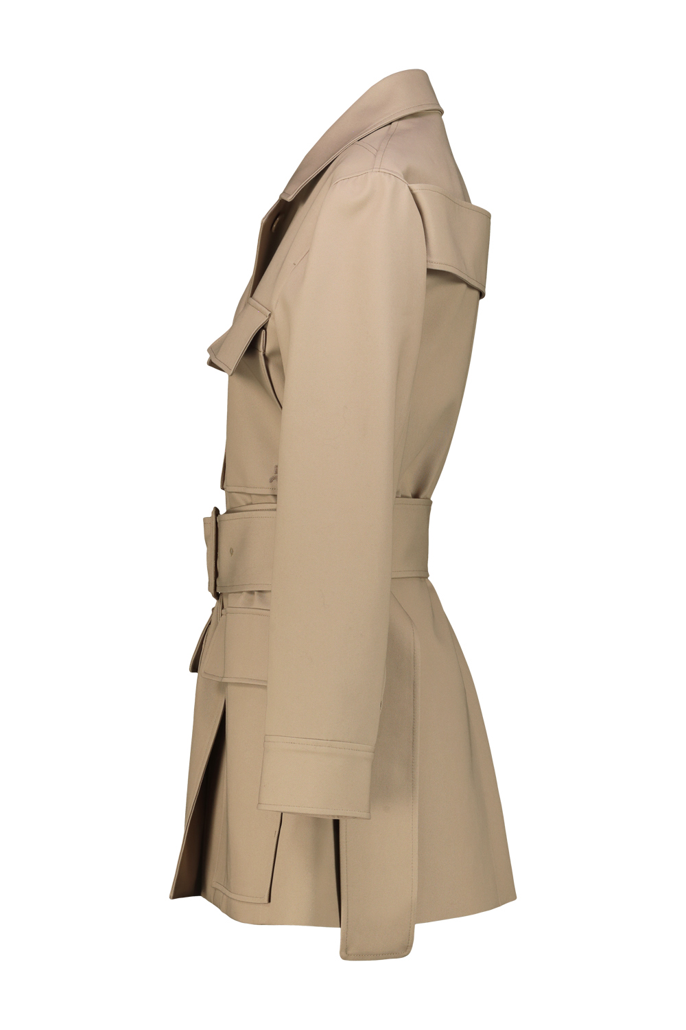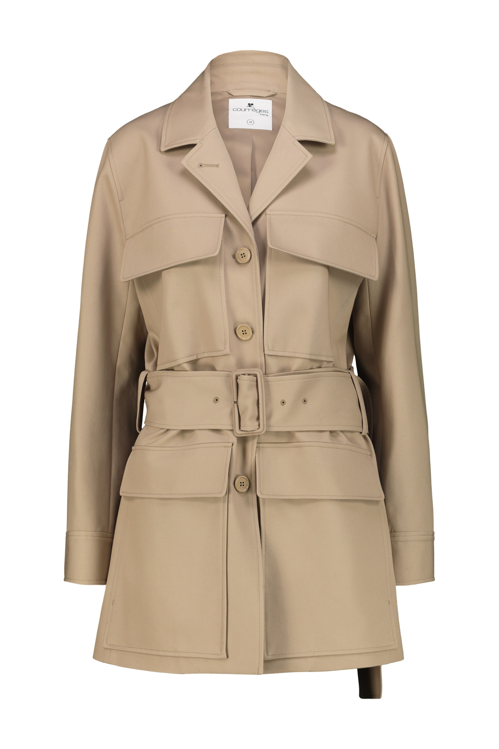 Courrèges utility cotton coat, adjustable waist belt and four front flap pockets. AC logo on the chest and front button closure.