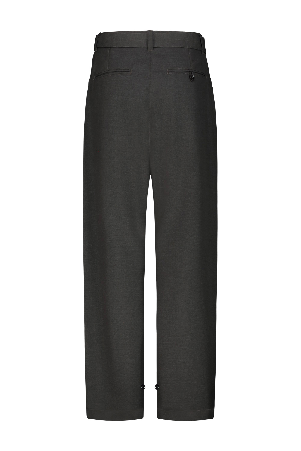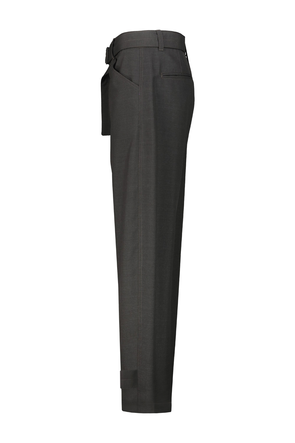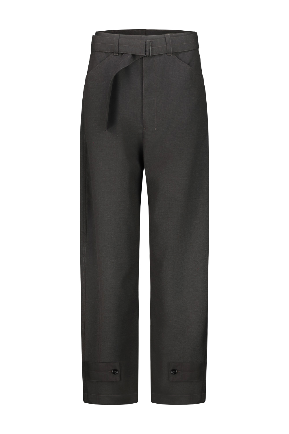 Lemaire curved tailored pants in wool blend fabric, oversized fit, belt loops at the waistband with removable belt , side pockets, welted pockets at the back, adjustable model with button tabs at the ankles.