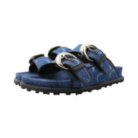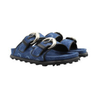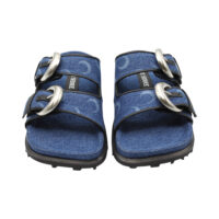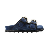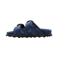Marine Serre sandal in regenerated denim with moon print, hand-covered denim insole, silver-coloured logo buckles, black leather edges, logoed sole