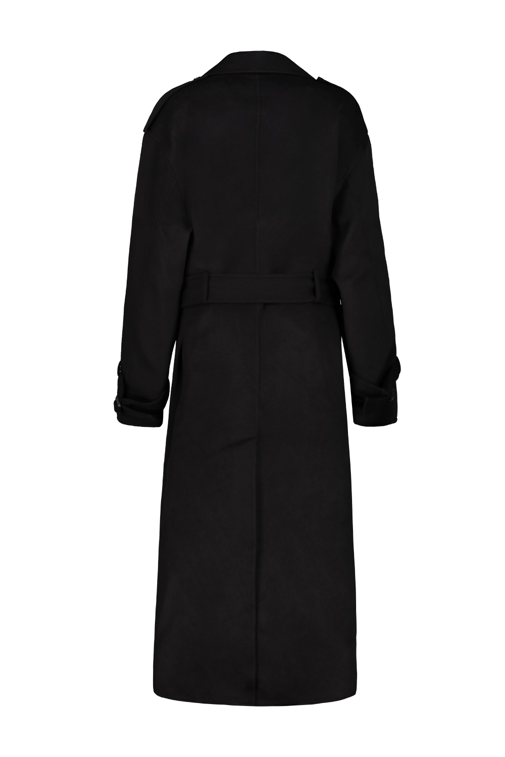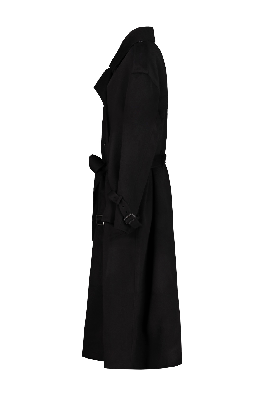 Toteme winter trench in fluid wool doublé, double-breasted, shoulder epaulettes, side pockets, belt at the waist and replicated on the cuffs .