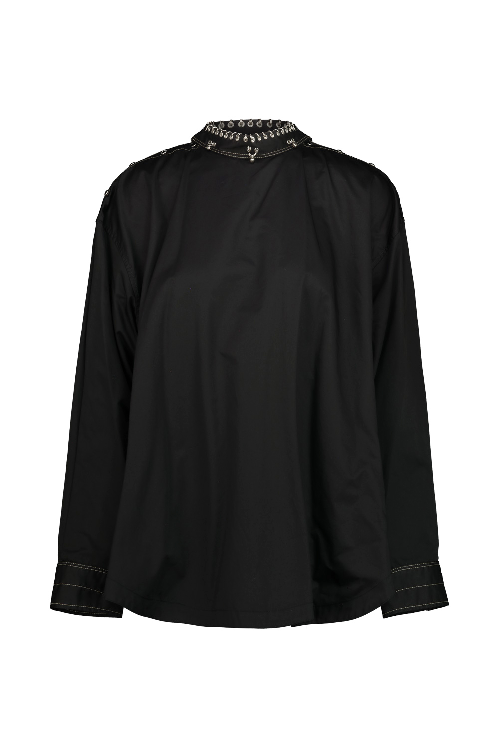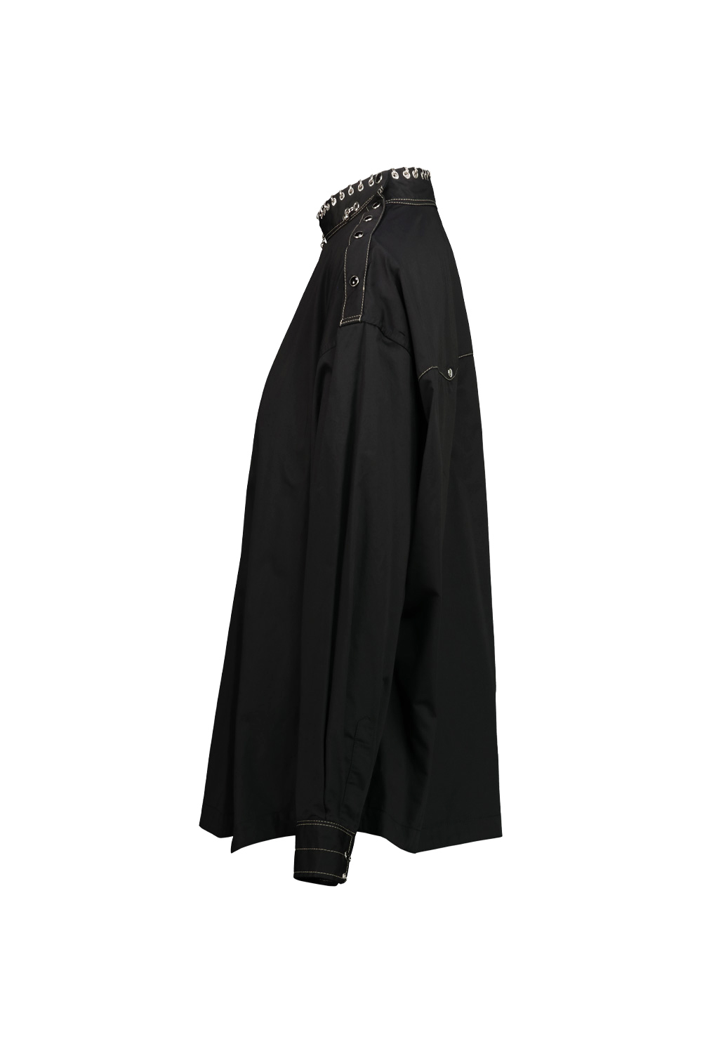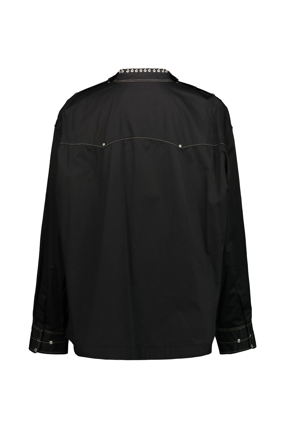 Lemaire cotton shirt with metal details of rings and studs along the edge of the collar and cuffs, opening on the shoulders with snaps.