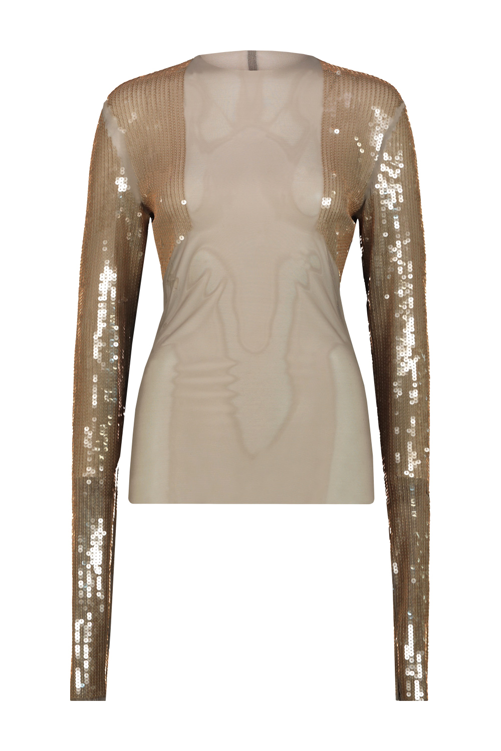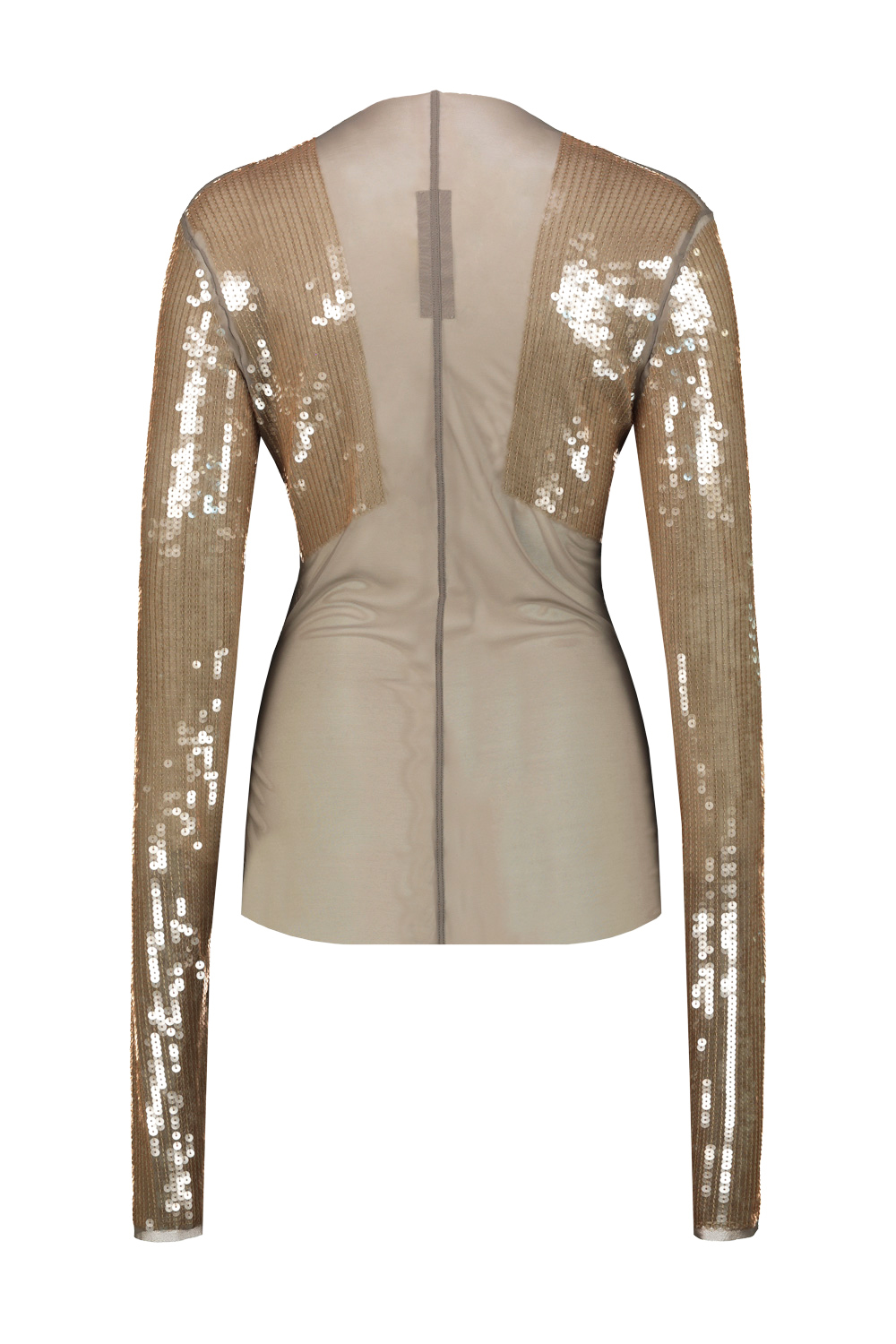Rick Owens Dennis embroidered tee, transparent stretch mesh base, sleeves and shoulders embroidered with translucent liquid-effect sequins.