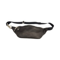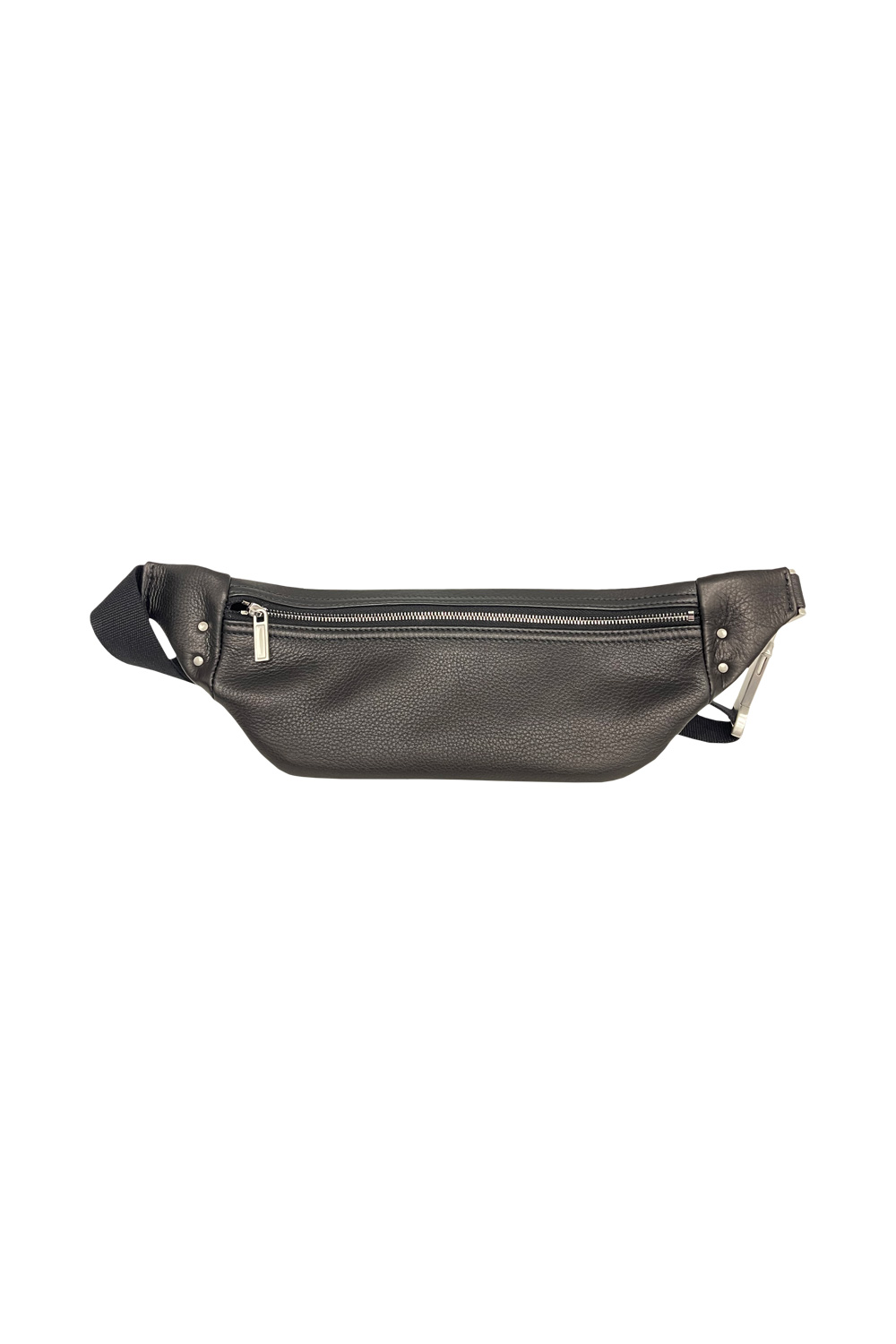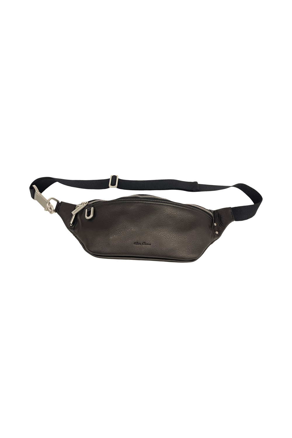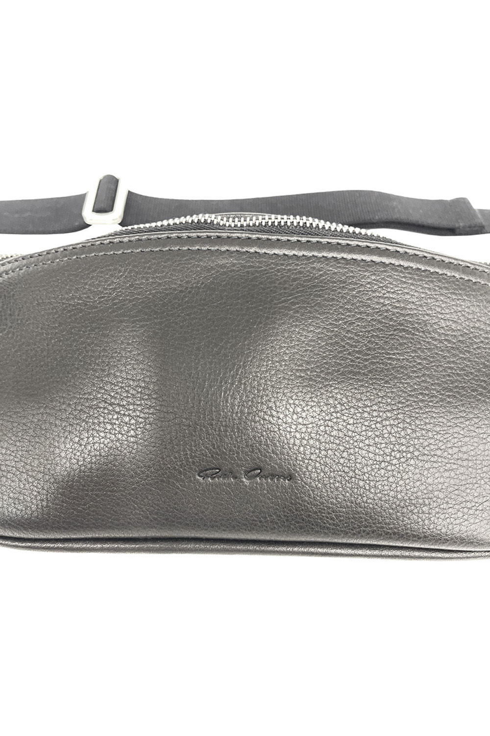 Rick Owens Geo Mumbag fanny pack, front double zippered pocket, second zipper pocket on back, metal d-ring detail, adjustable cotton webbing strap.