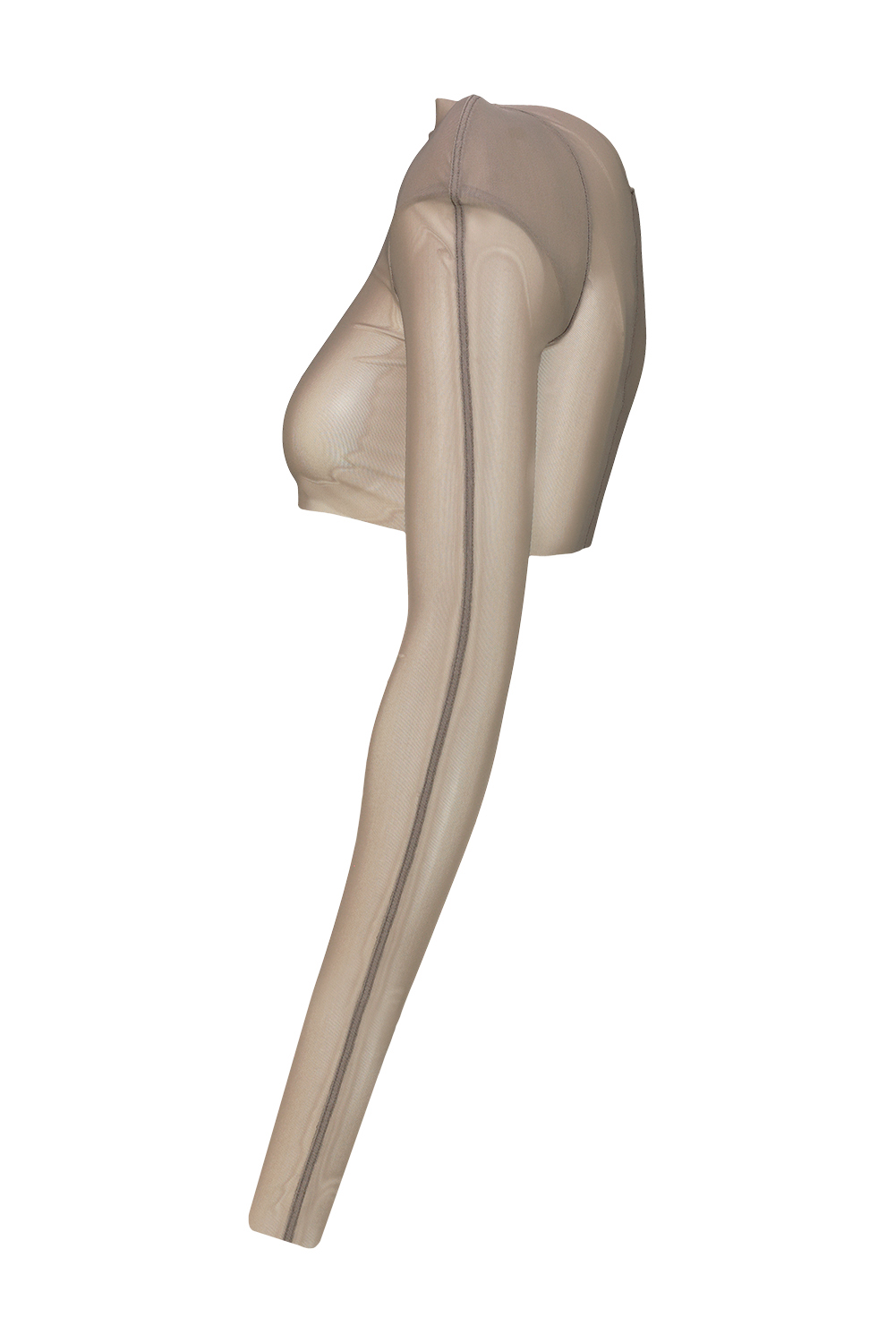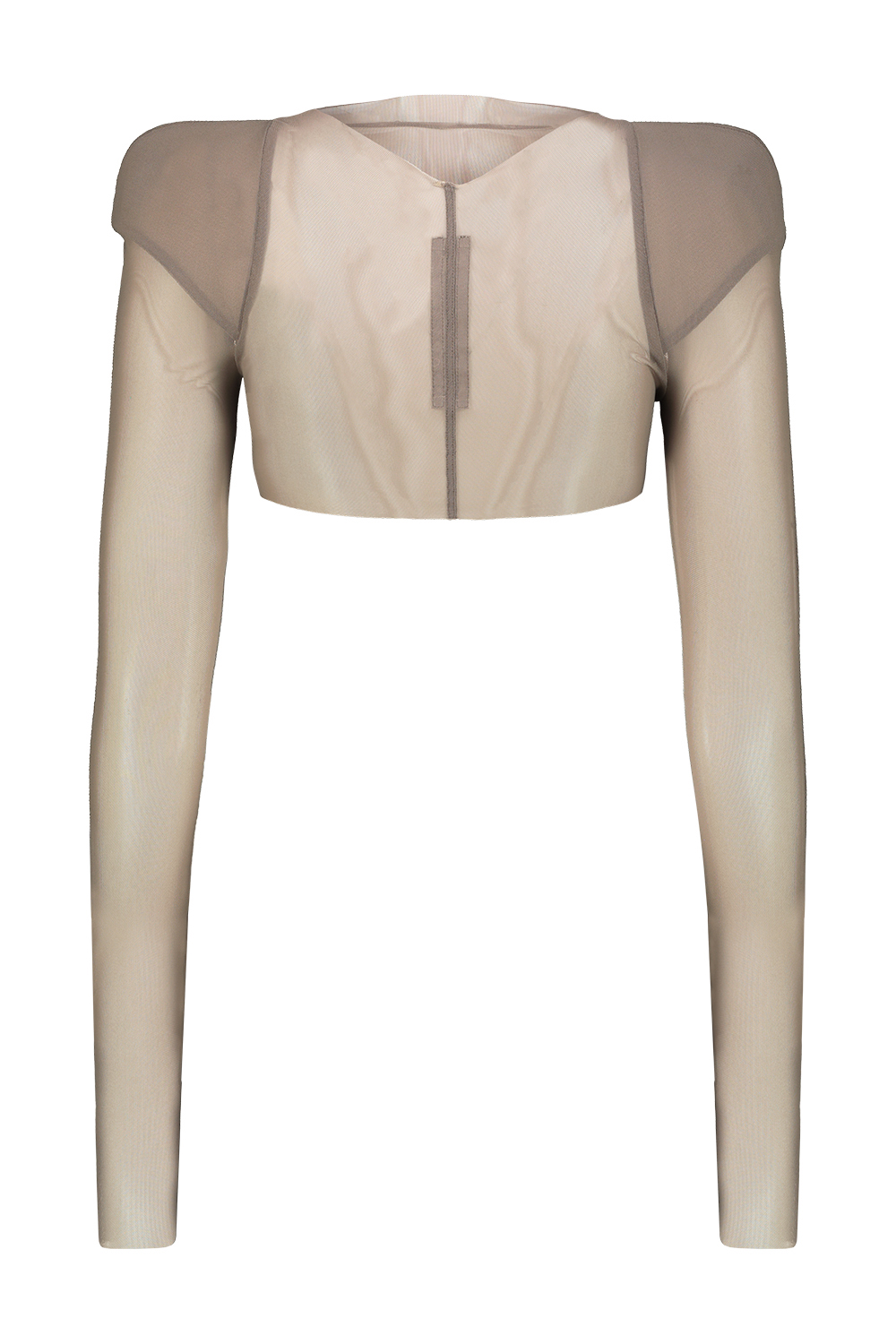 Rick Owens Helm Top in transparent stretch tulle, iconic reinforced rounded shoulders, all edges raw cut.