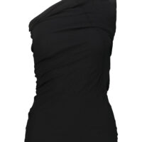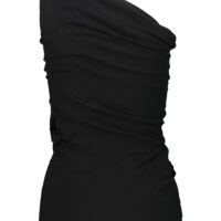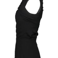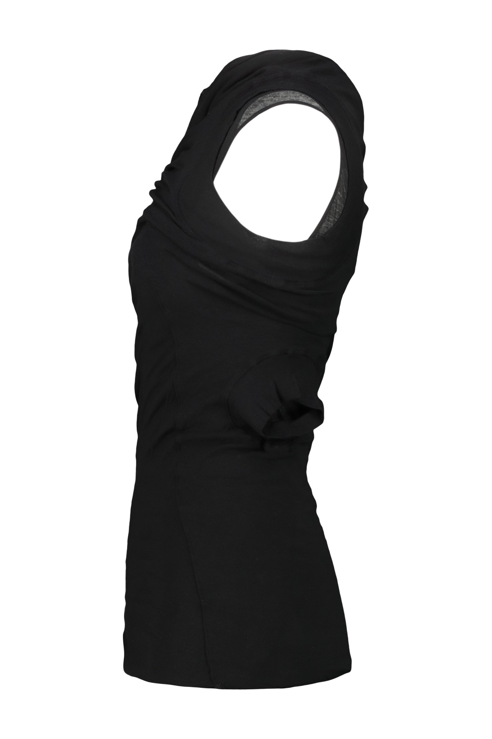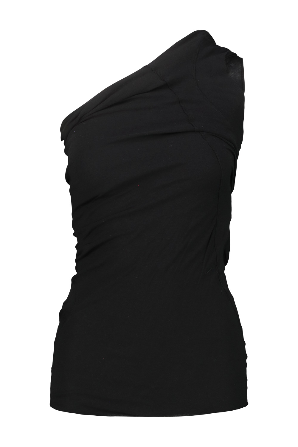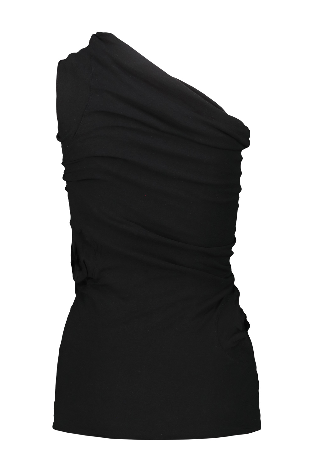 Rick Owens Hollywood banana top in light jersey, under layer with round holes with ribs edges, outher layer that folds up, It can be worn either criss cross or asymmetrical one shoulder.