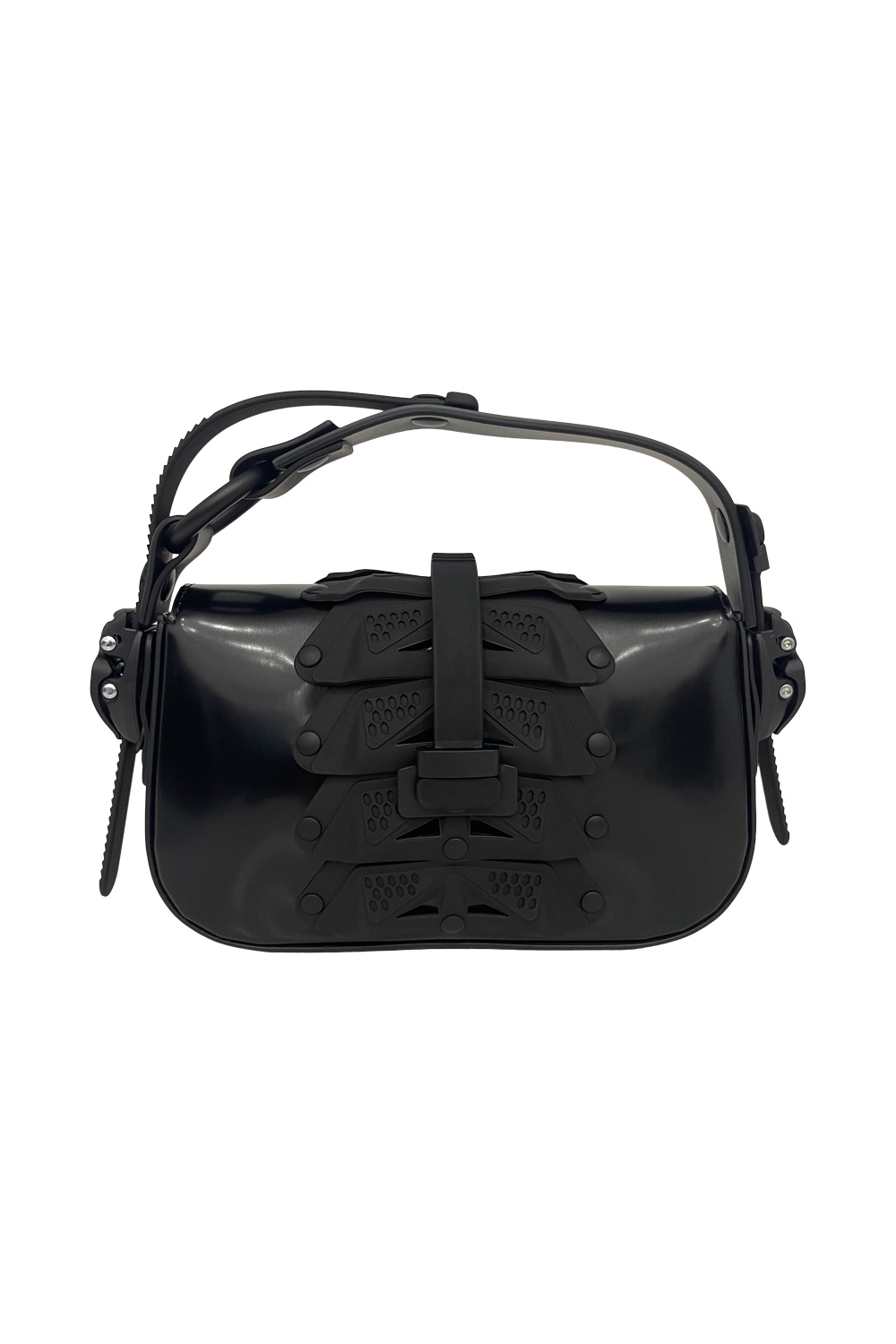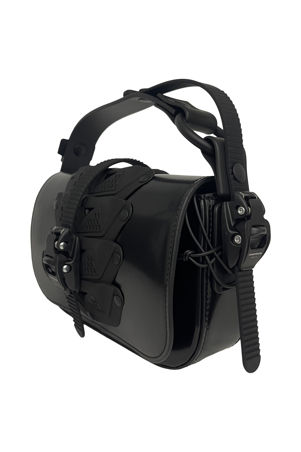 Innerraum Object C02 SHOULDERBAG in shiny black and matte black color, adjustable strap, adjustable closure with details of elements from motorcycle suits.