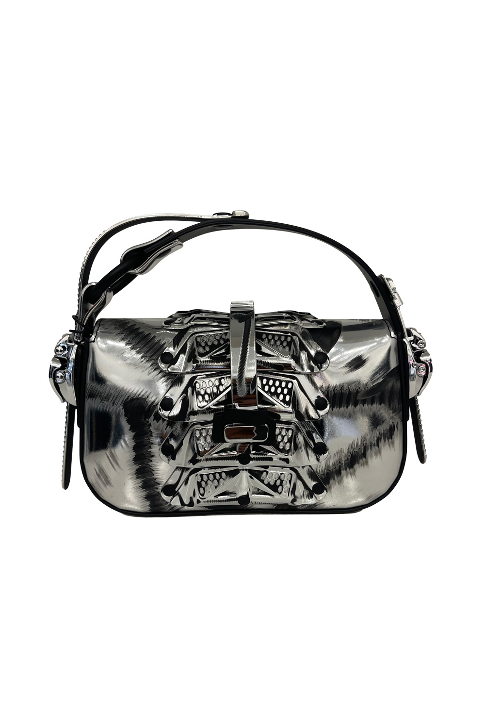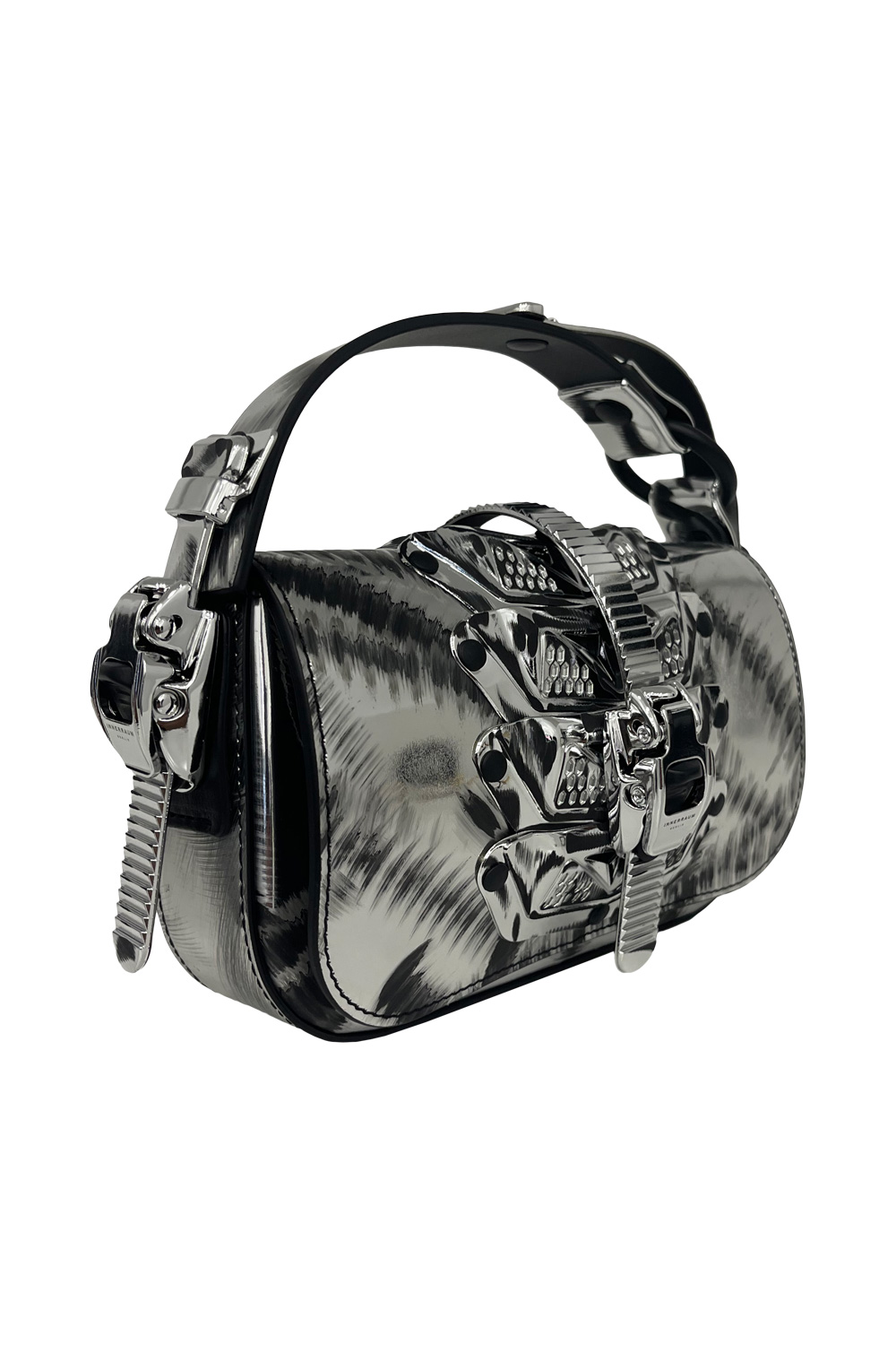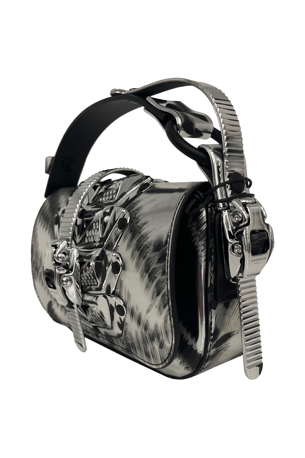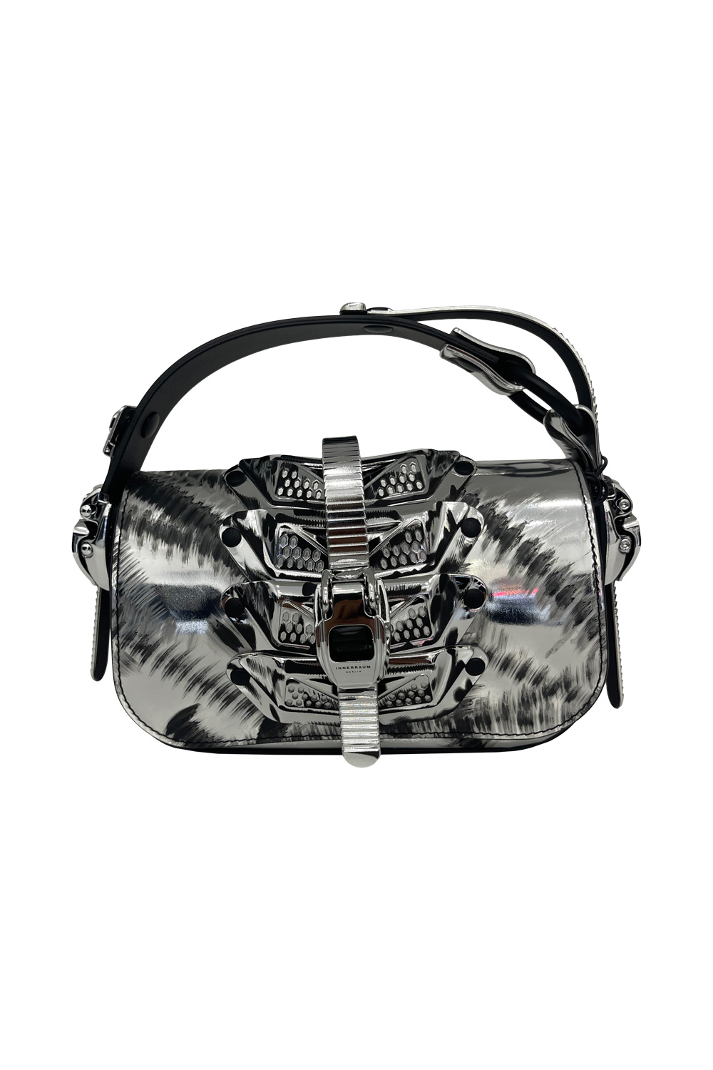 Innerraum Object C02 SHOULDERBAG in distressed silver color, adjustable strap, adjustable closure with details of elements from motorcycle suits.