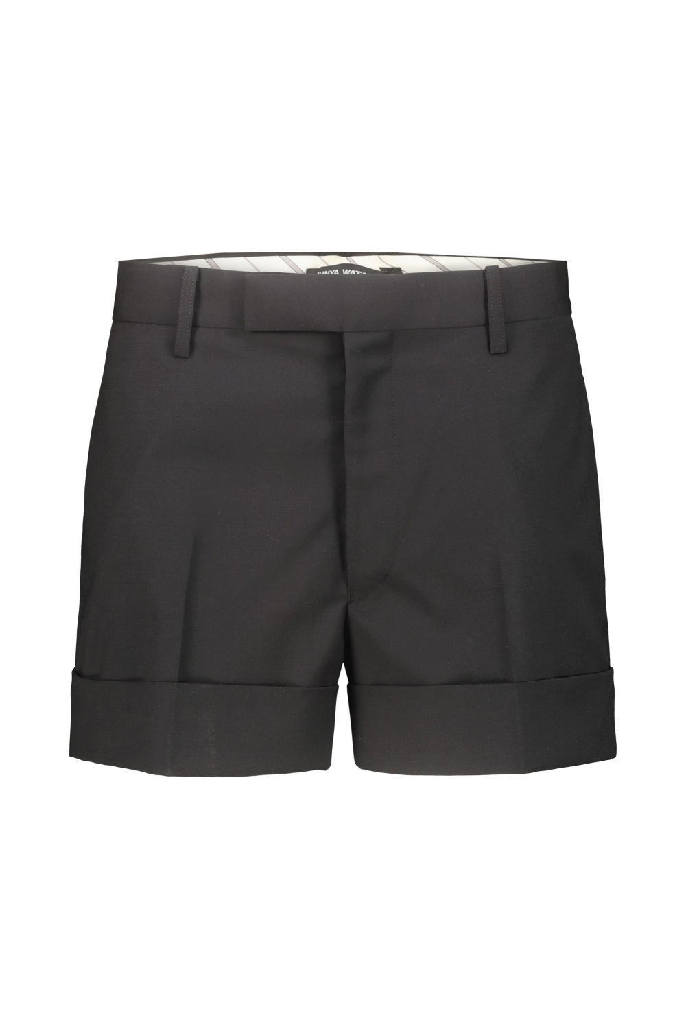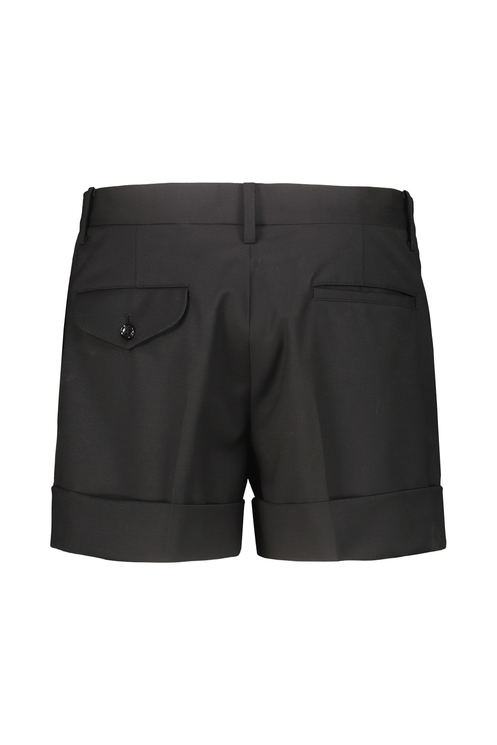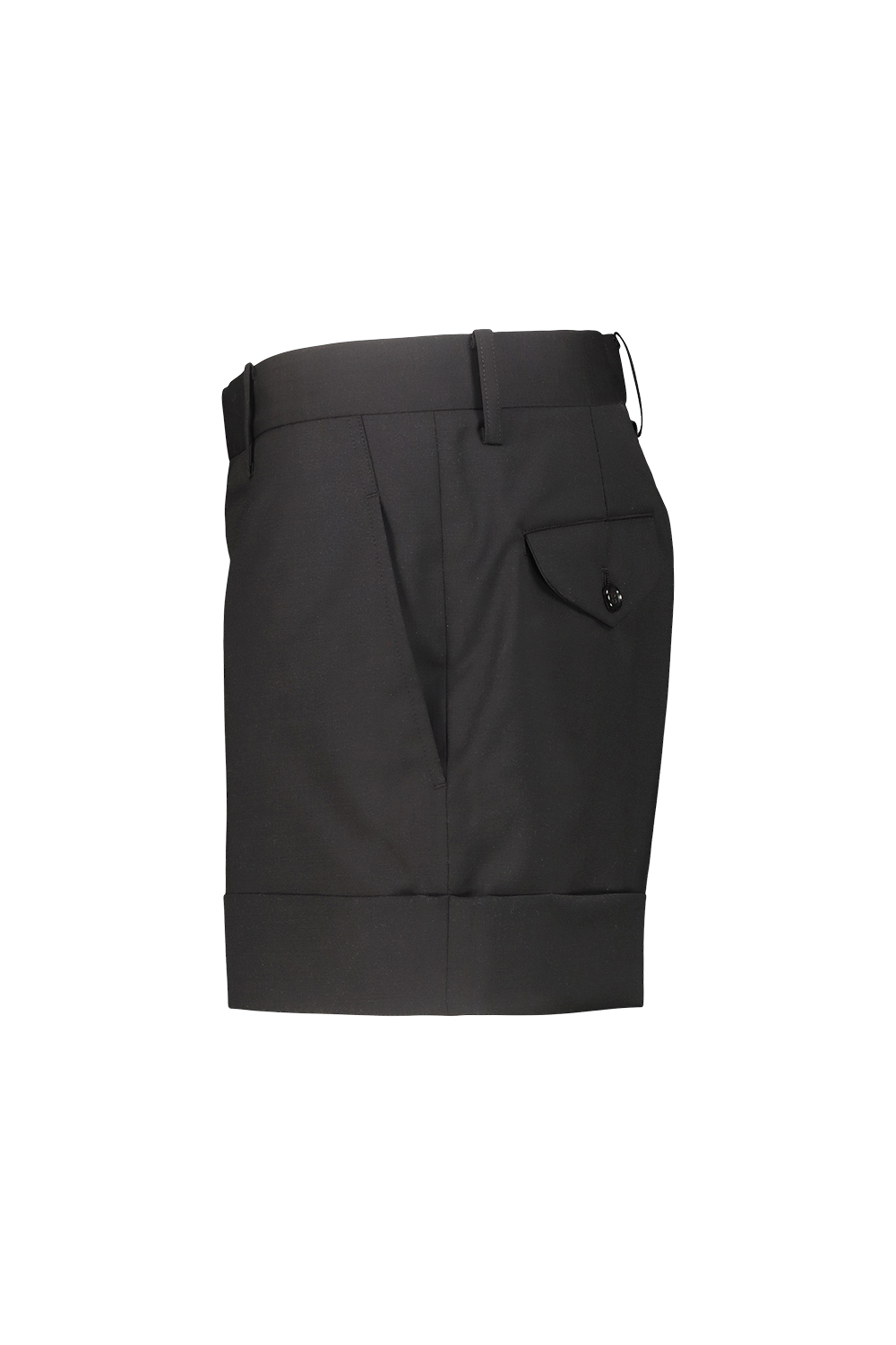 Junya Watanabe classic tailored short in viscose blend wool with turn-ups at the bottom and flap pocket on the back with visible button.