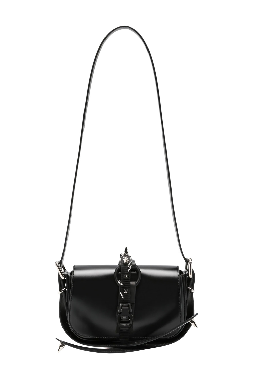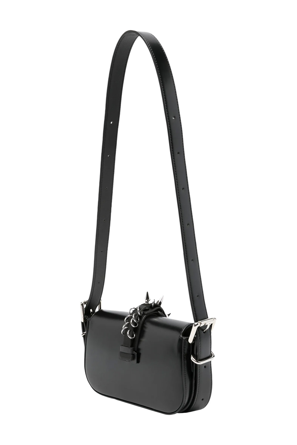 Junya Watanabe x Innerraum leather bag with long adjustable shoulder strap and silver-colored spikes and piercing details.
