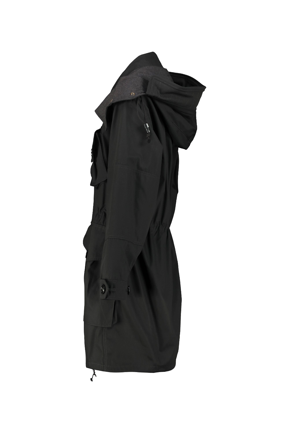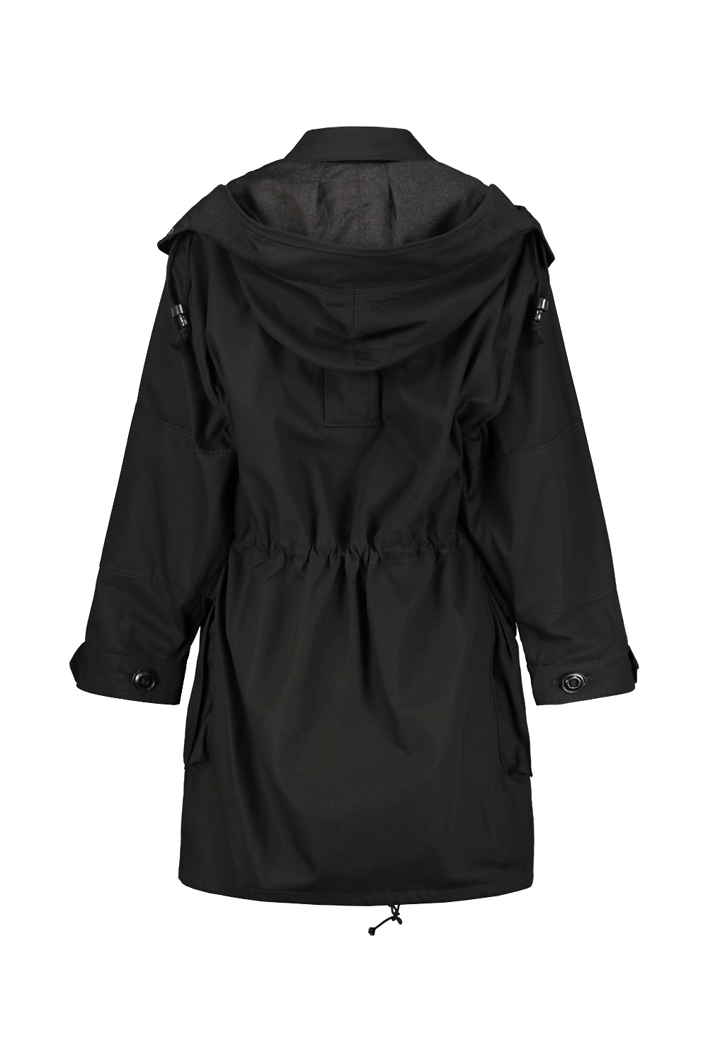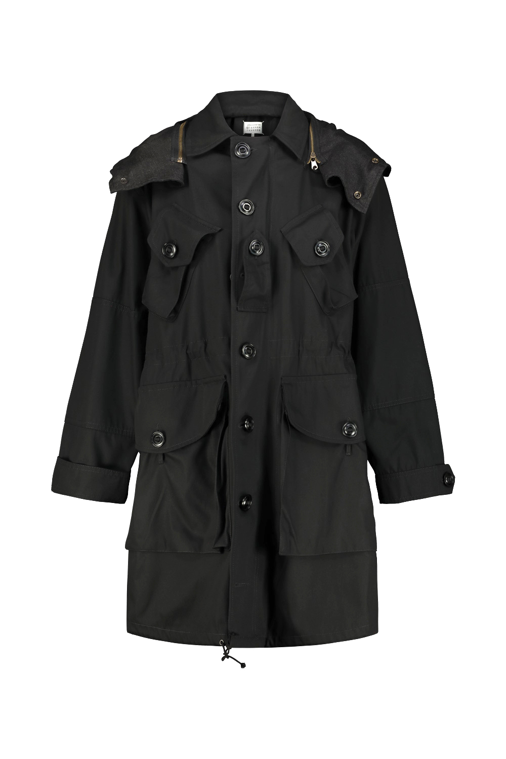 Maison Margiela cotton kaban with patch pocket details and visible buttons, removable wool-lined hood, drawstring waist and bottom.
