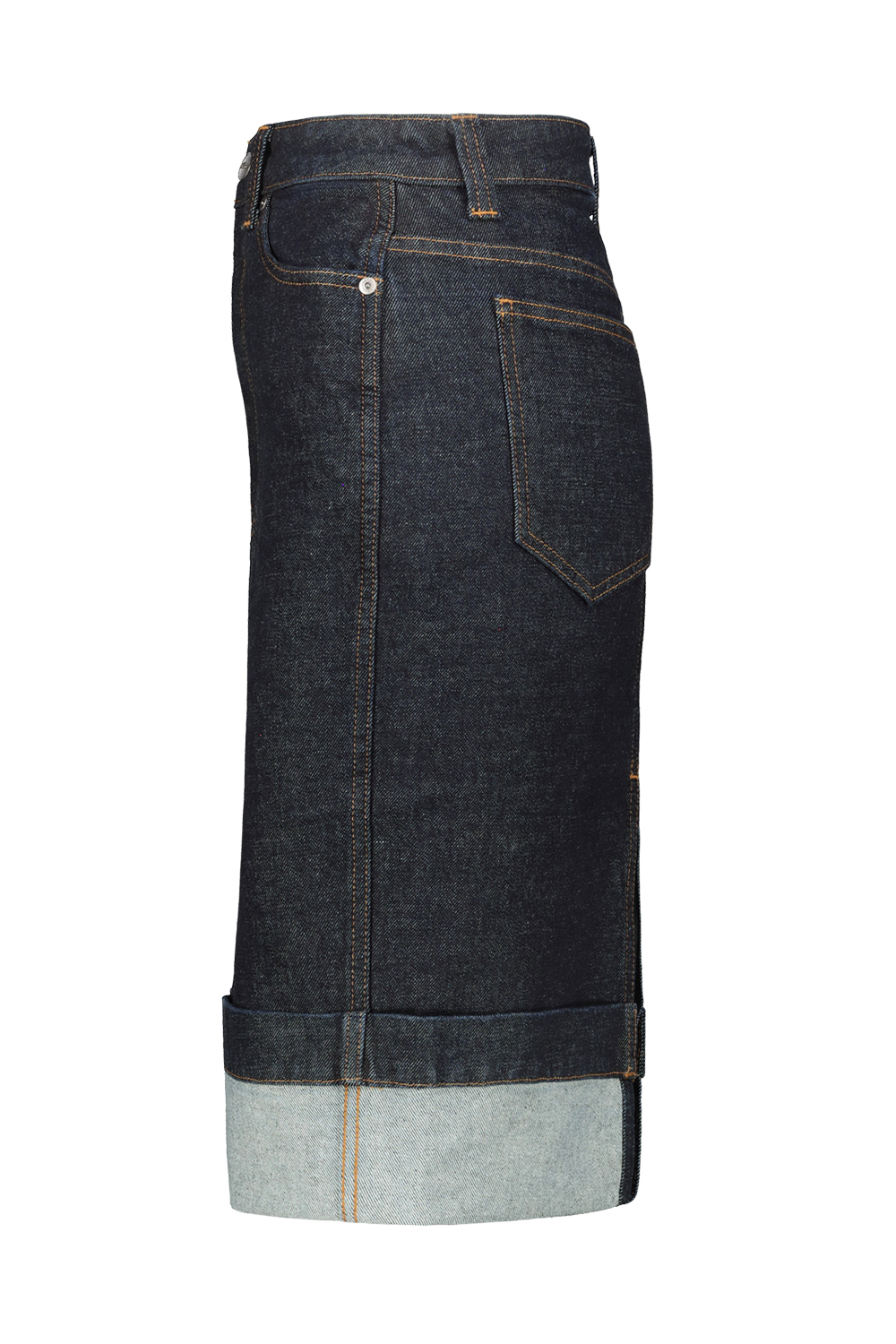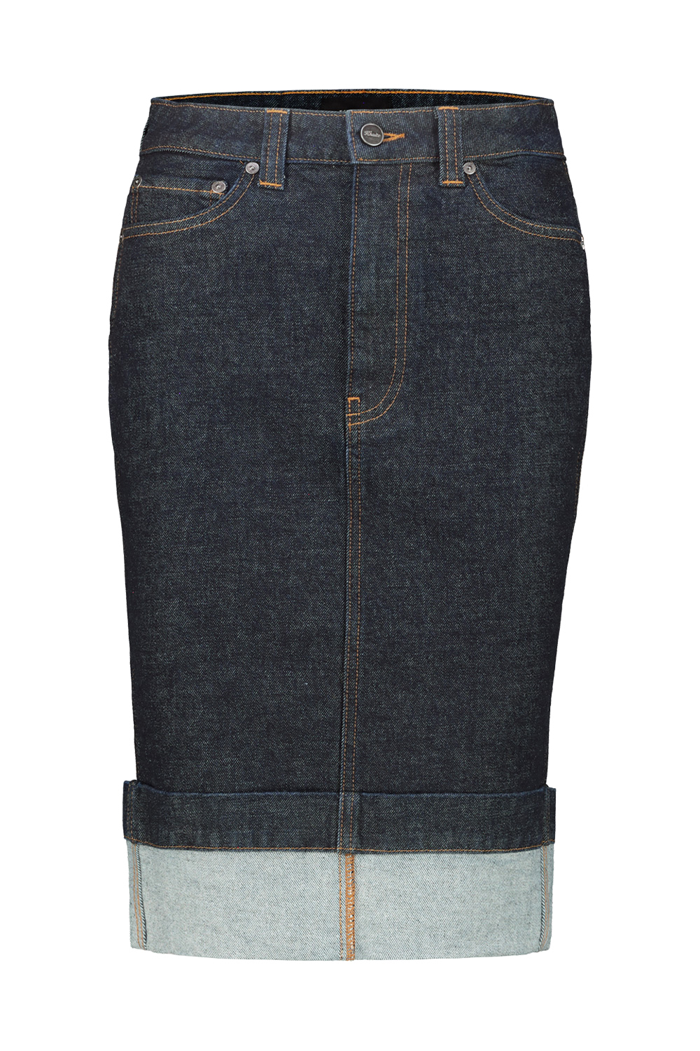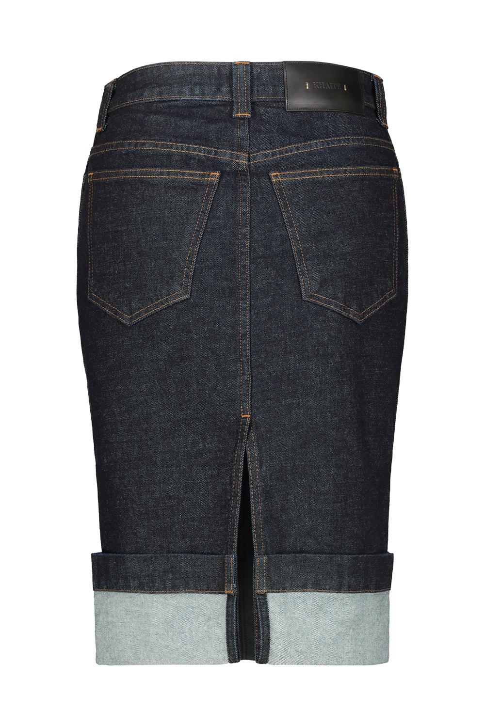 Khaite Kendra denim pencil skirt in benson, high-rise, five-pocket, back slit.tacked cuff reveals the lighter reverse of seamed denim.