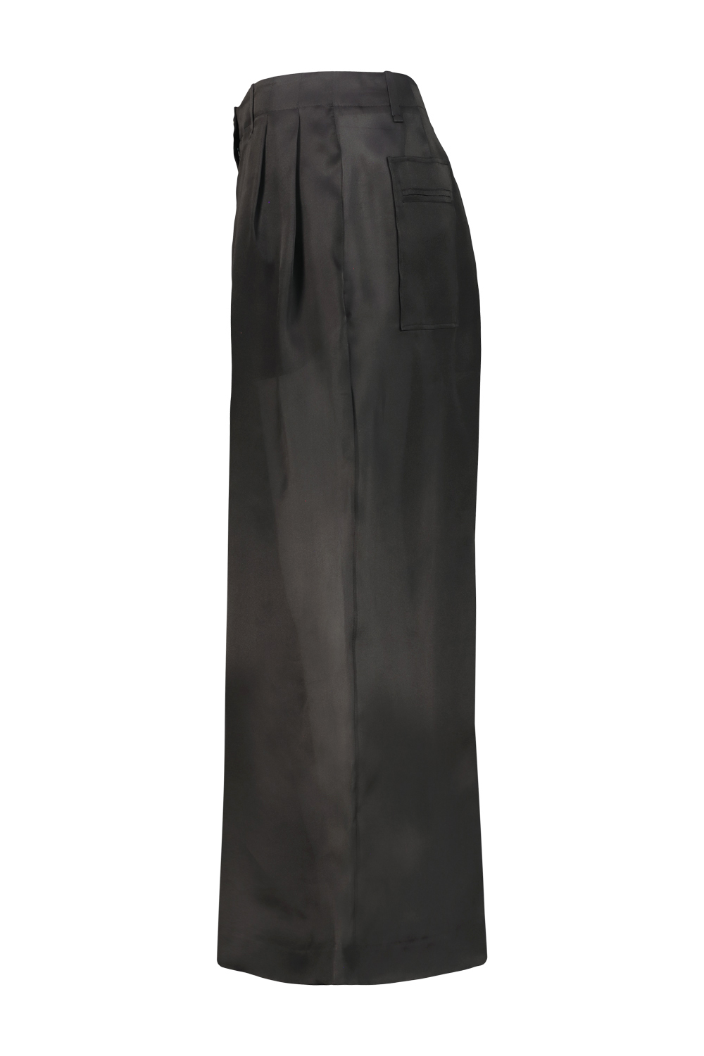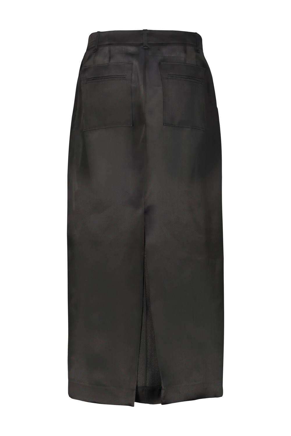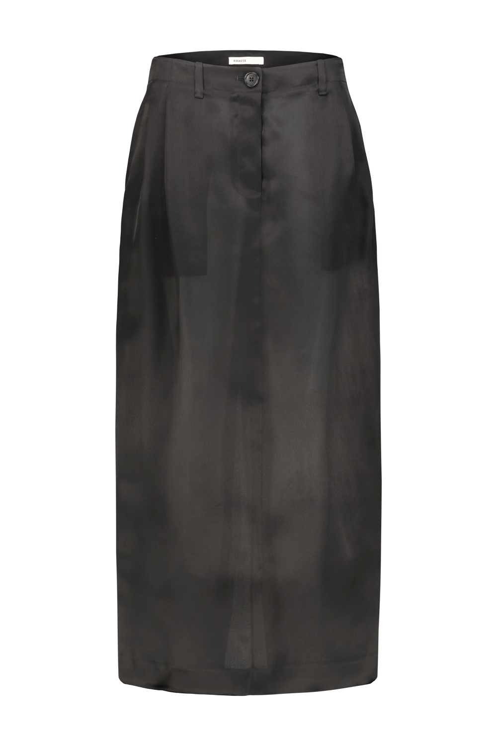 Khaite Lucian skirt in crisp silk organza ,fron pleat, waistband with belt loops zip fly and button, In-seam side pockets, elted patch pockets and back slit.