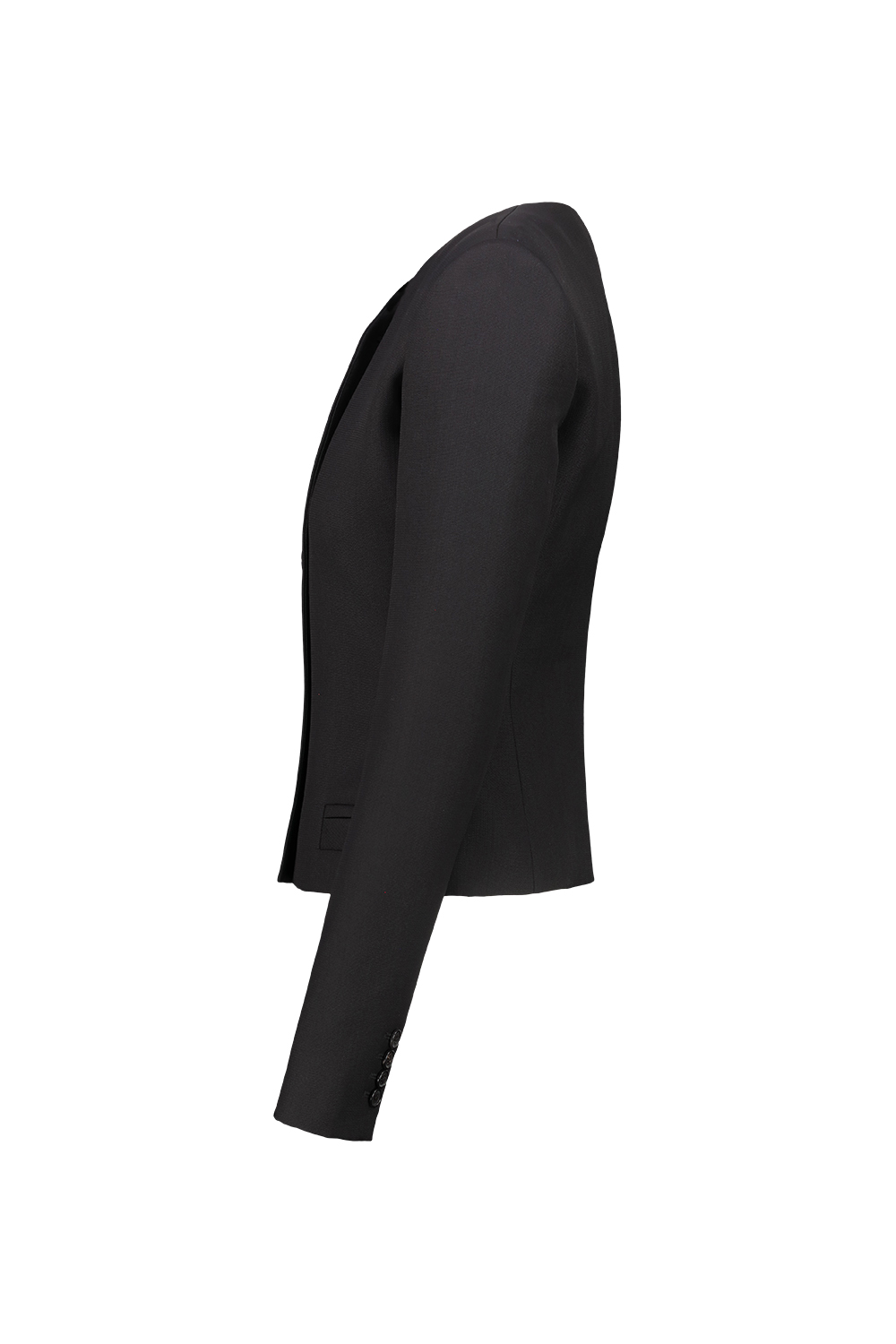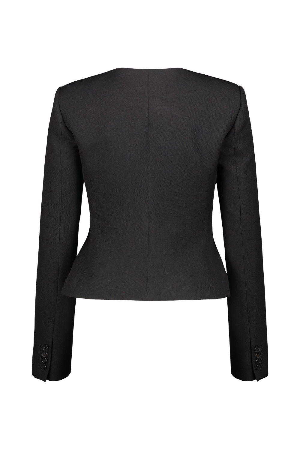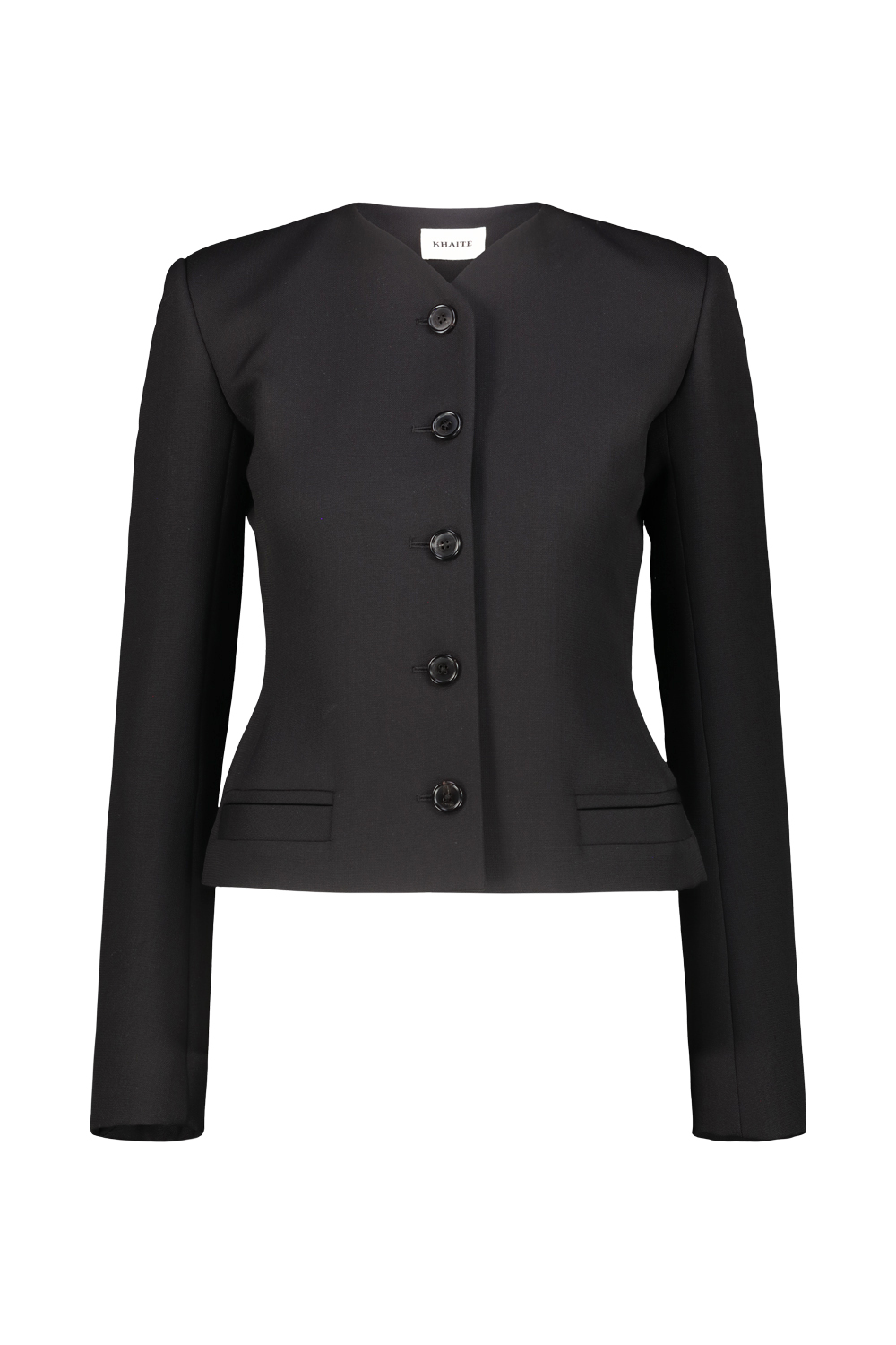 Khaite Nara Jacket in wool, collarless, high-necked jacket with reinforced shoulder pads, close and cropped fit, faux pockets.