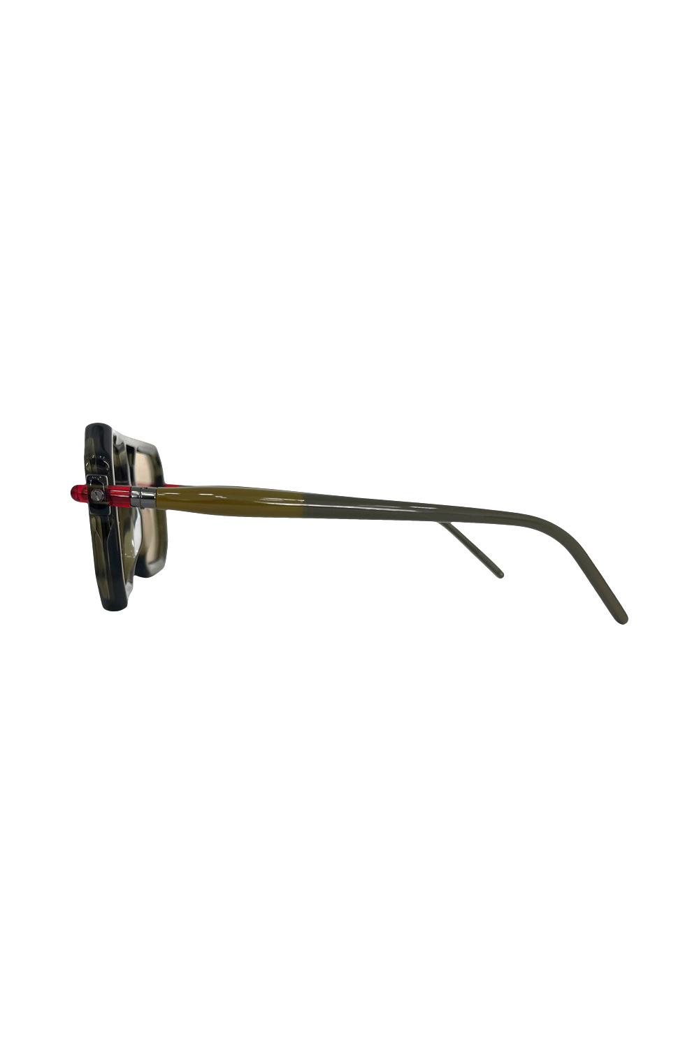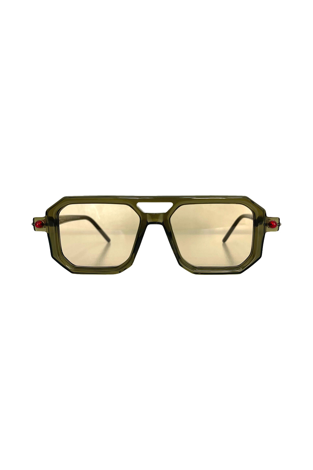 Kuboraum mask P8 GRG with rectangular frame in tranparent military green acetate, light brown lenses and temples in shiny military green acetate.