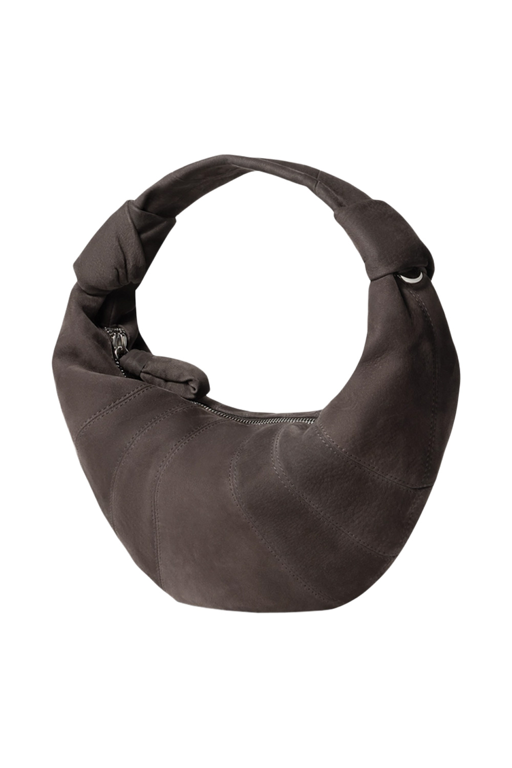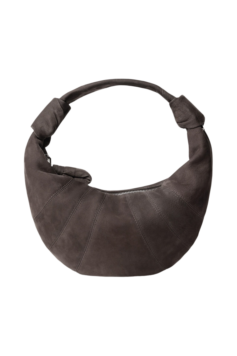 Lemaire mini fortune croissant bag in soft nabuk , side knot finishing of the strap, zip closure.