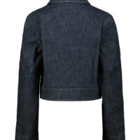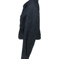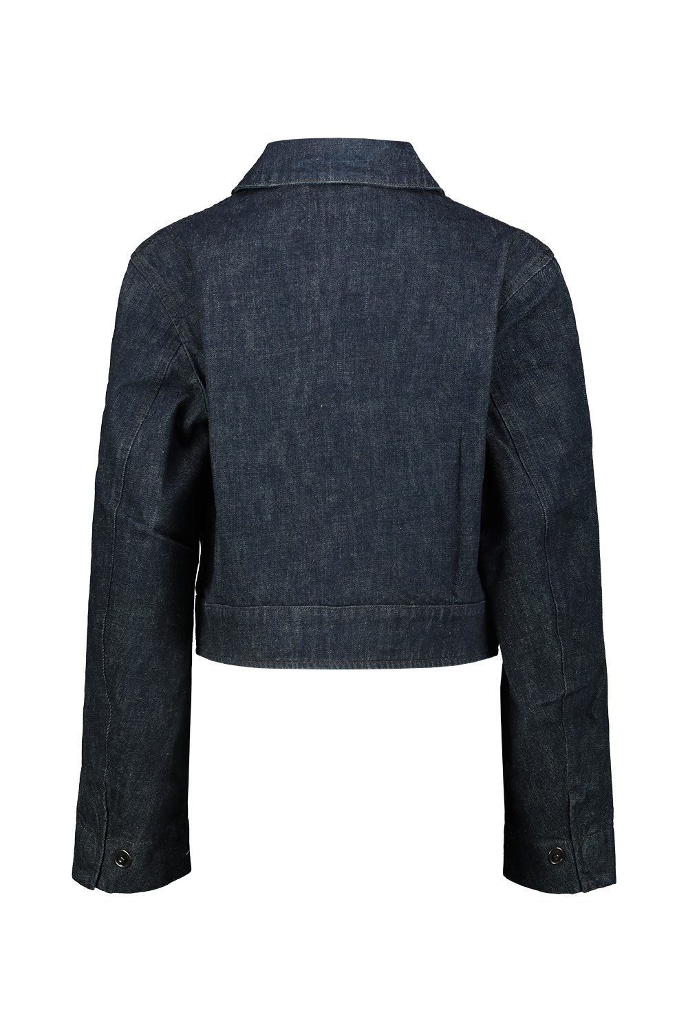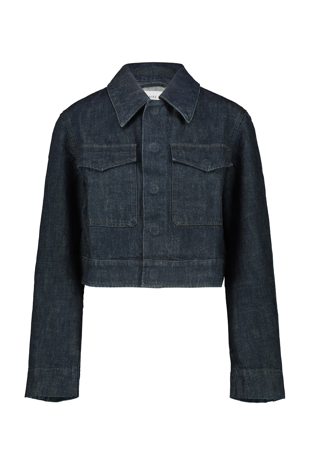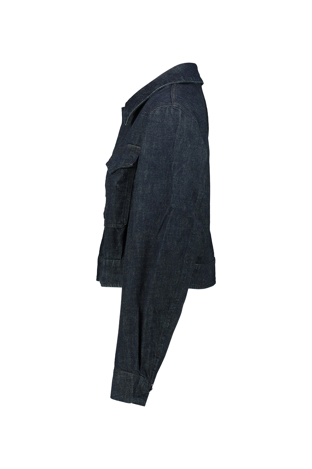 Lemaire Two Pocket Cropped Jacket in heavy denim with a visible twill weave and a deep indigo wash, cropped waist and a relaxed fit, two flap patch pockets at the front with hidden snap buttons.