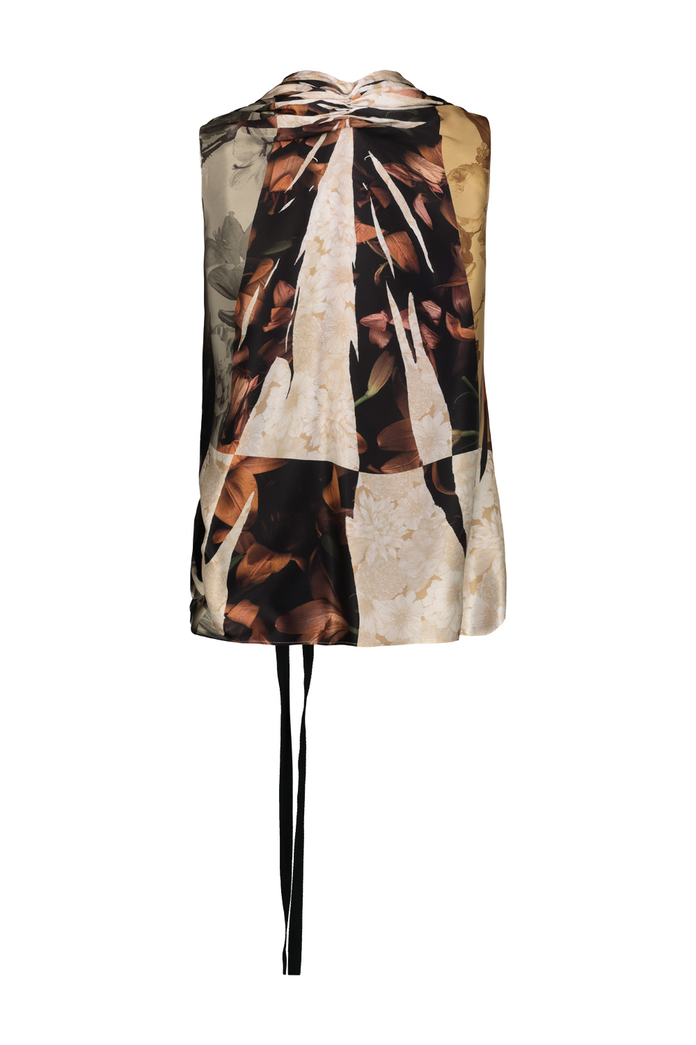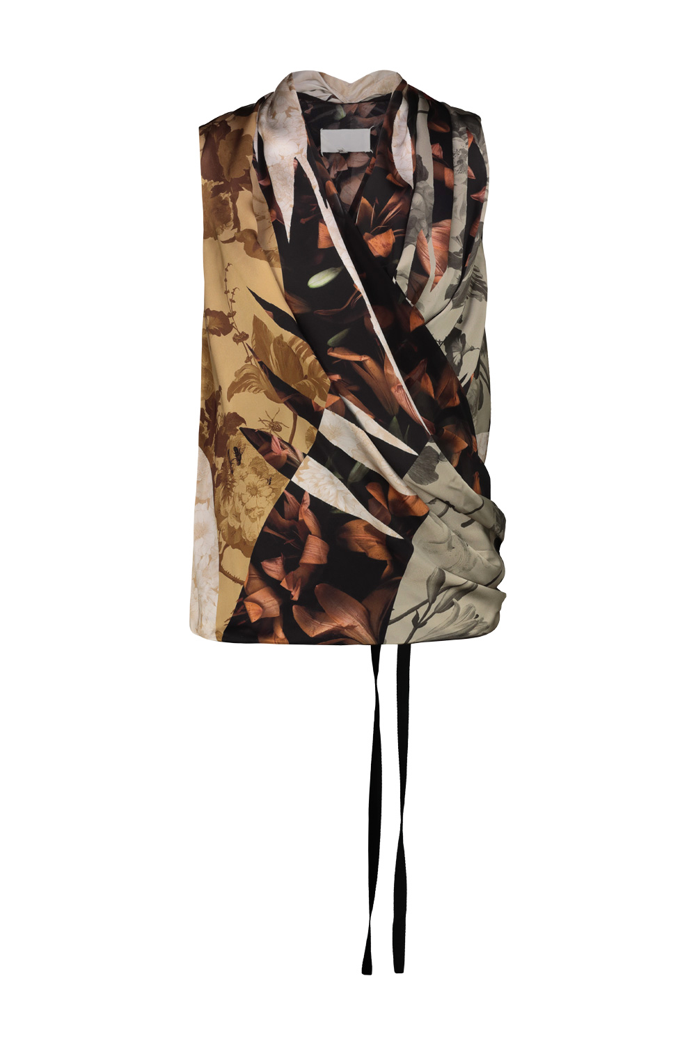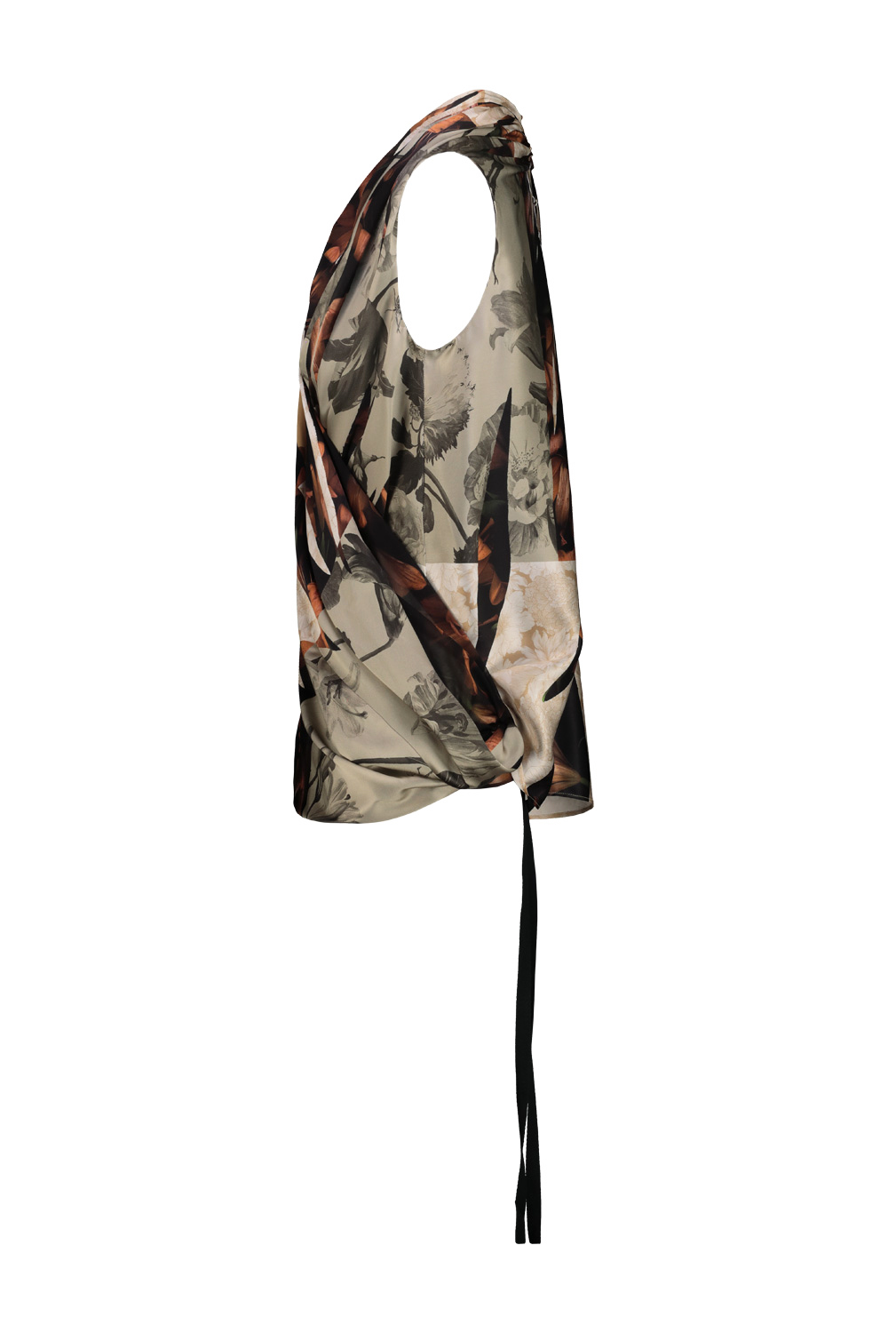 Maison Margiela silk top with fluid draping detail that wraps and gathers the body, forming a soft crossover neckline. The print draws inspiration from 17th-century Dutch still life paintings.