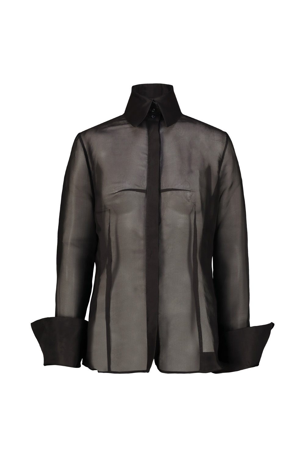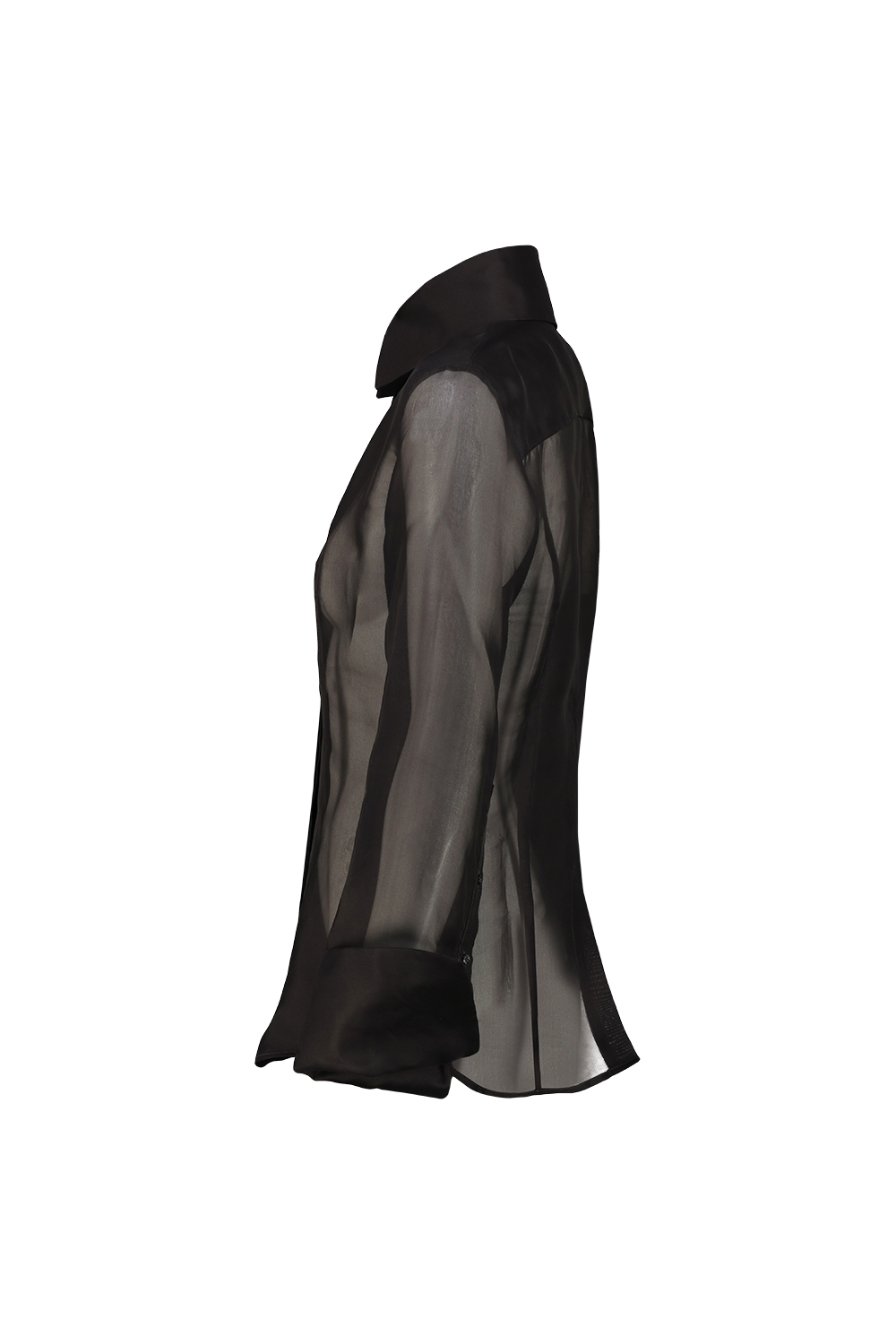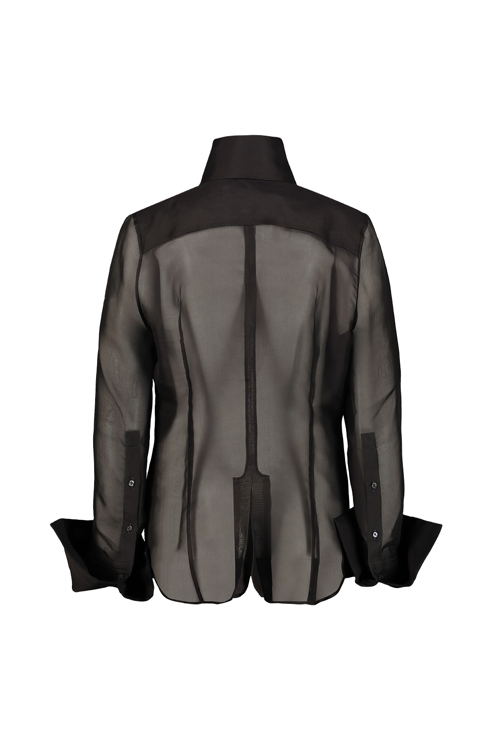Matieres Fecales Daphne silk organza shirt, high collar, large roll-up cuffs, slit at the center back.