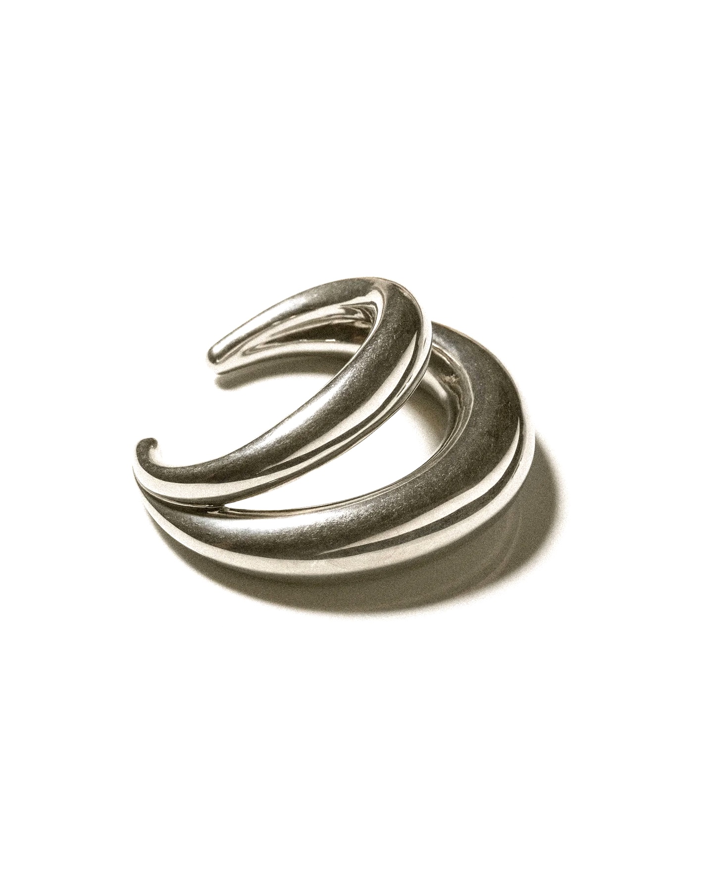 Panconesi blow up wrist cuff in rhodium plated copper, sculptural metal forms with voluminous silhouettes.