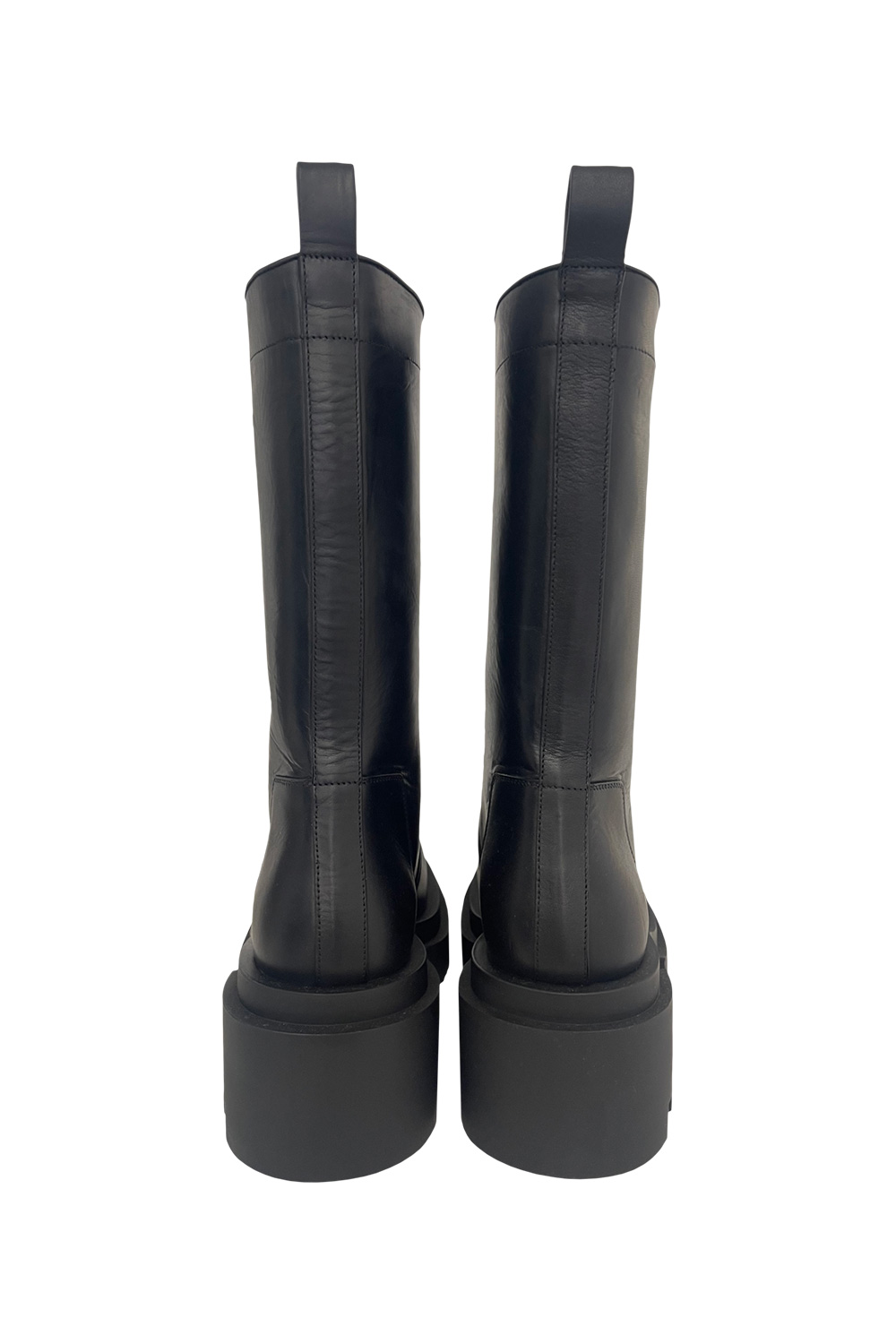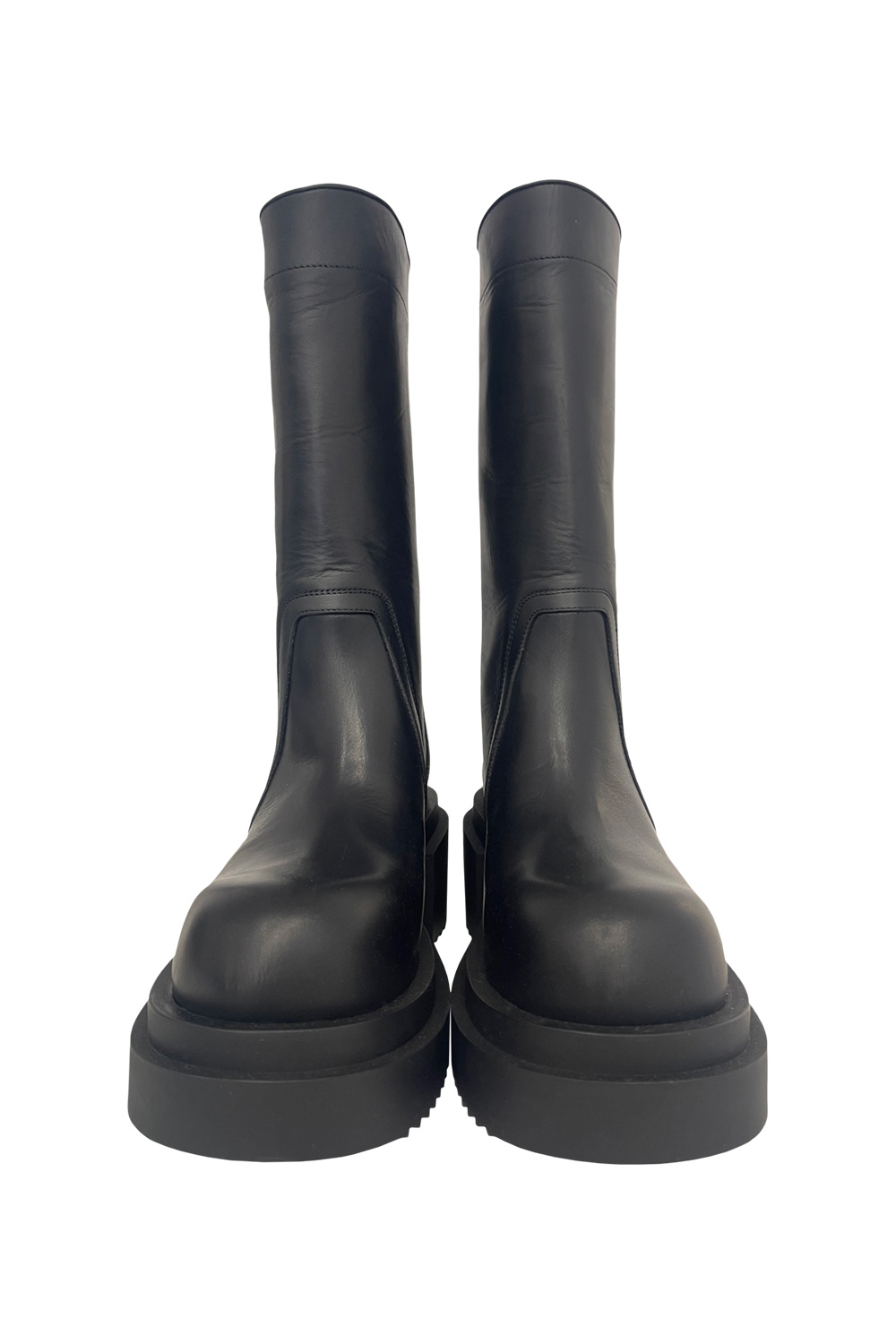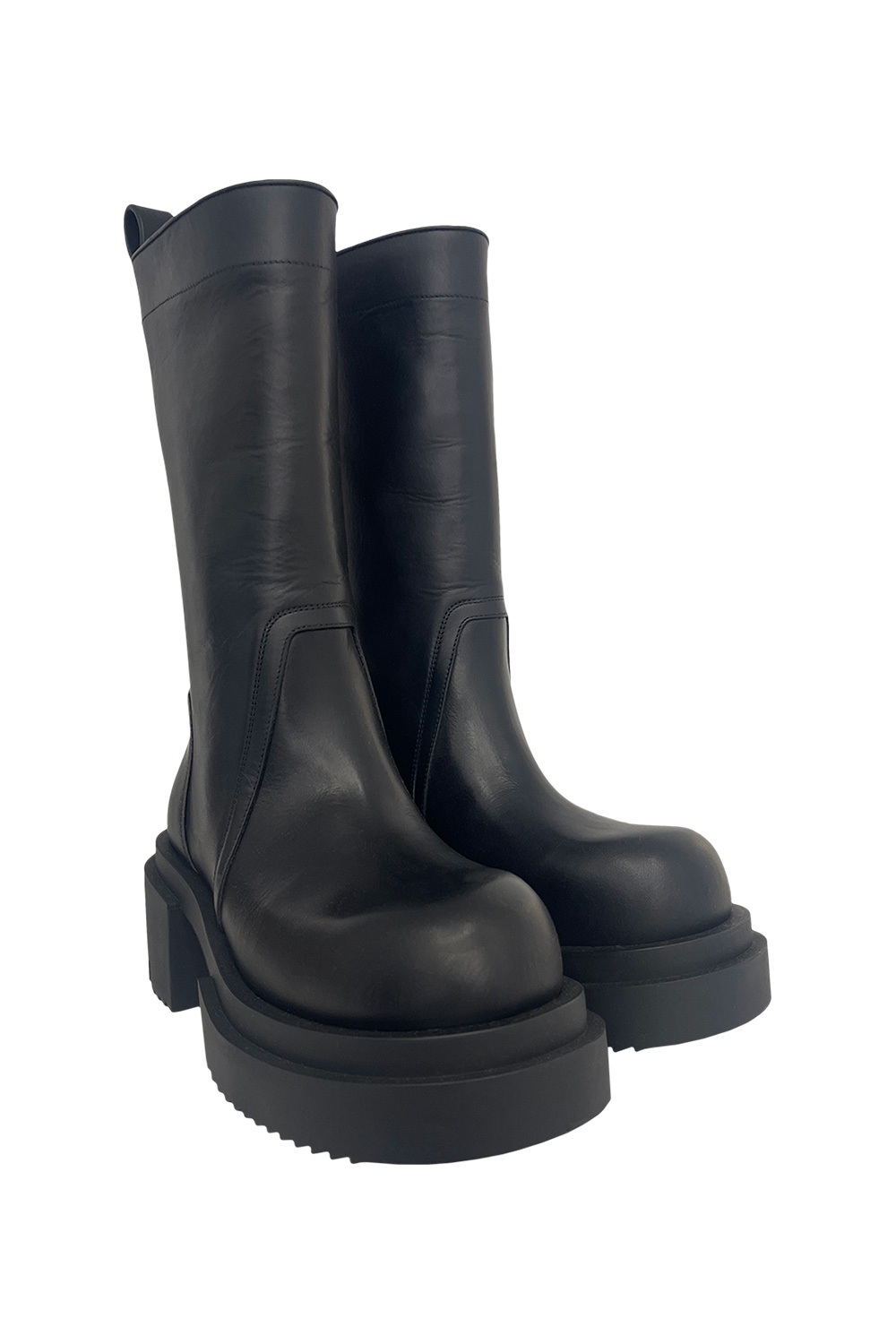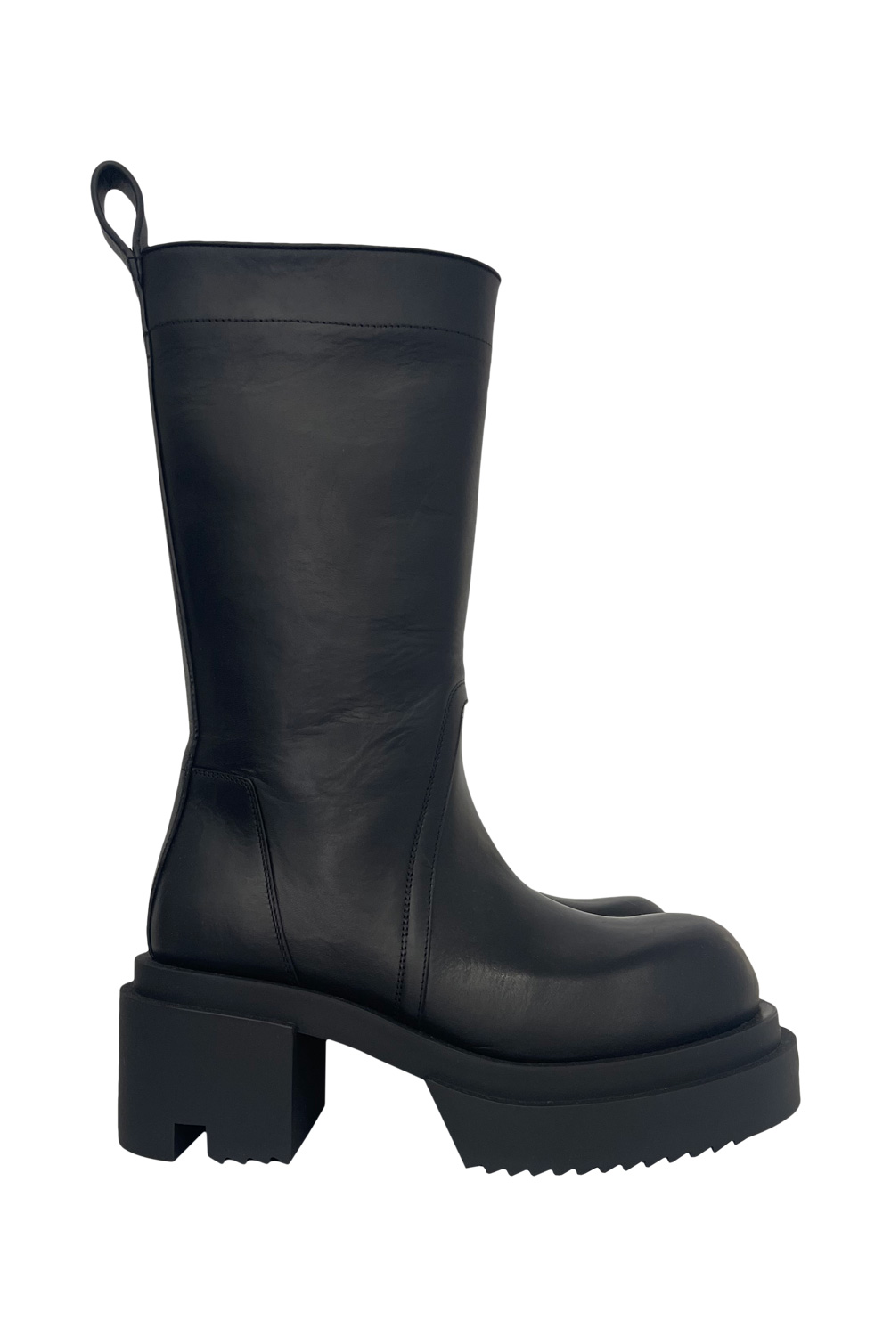 Rick Owens Calf pull on bogun boots in calf leather, back pull tab, rounded toe, heel 6cm, bogun rubber mega creeper sole with a toothed square heel.