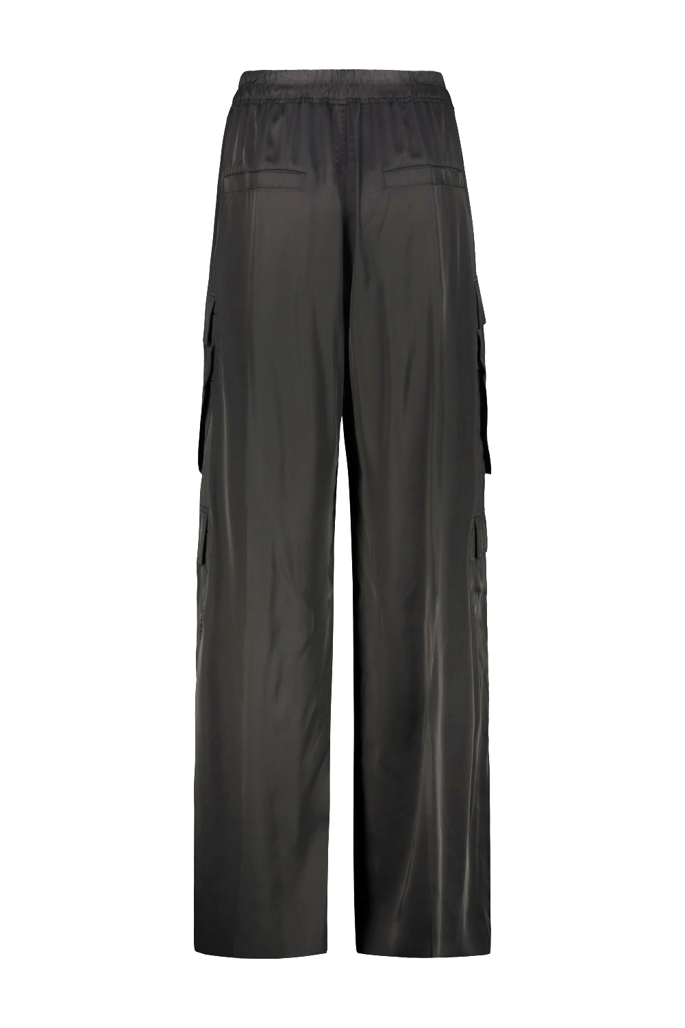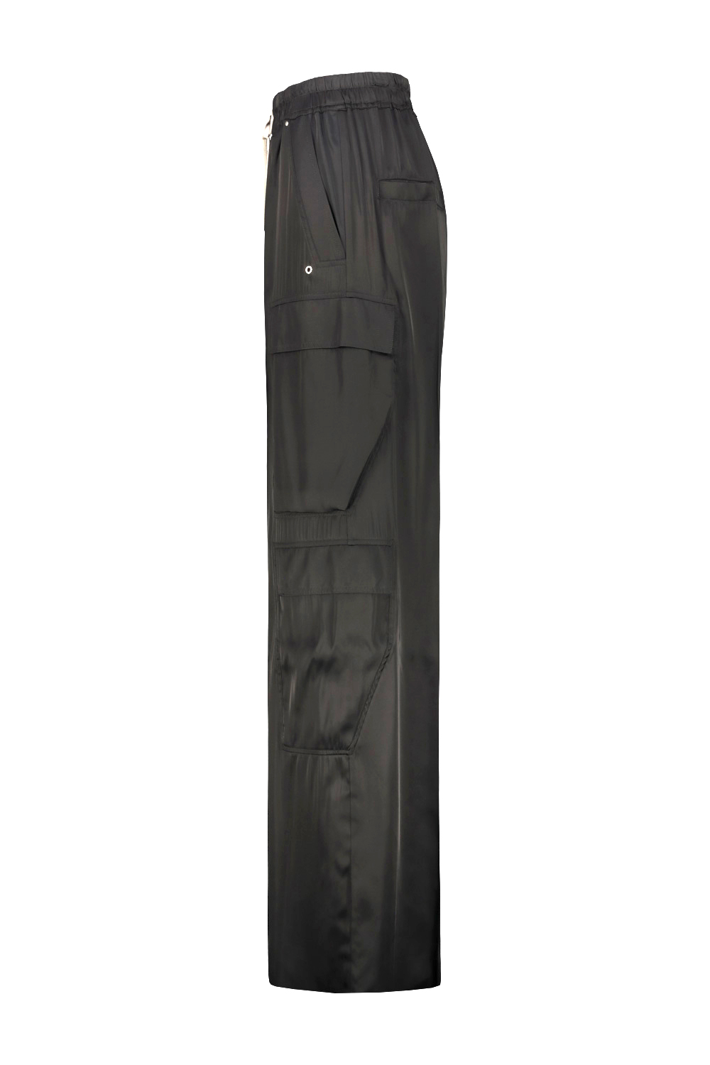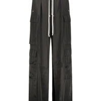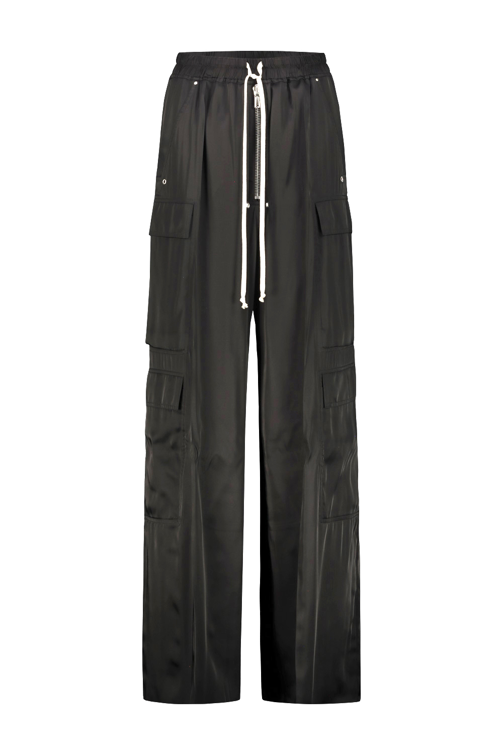 Rick Owens Cargobelas pants in acetate, full-length with a low crotch, wide leg, elasticized waistband with drawstrings, side welt pockets, four beveled cargo pockets on the side leg and two back rear welt pockets.
