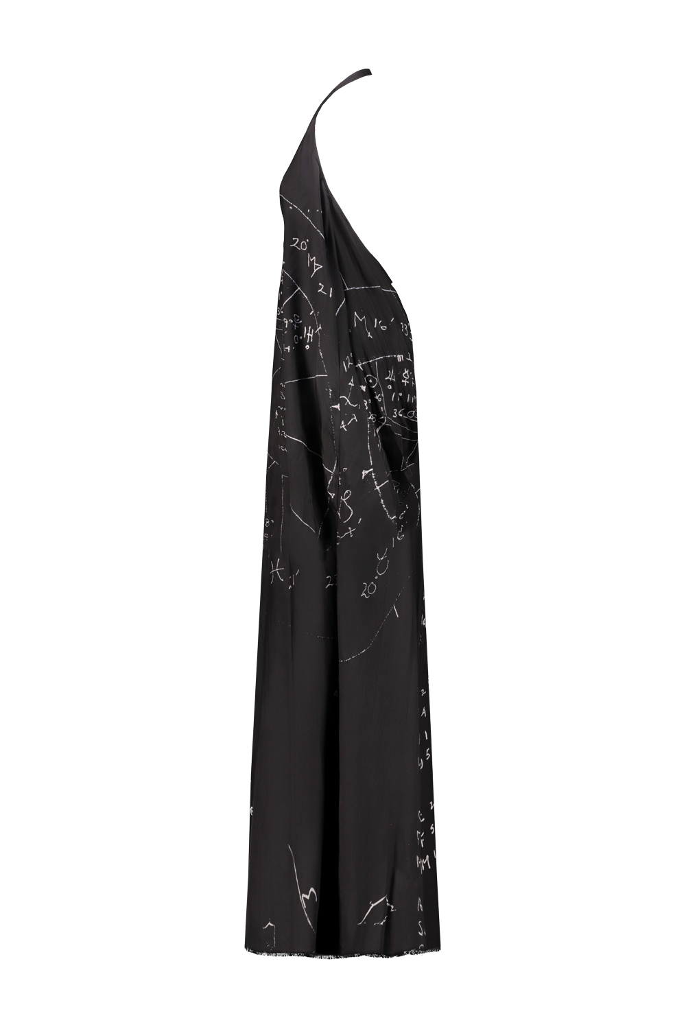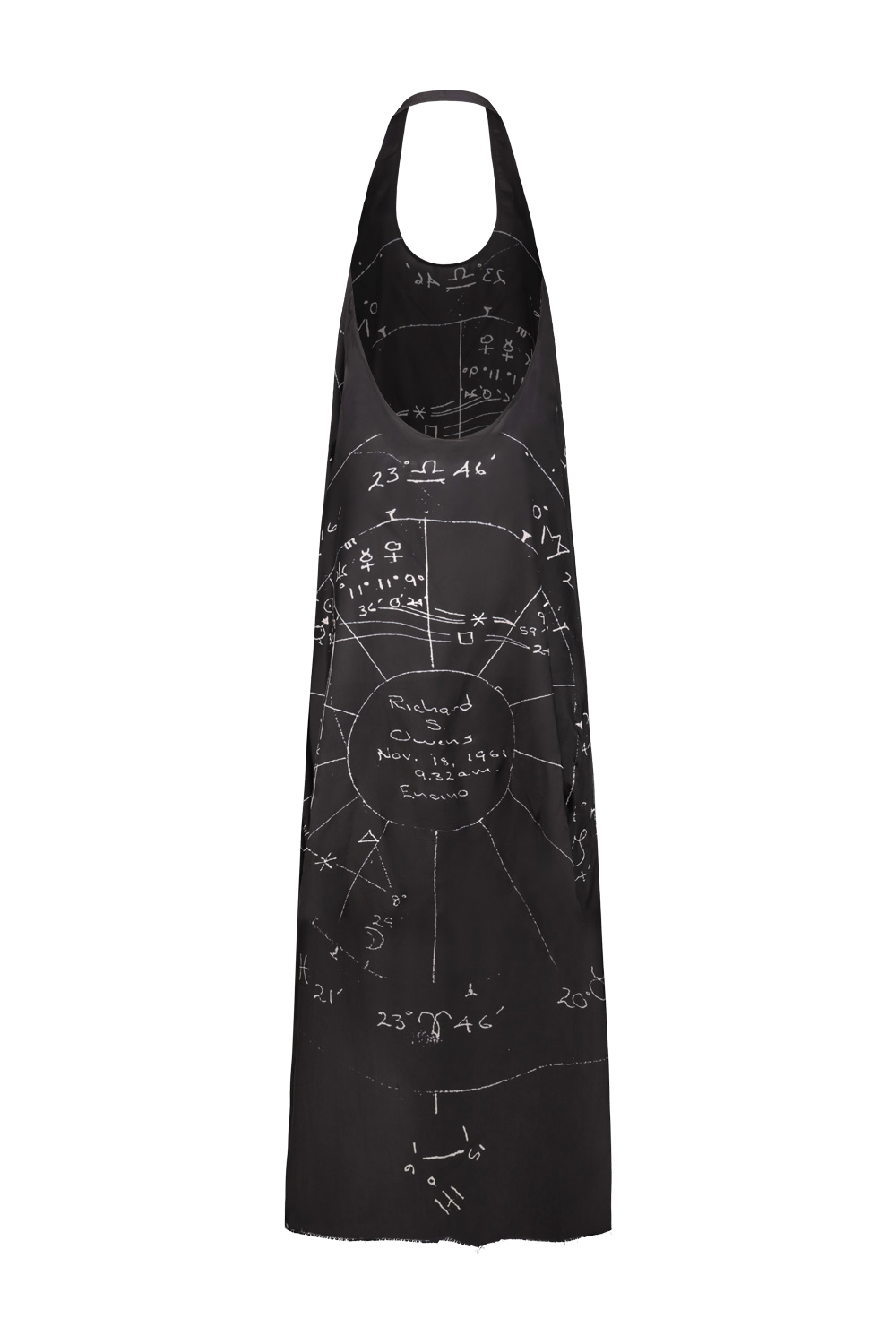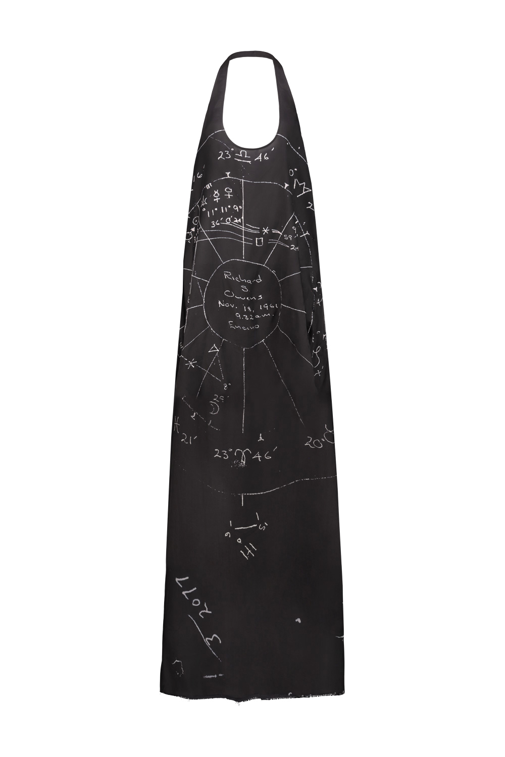Rick Owens haltar gown, deep halter neckline, two side pockets, features an exact copy of rick owens astrological birth chart, hand-drawn by his father John on the day of his birth in 1961.