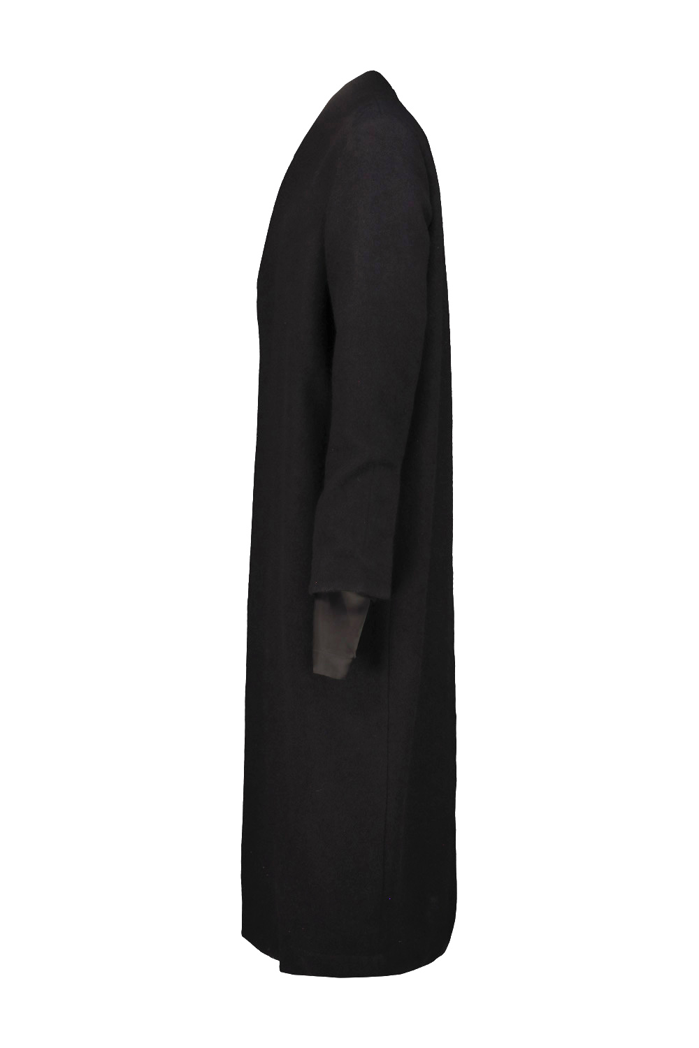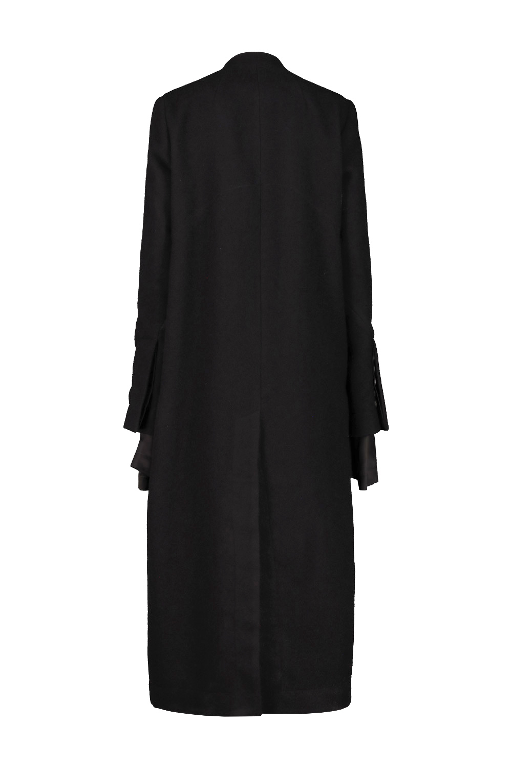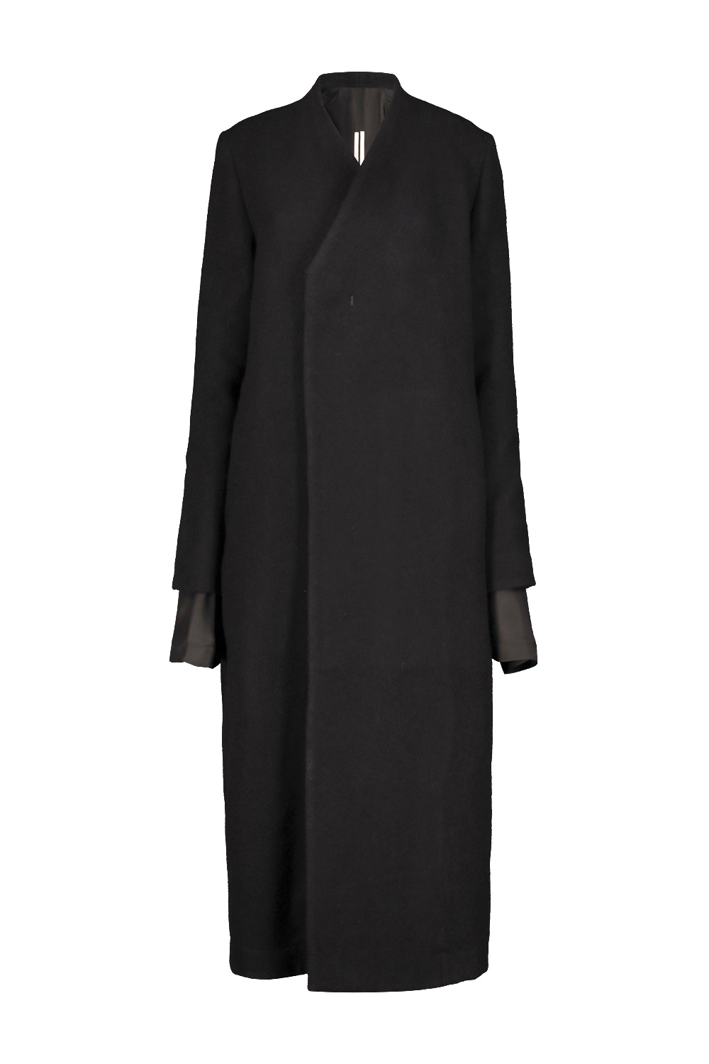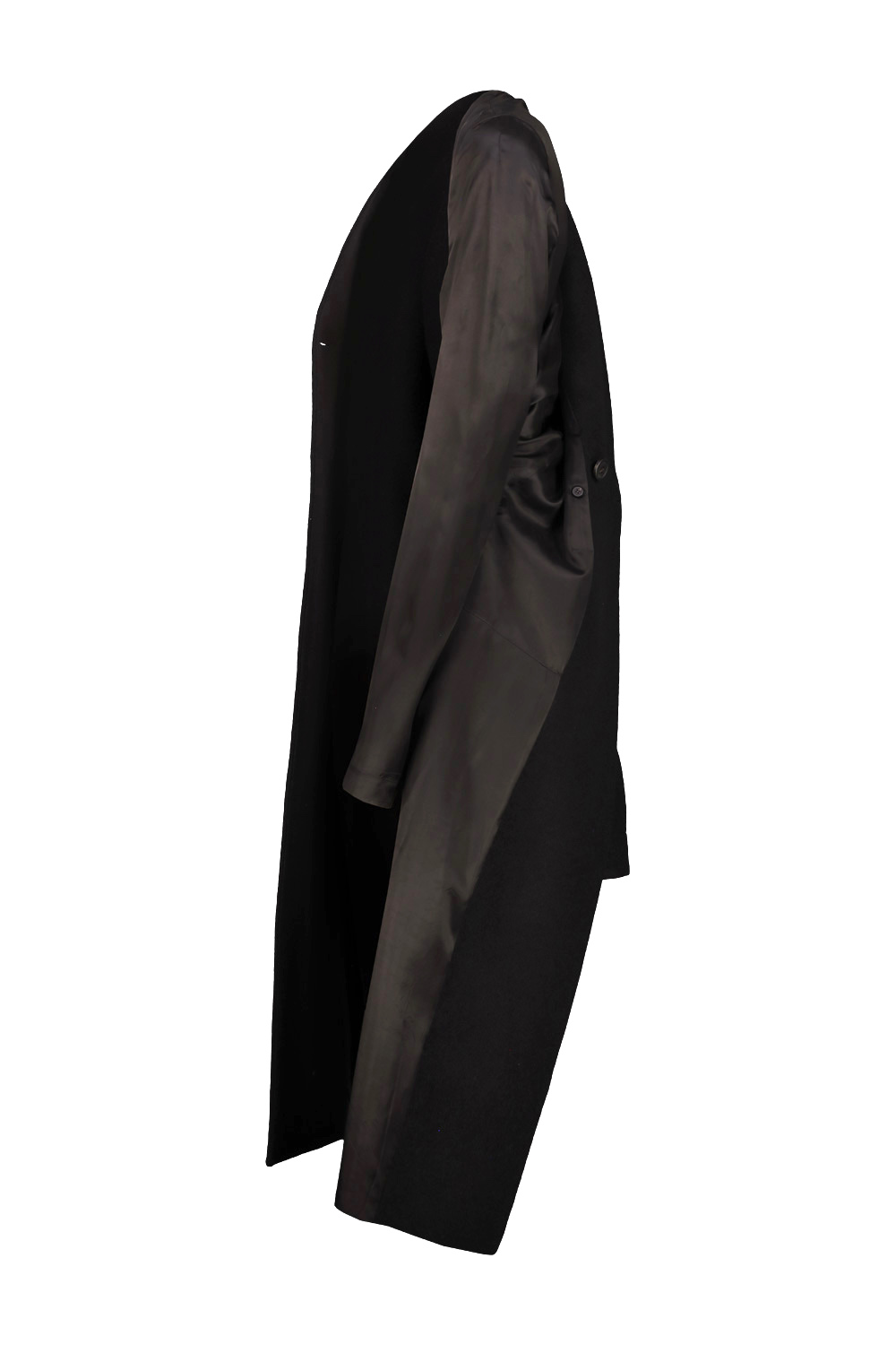 Rick Owens Museum wool coat with sleeve lining detail that extends from the wrist, the sleeve and shoulder lining is completely detached from the body of the coat and joined at the center of the back, double-breasted closure, deep slit at the center back.