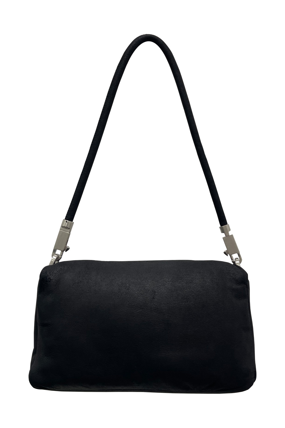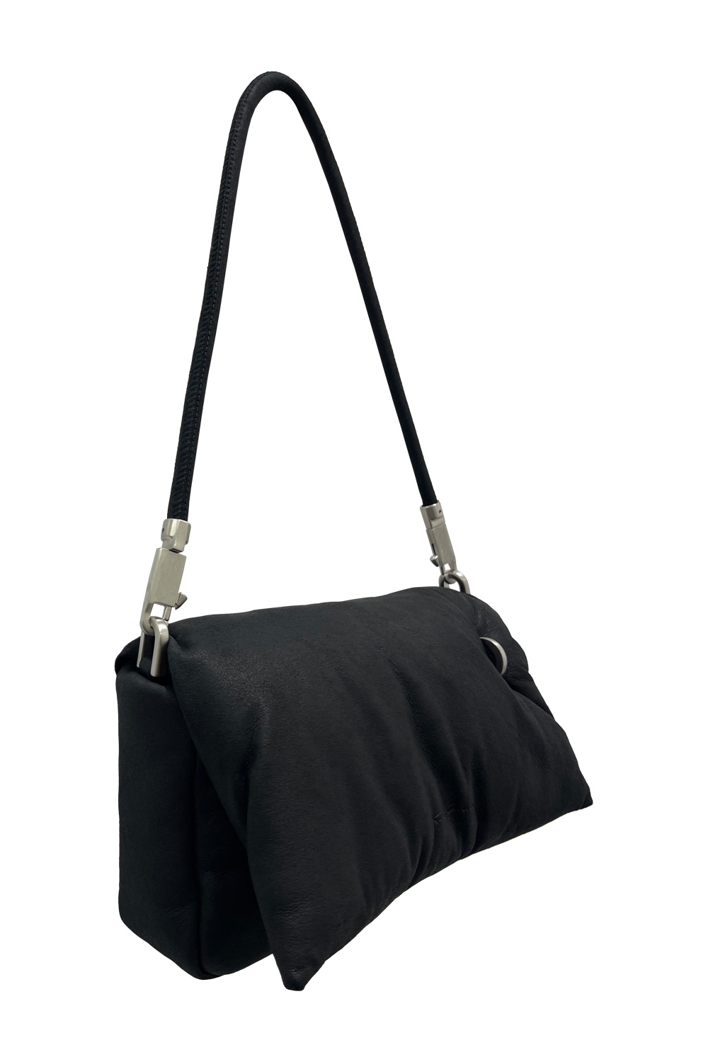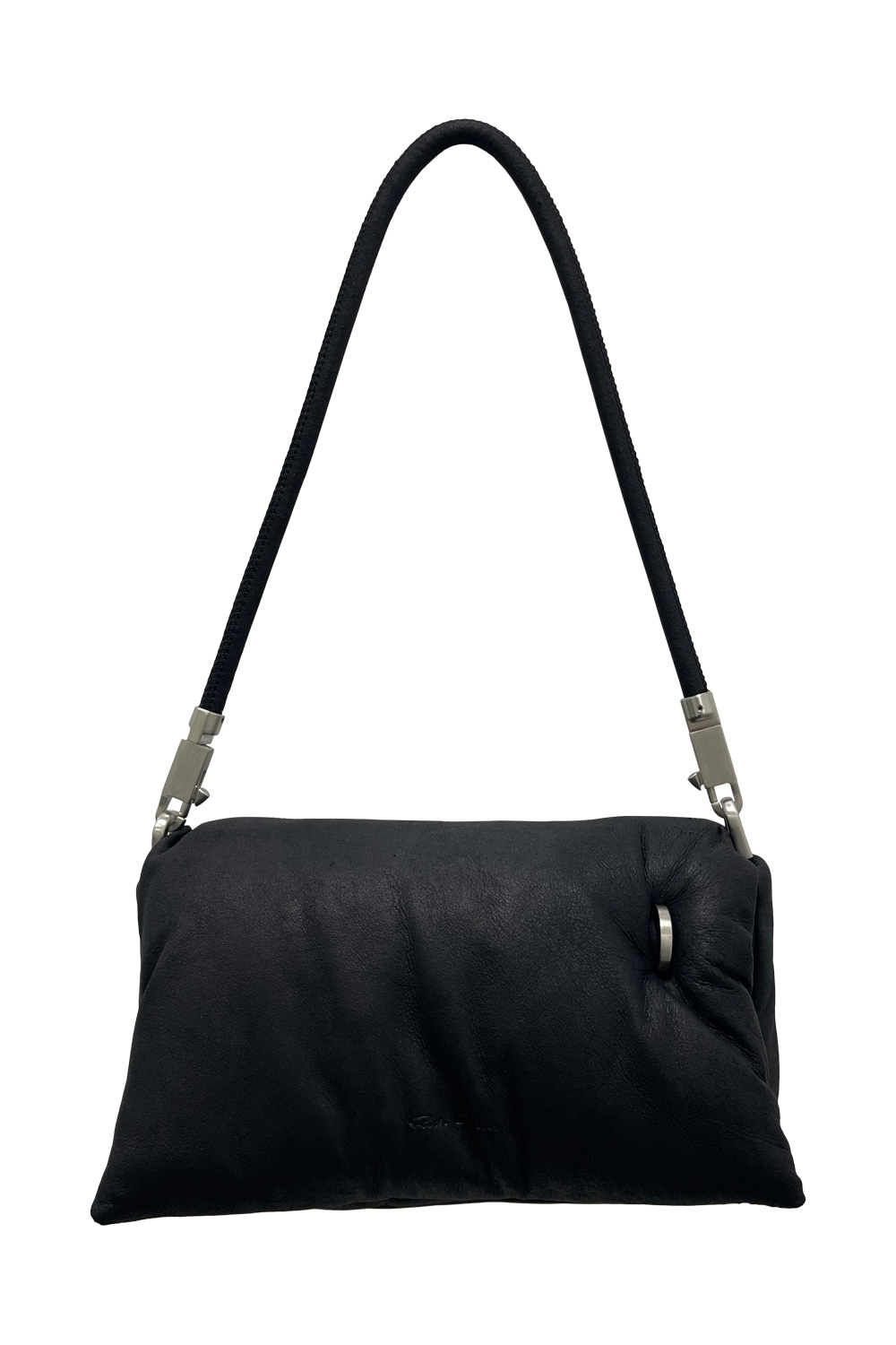 Rick Owens pillow griffin shoulder bag in soft patted black blister lamb leather, magnetic closure, inner pocket with nine card slot, leather padded strap with palladium brass snap hooks.