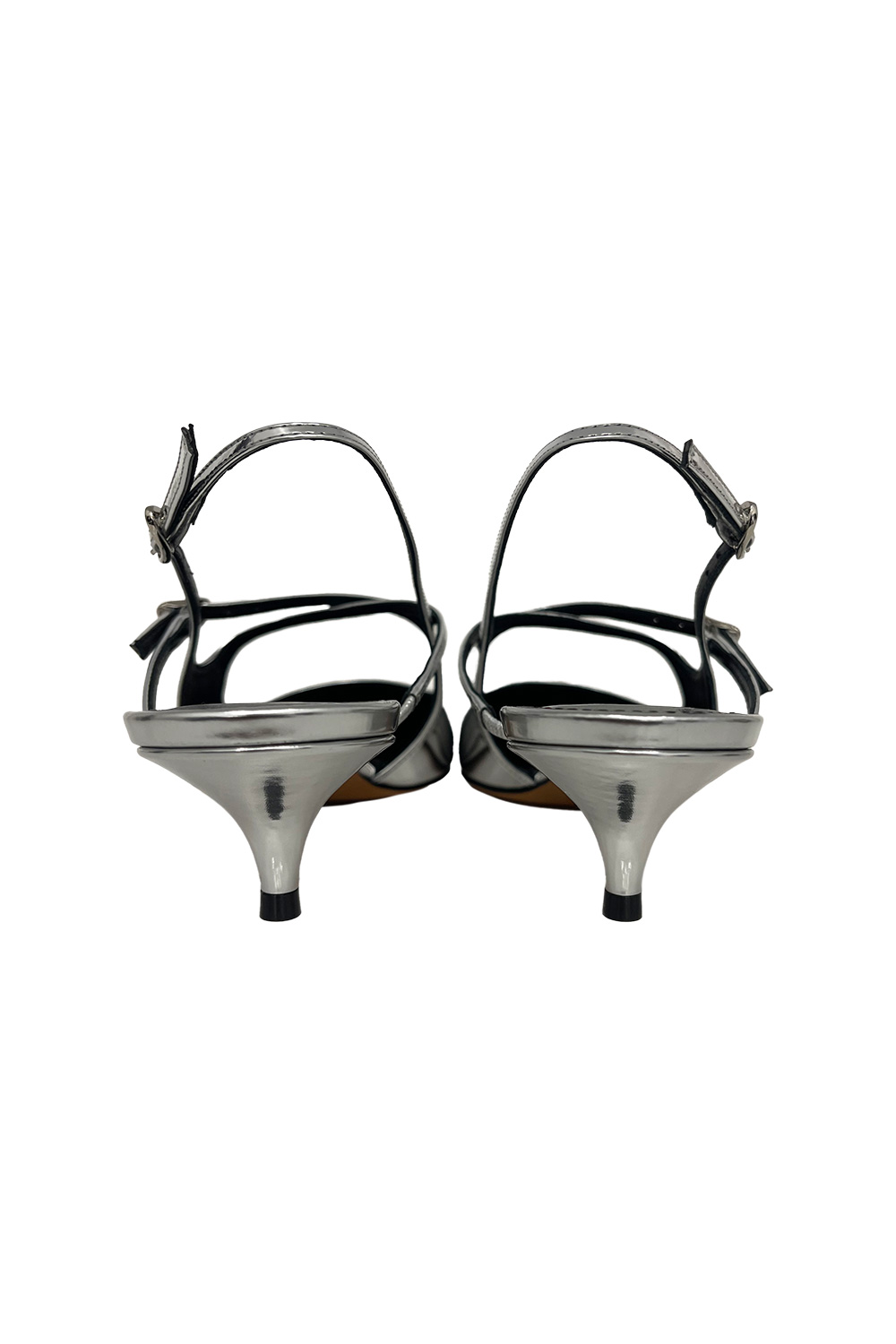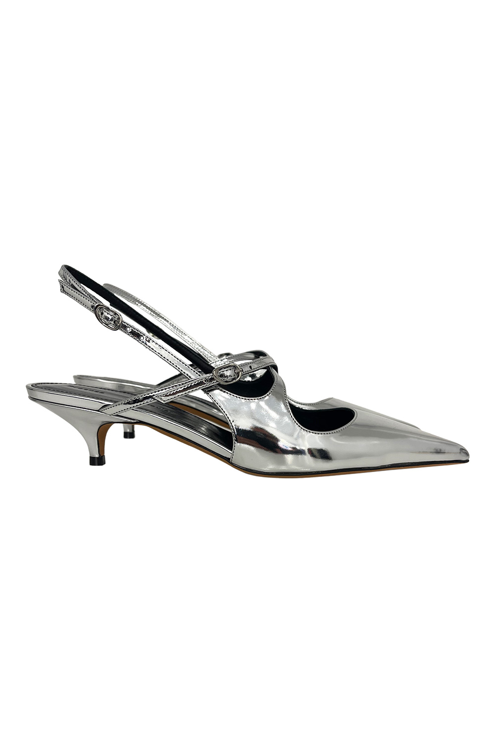 Proenza Schouler Slash Crossover Slingback Pumps, metallic finish, pointed toe and a 40mm kitten heel, crossover straps and adjustable silver-tone buckles.