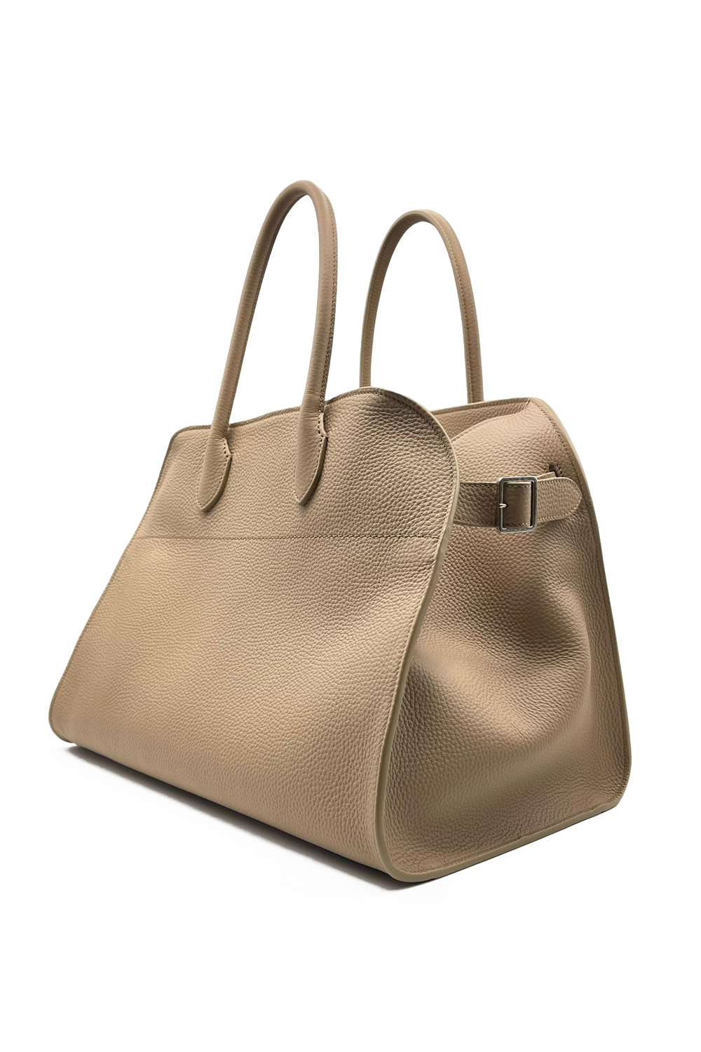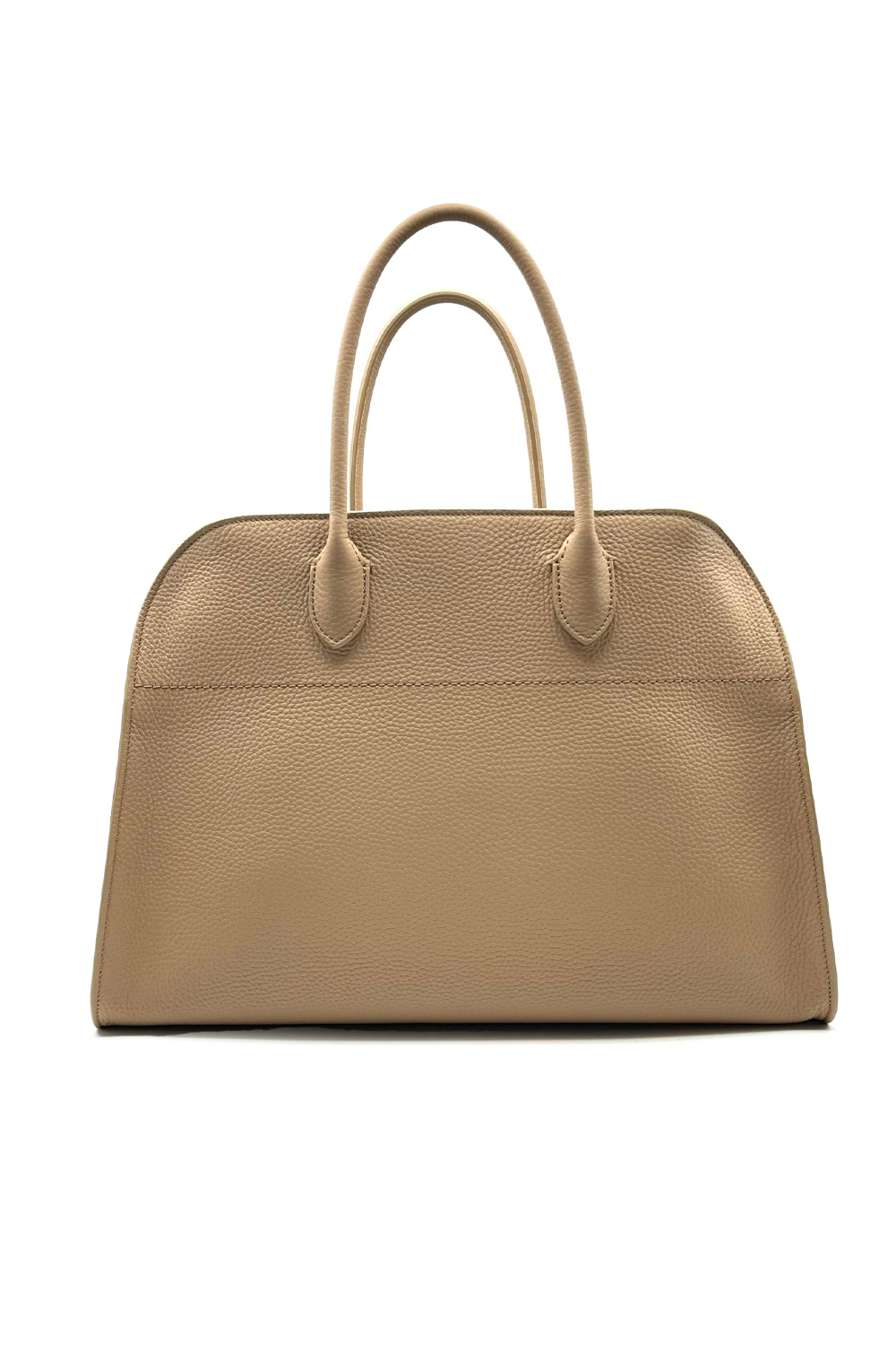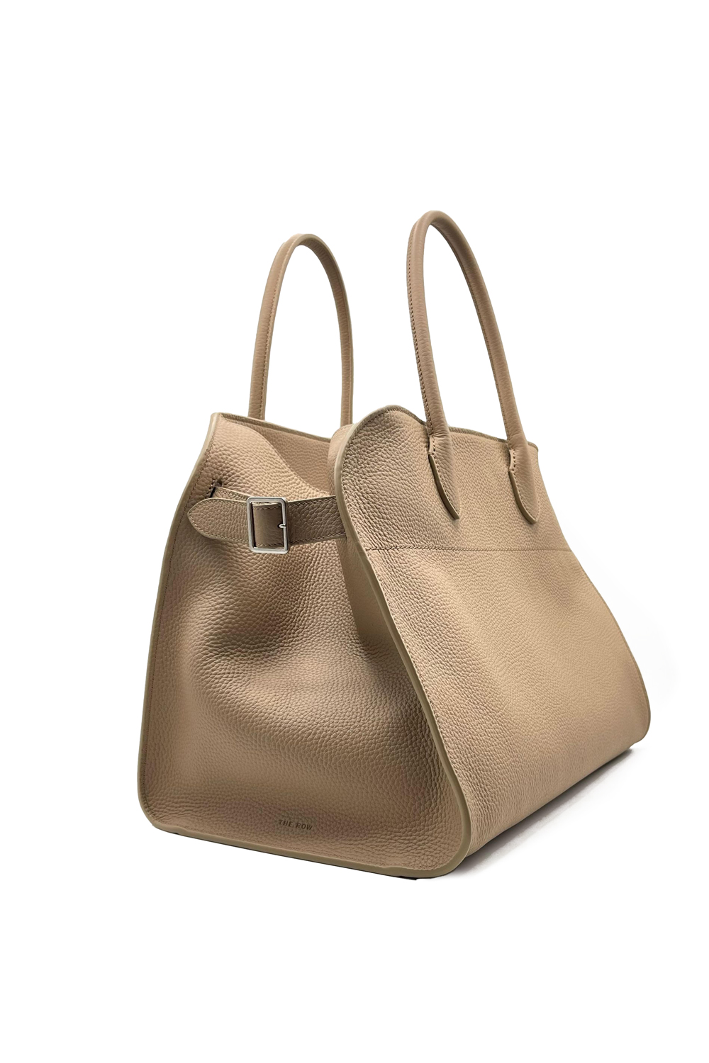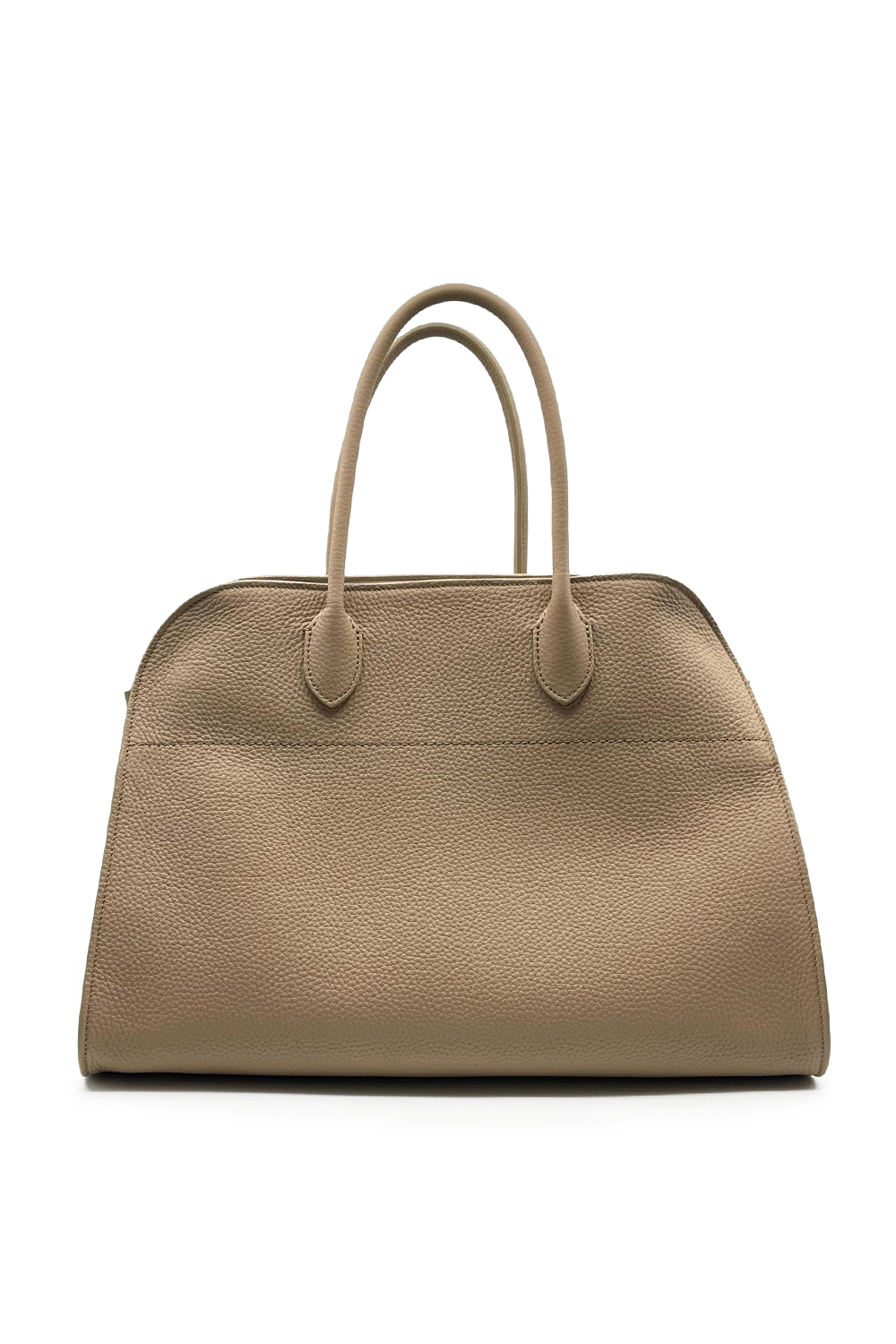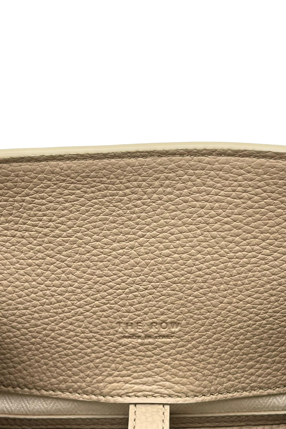 The Row soft Margaux 15 in dark taupe grained matte calfskin leather with belted gusseted side panels and interior toggle closure, 2 interior card slots, 1 zip pocket.
