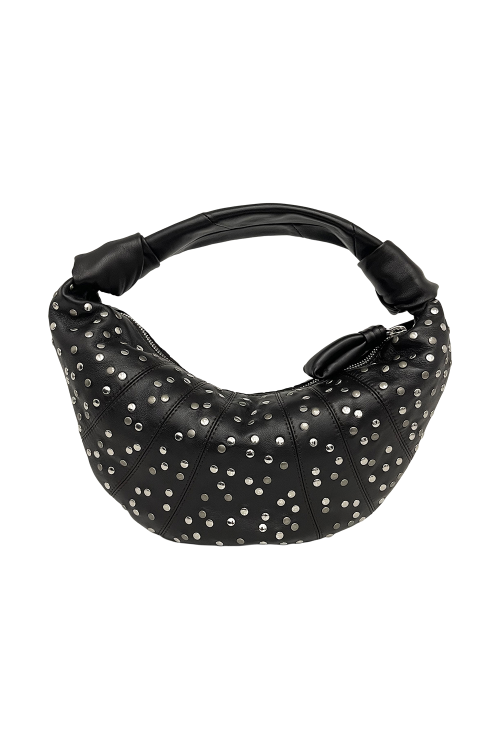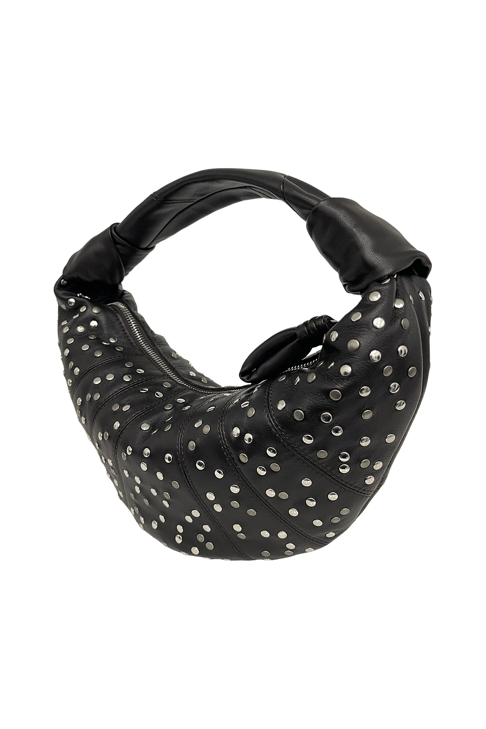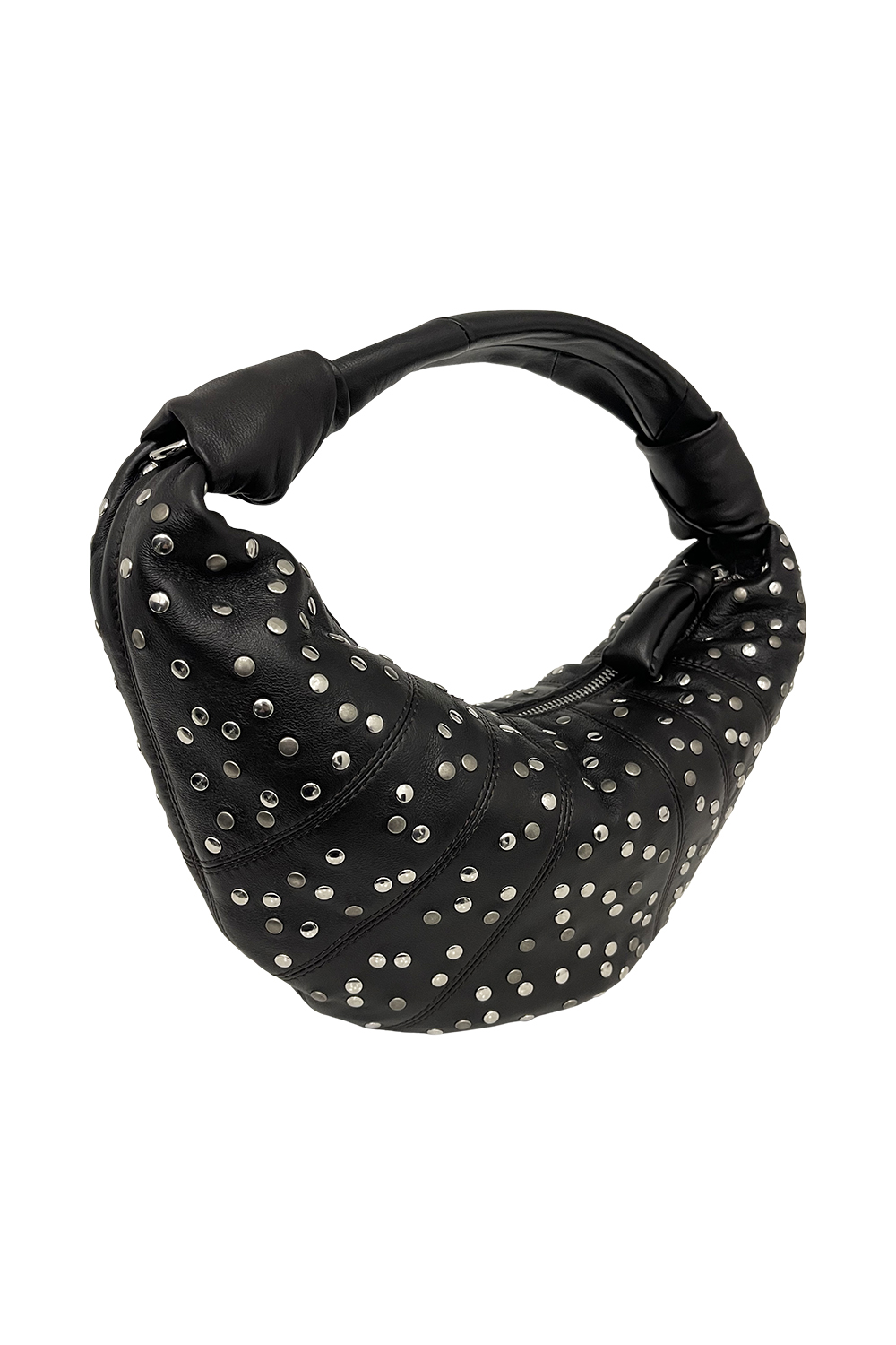 Lemaire mini Fortune croissant bag in dark chocolate nappa leather with studs, side knot finishing of the strap, zip closure.