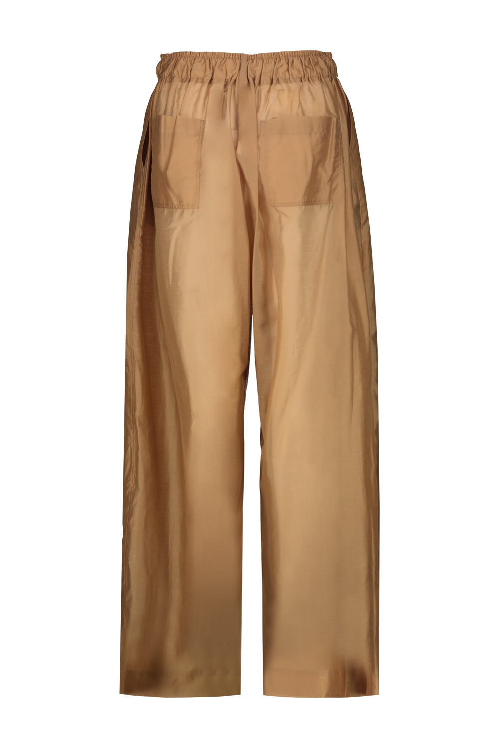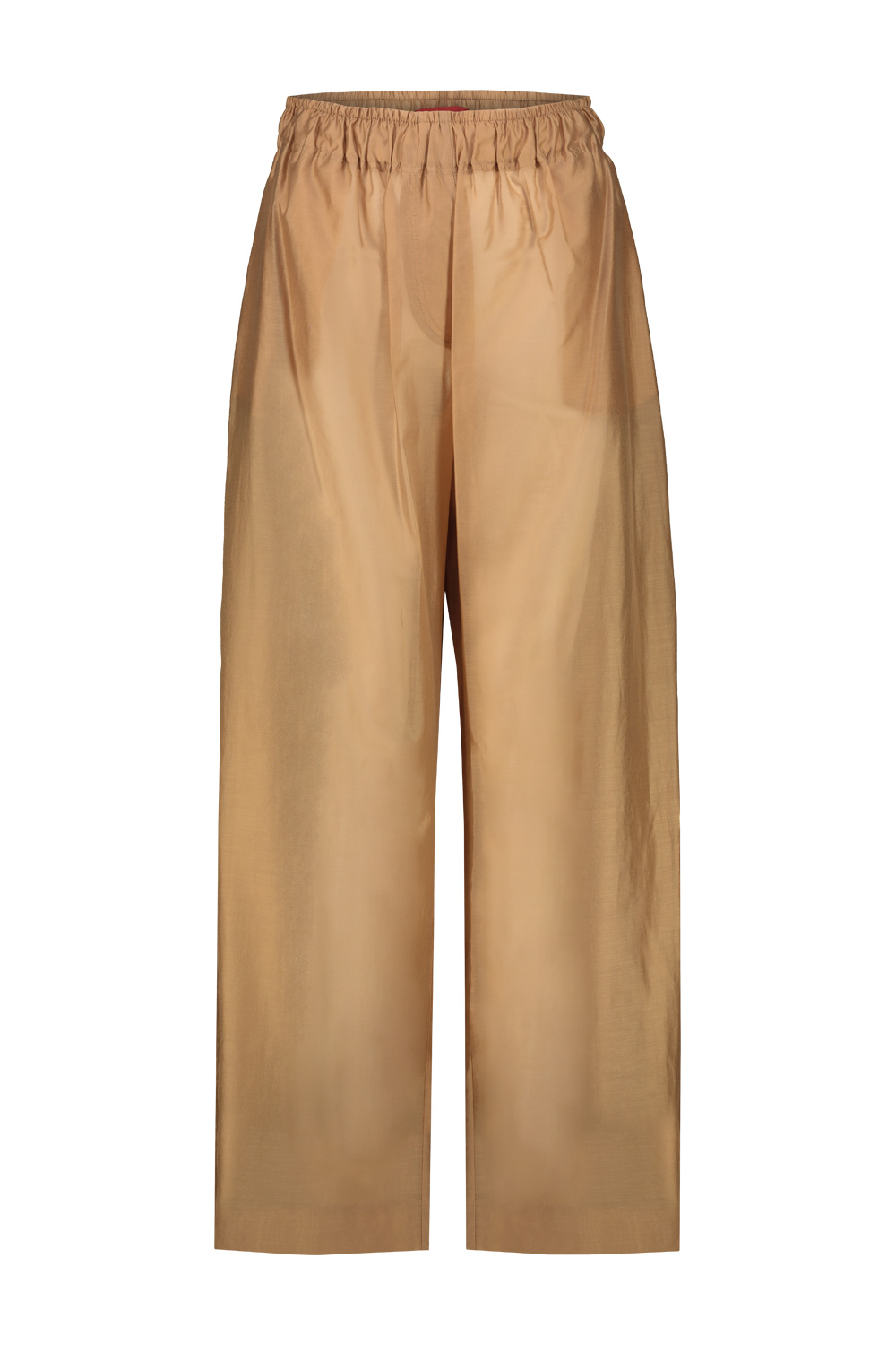 The Latest Dora pant in lightweight muslin, wide leg, elasticated waistband, two side pockets, two patch pockets on the back.