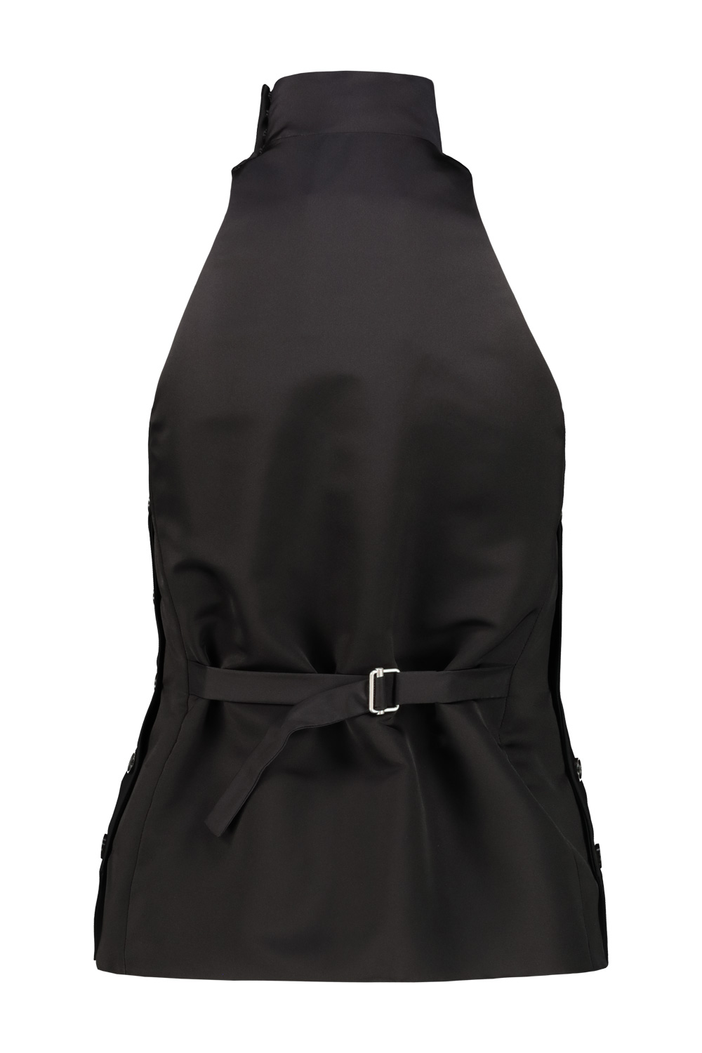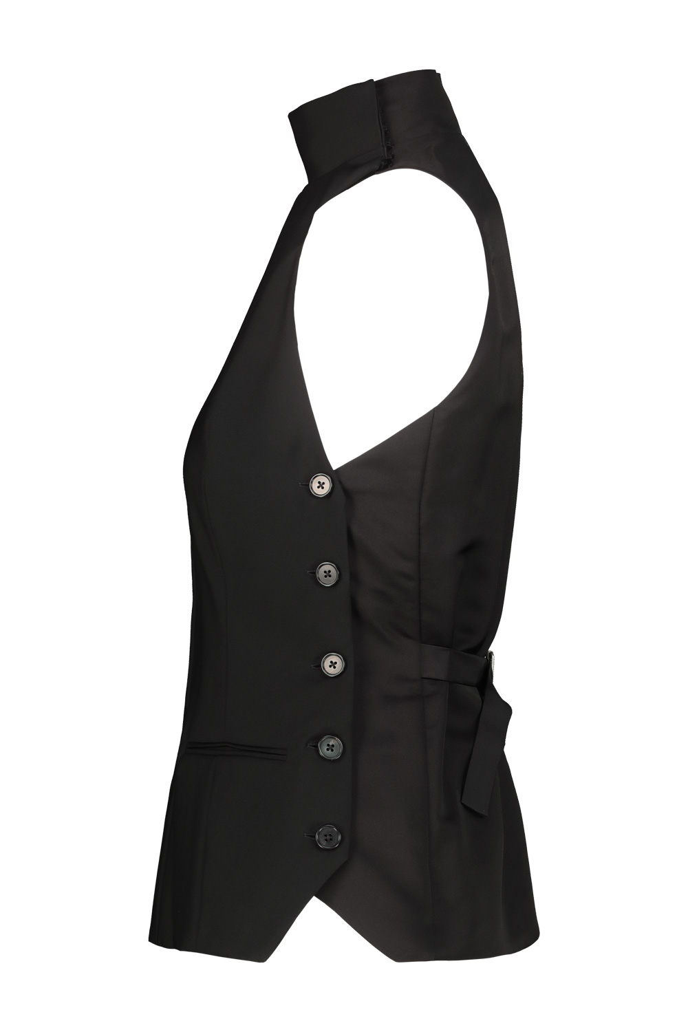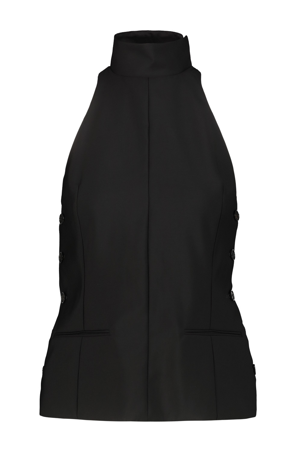 The Row Corine top in virgin wool, high neck with hidden hook closure, front besom pockets, adjustable buckled strap at back waist, side button closures.