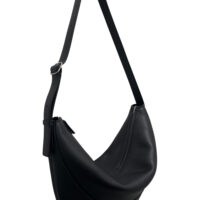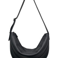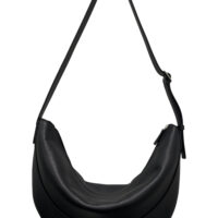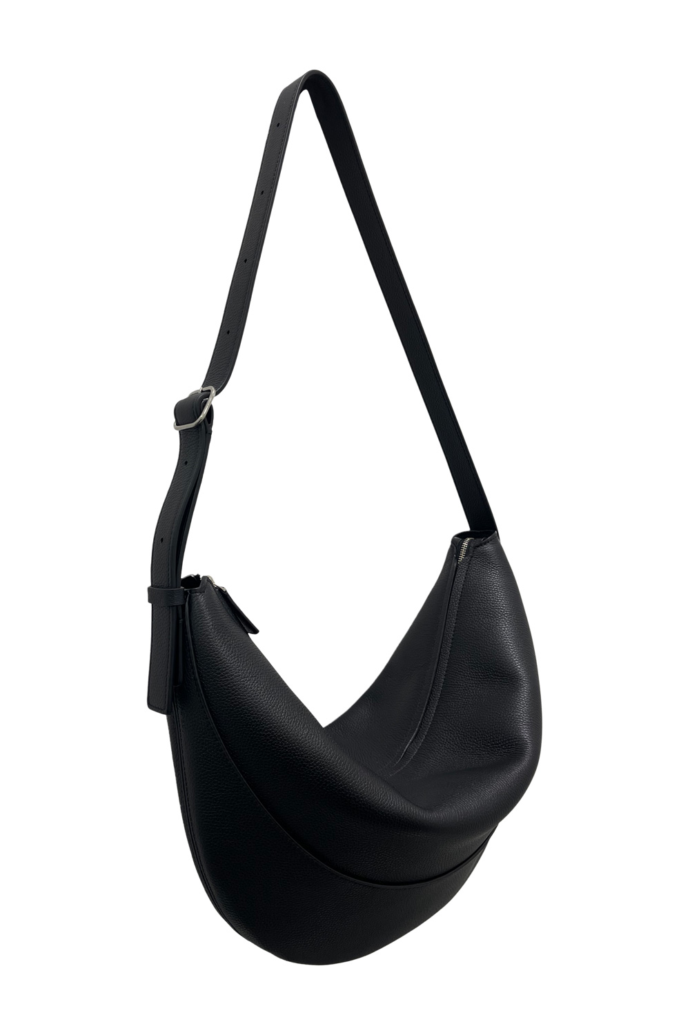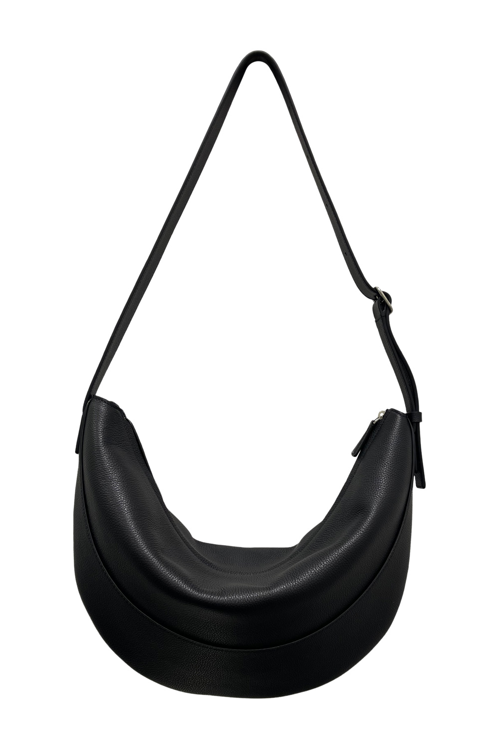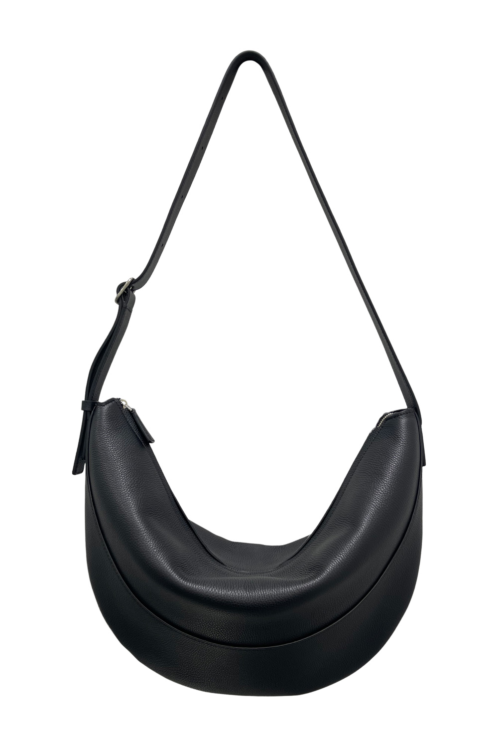 The Row Jouve Crescent-shaped crossbody bag in smooth lightweight nappa leather with zipper closure and adjustable strap with metal buckle.