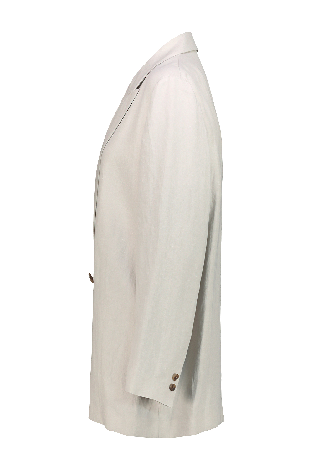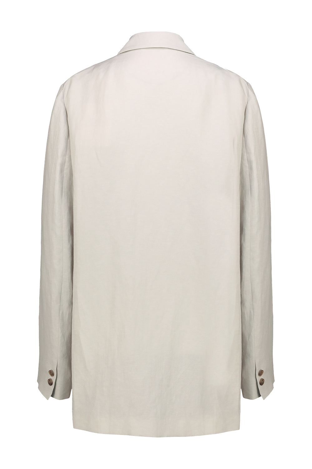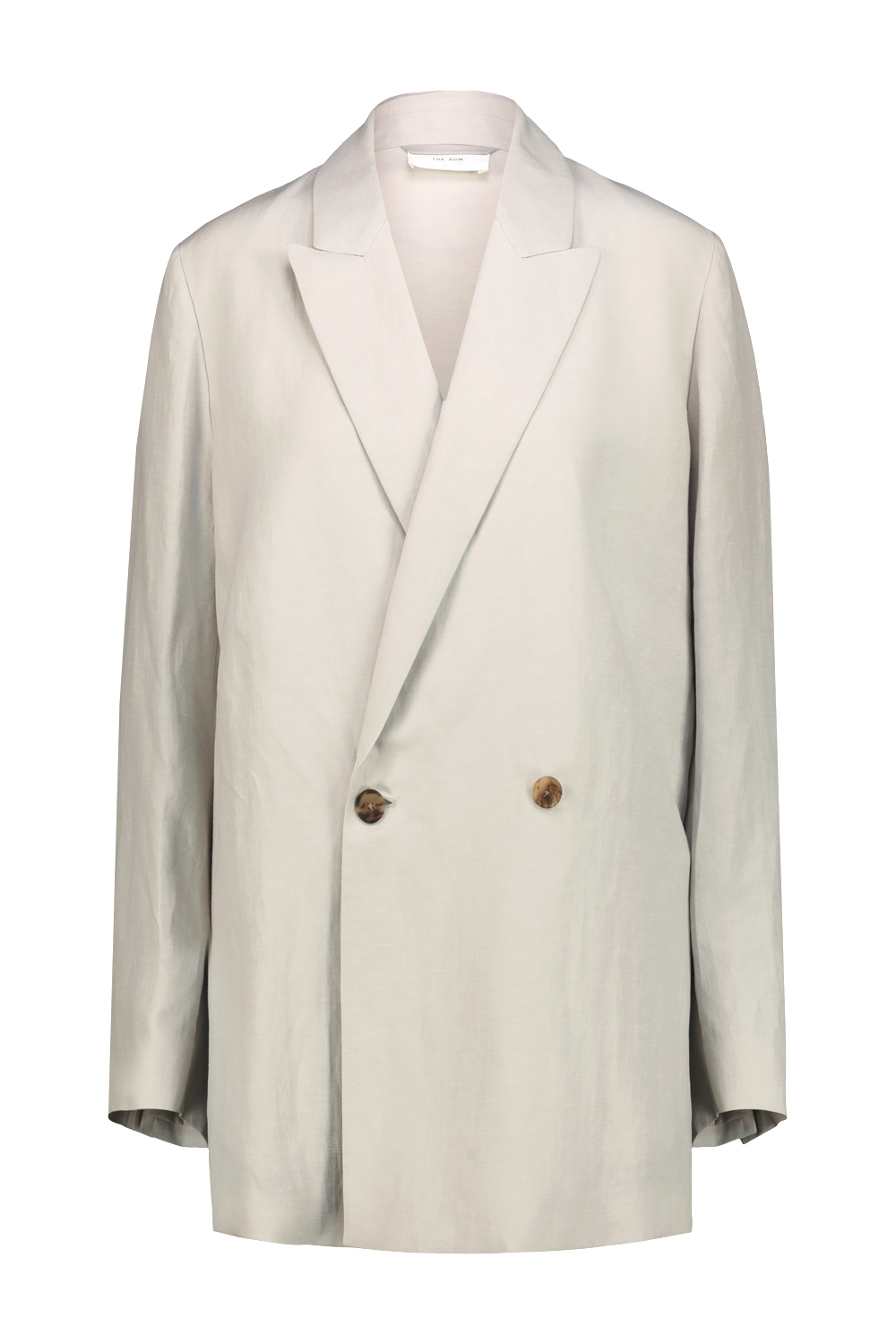 The Row Nat double-breasted jacket in woven silk and linen with peaked lapels, oversize fit, side seam pockets, and double horn button closure.