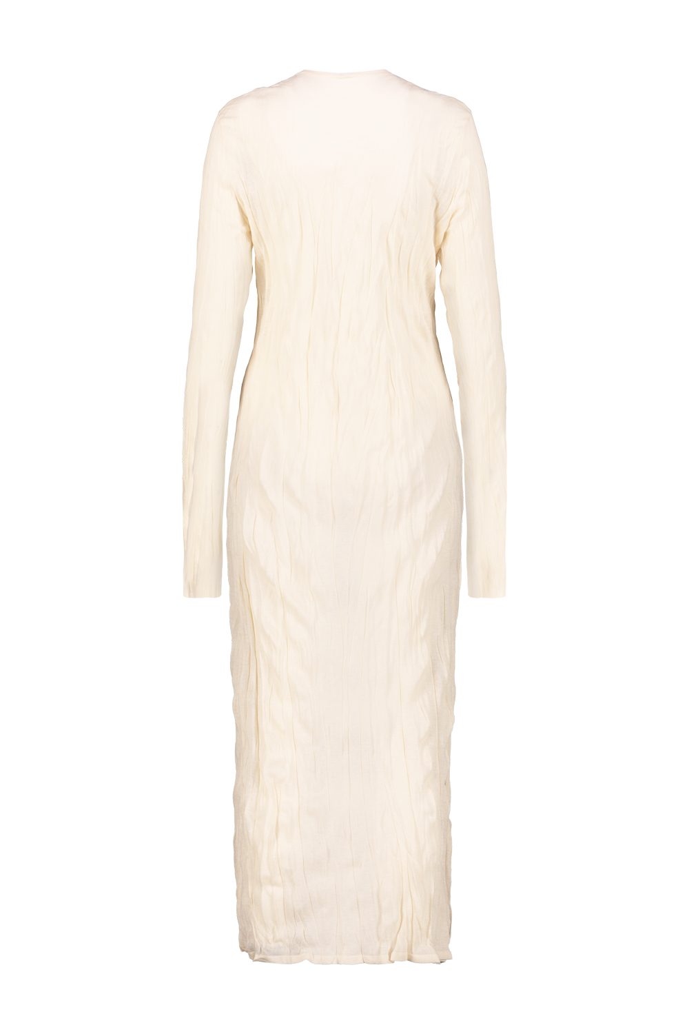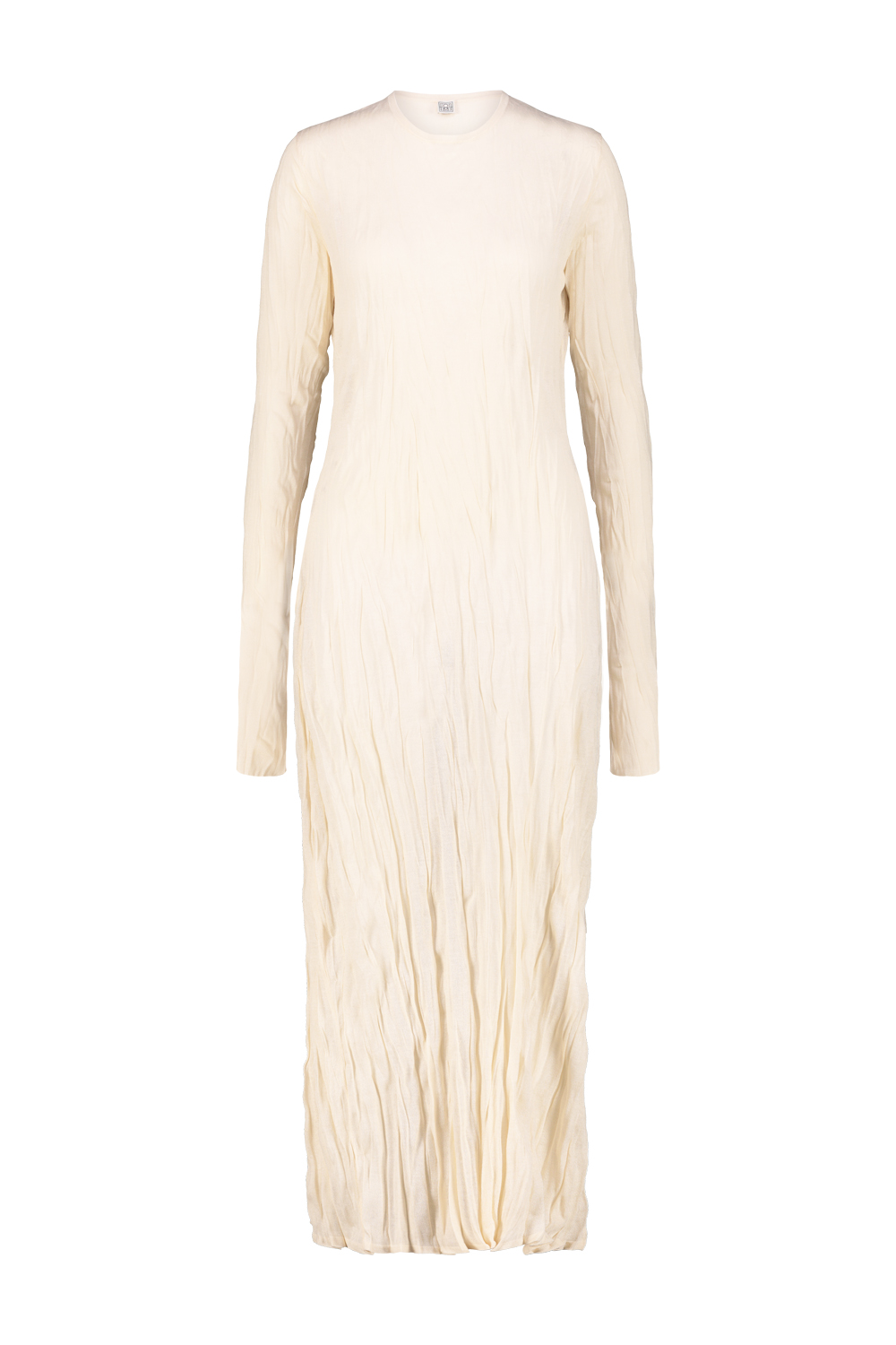 Toteme column dress with long sleeves in crinkled viscose knit, rounded neckline.