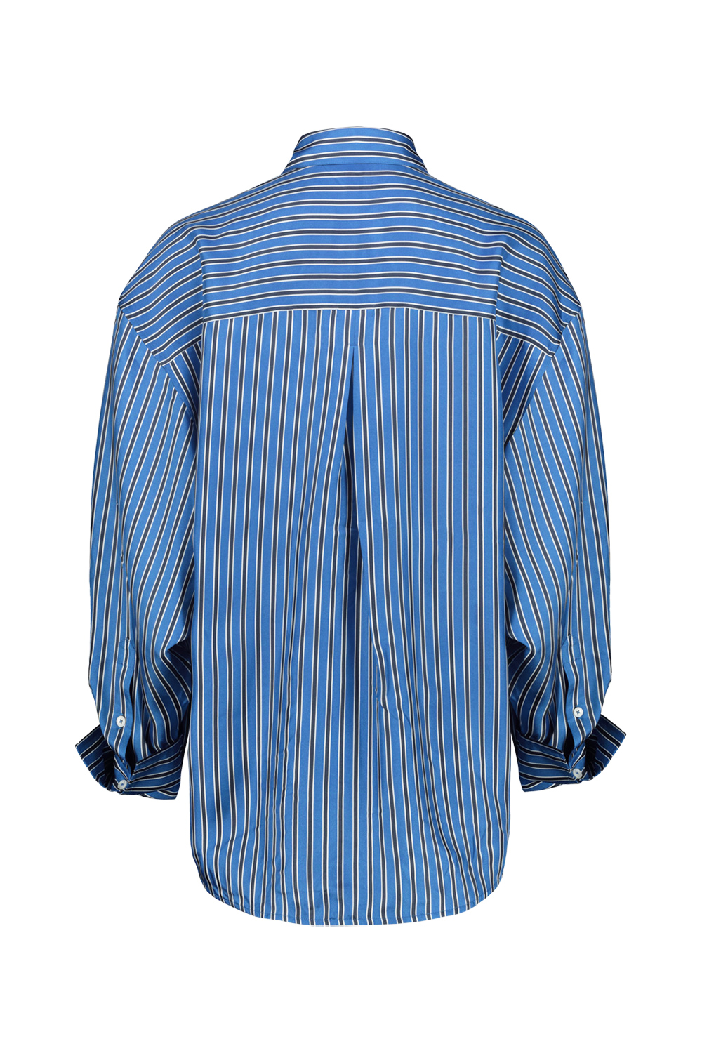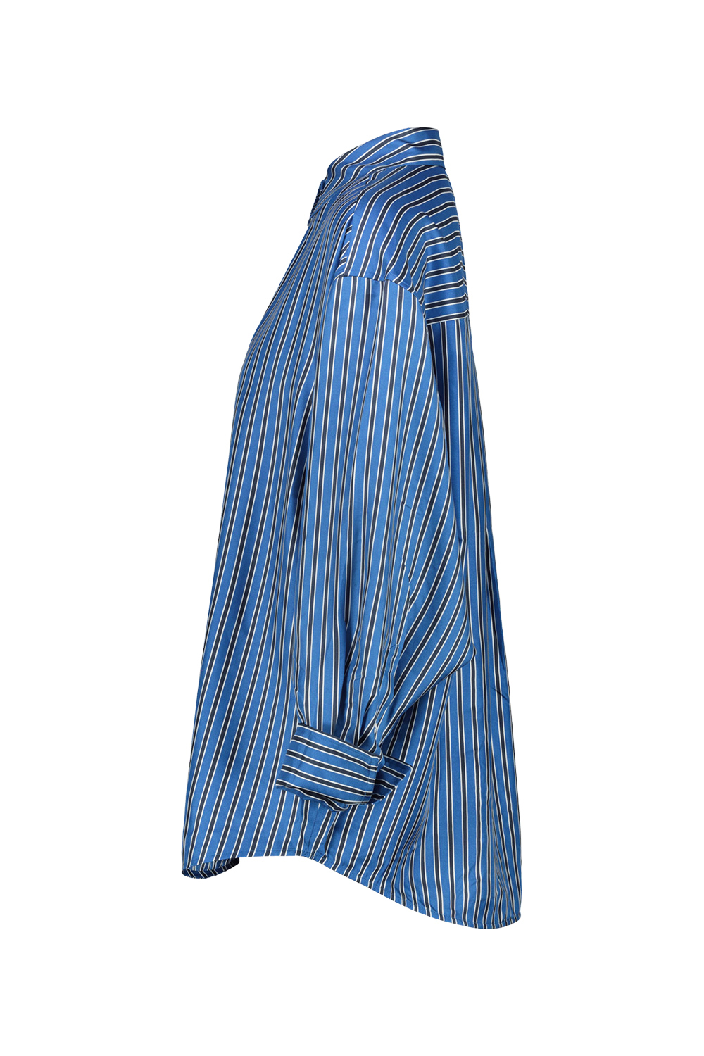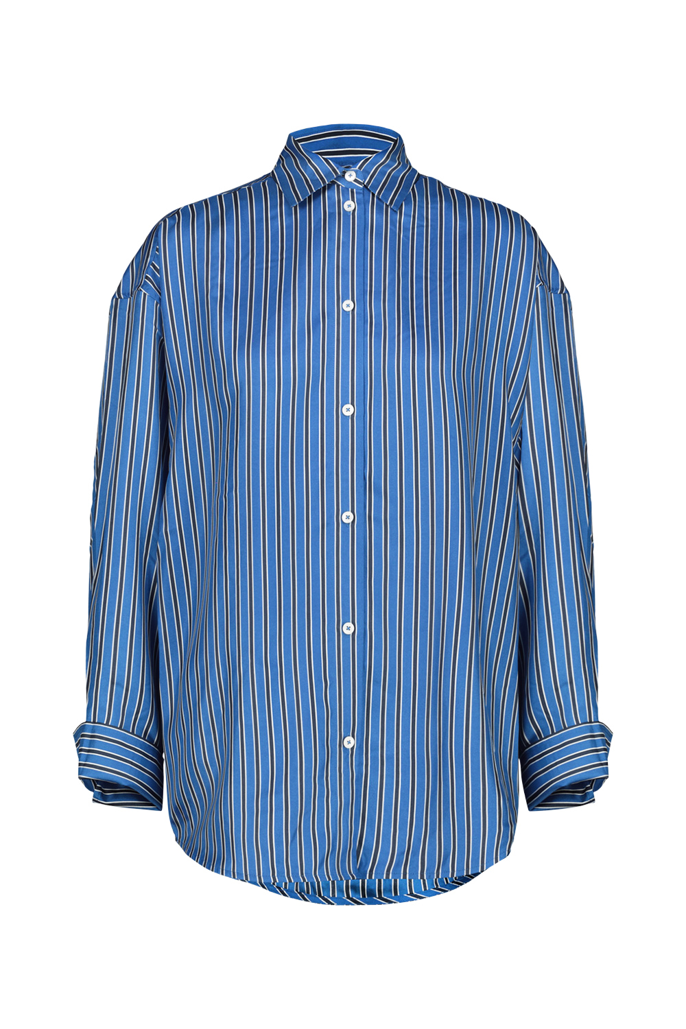 Toteme oversized silk shirt with blue and black striped print on a white background. GTIN code: 261 WRT0700 FB0553 340