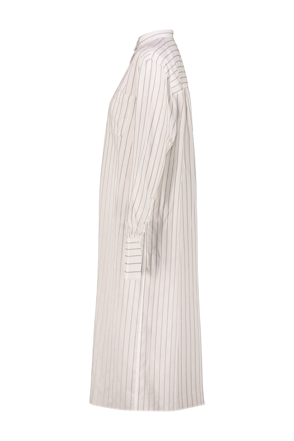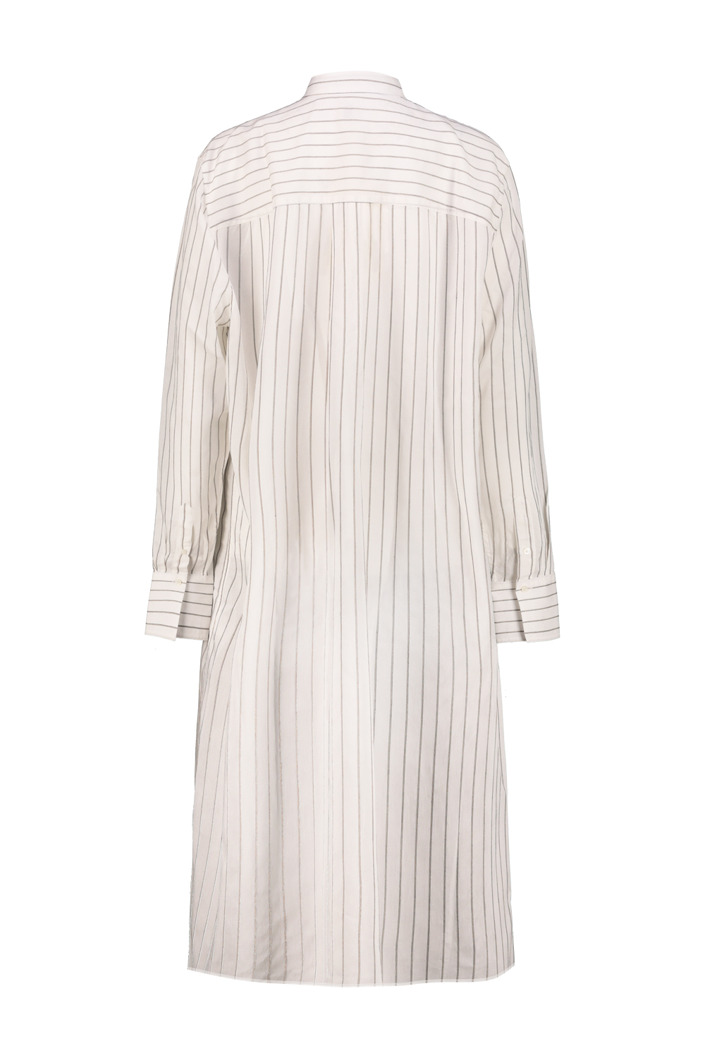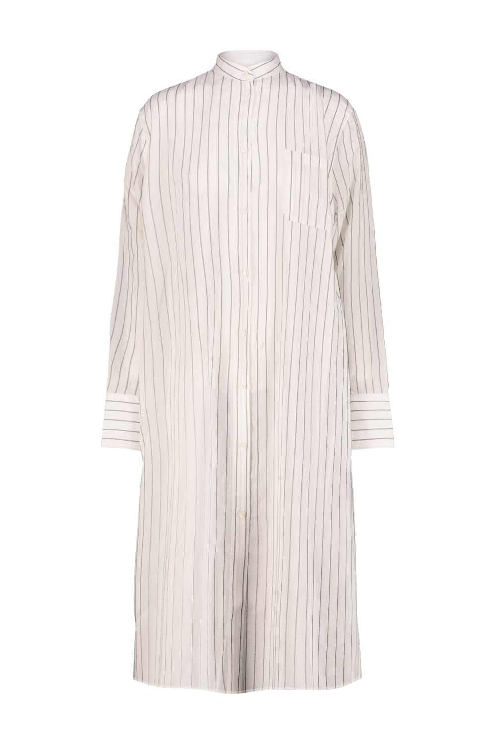 Toteme striped summer tunic in extra-light fluid viscose and silk blend, black and oyster-white stripes, chest pocket, buttoned placket and cuffs.